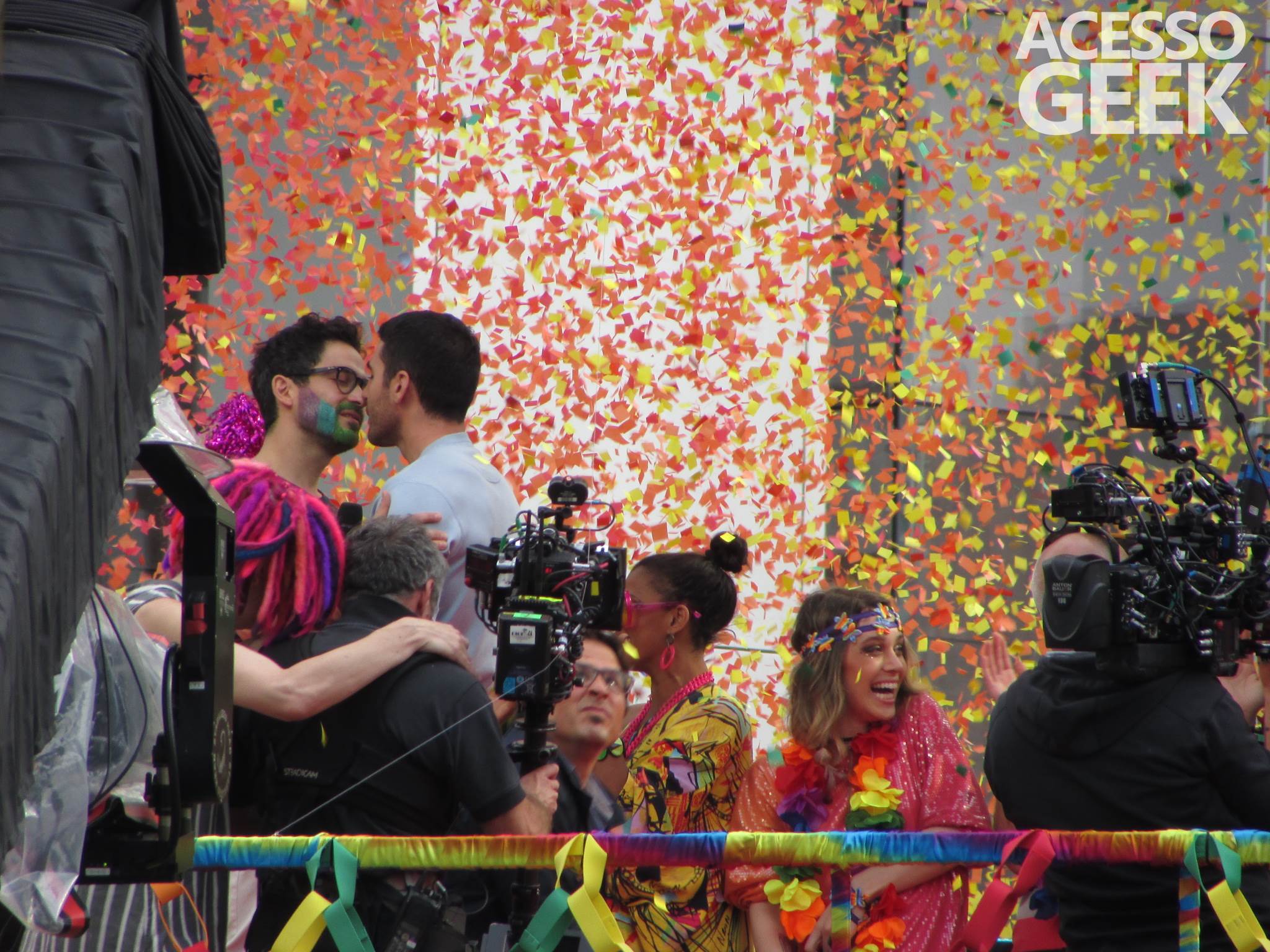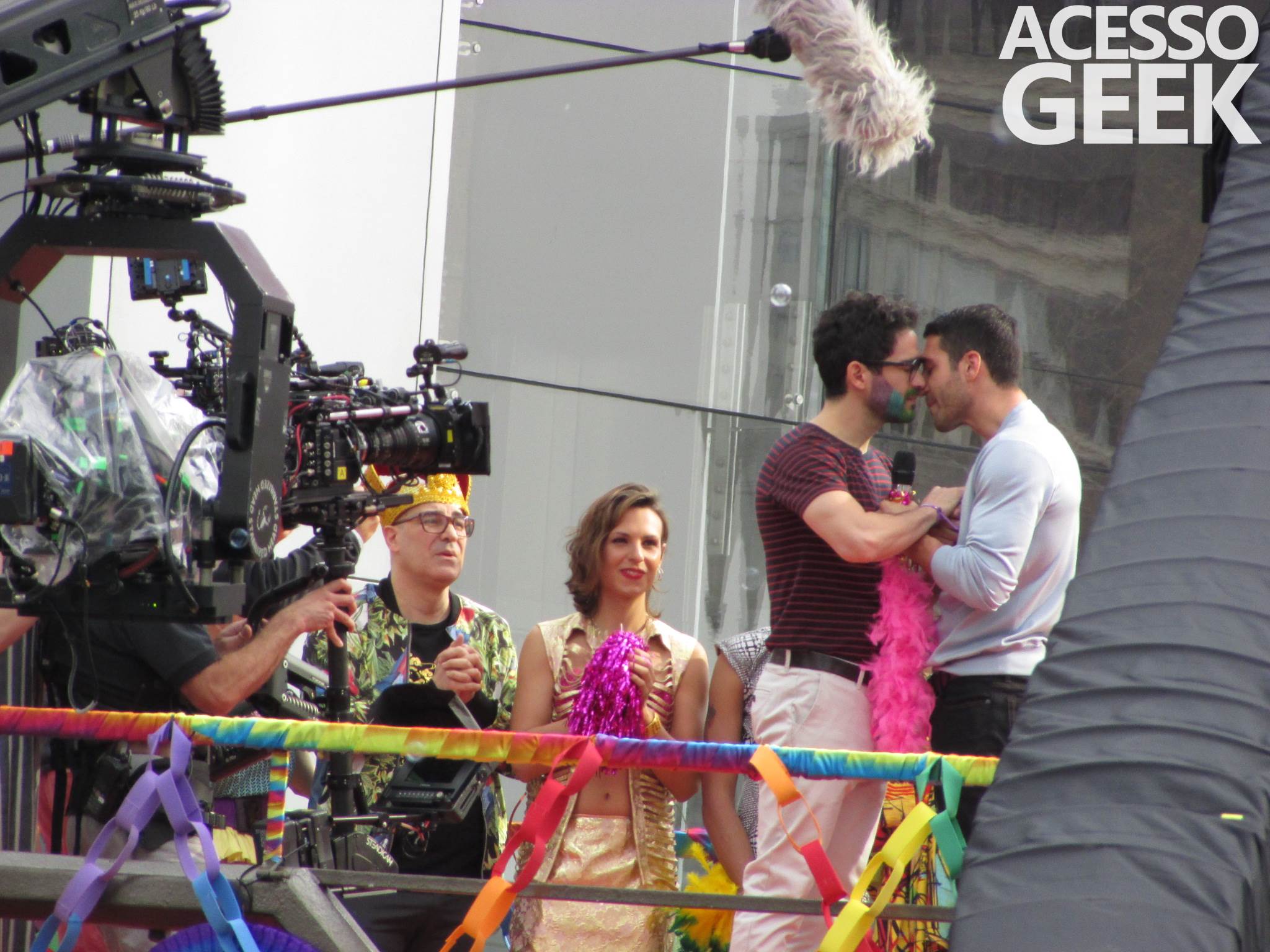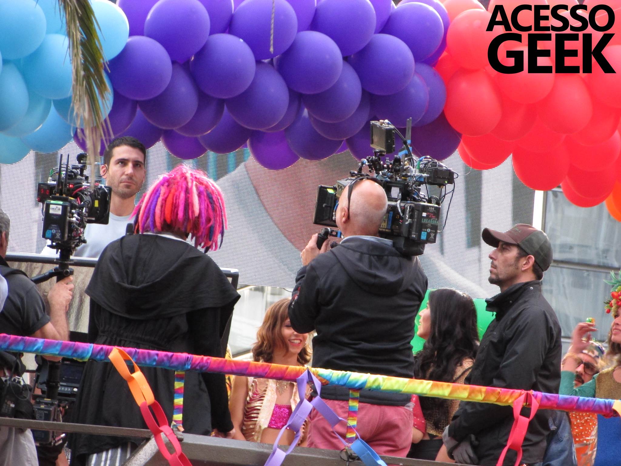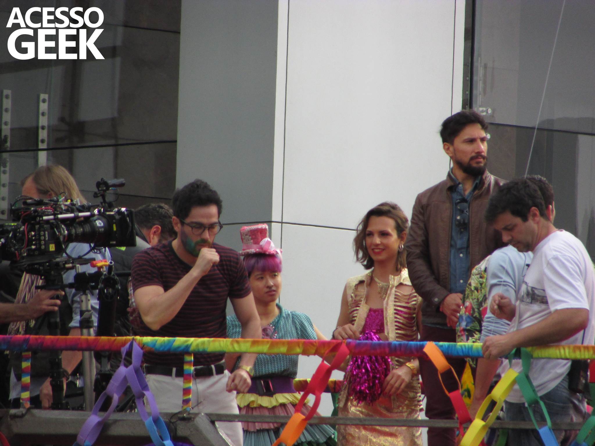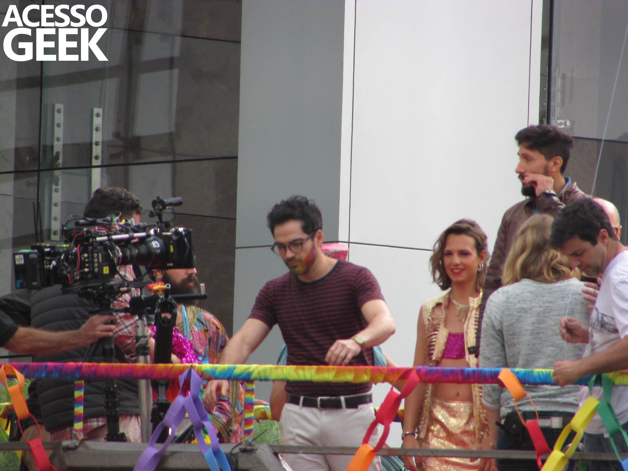We had the opportunity to follow the recordings that happened last Saturday (28), at Avenida Chucri Zaidan, in São Paulo, more precisely next to the Shopping Morumbi. The producers of the serie, in association with O2 Filmes, mounted a “Trio Elétrico” (Trio Elétrico is the name given to a truck equipped with an extremely high powerful sound system and a musical group or some famous people and music on top of it), it was full of colorful balloons, representing the Gay Pride Parade, that happened on Sunday (28), at Paulista Avenue. Which was also the location of the recordings, as an extension of the recorded scene on Saturday.