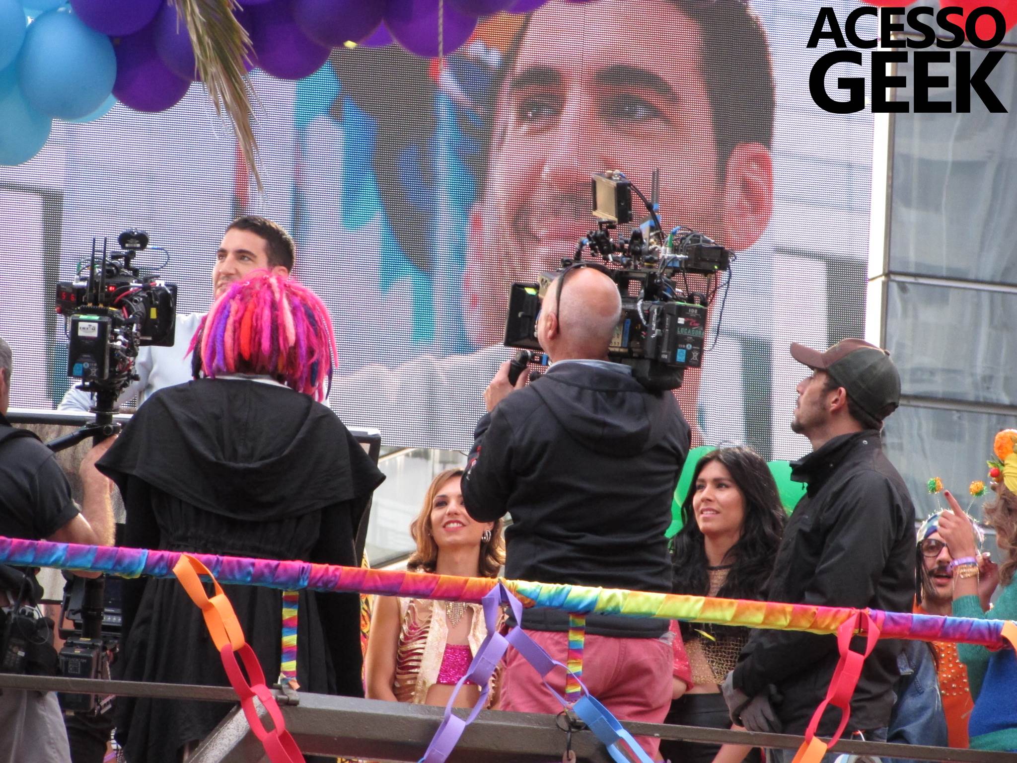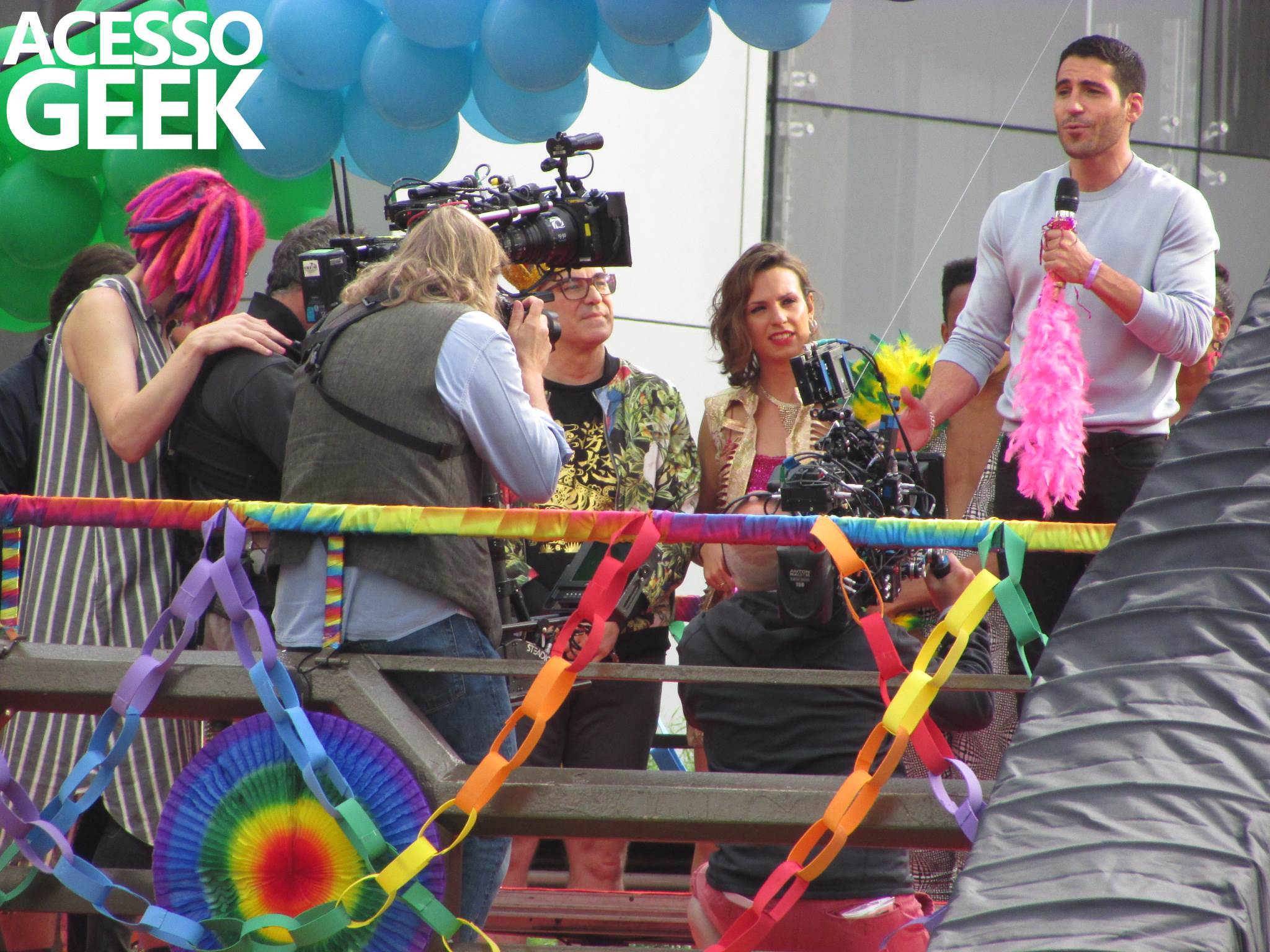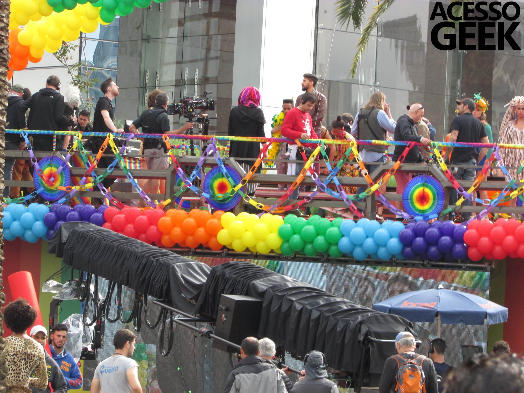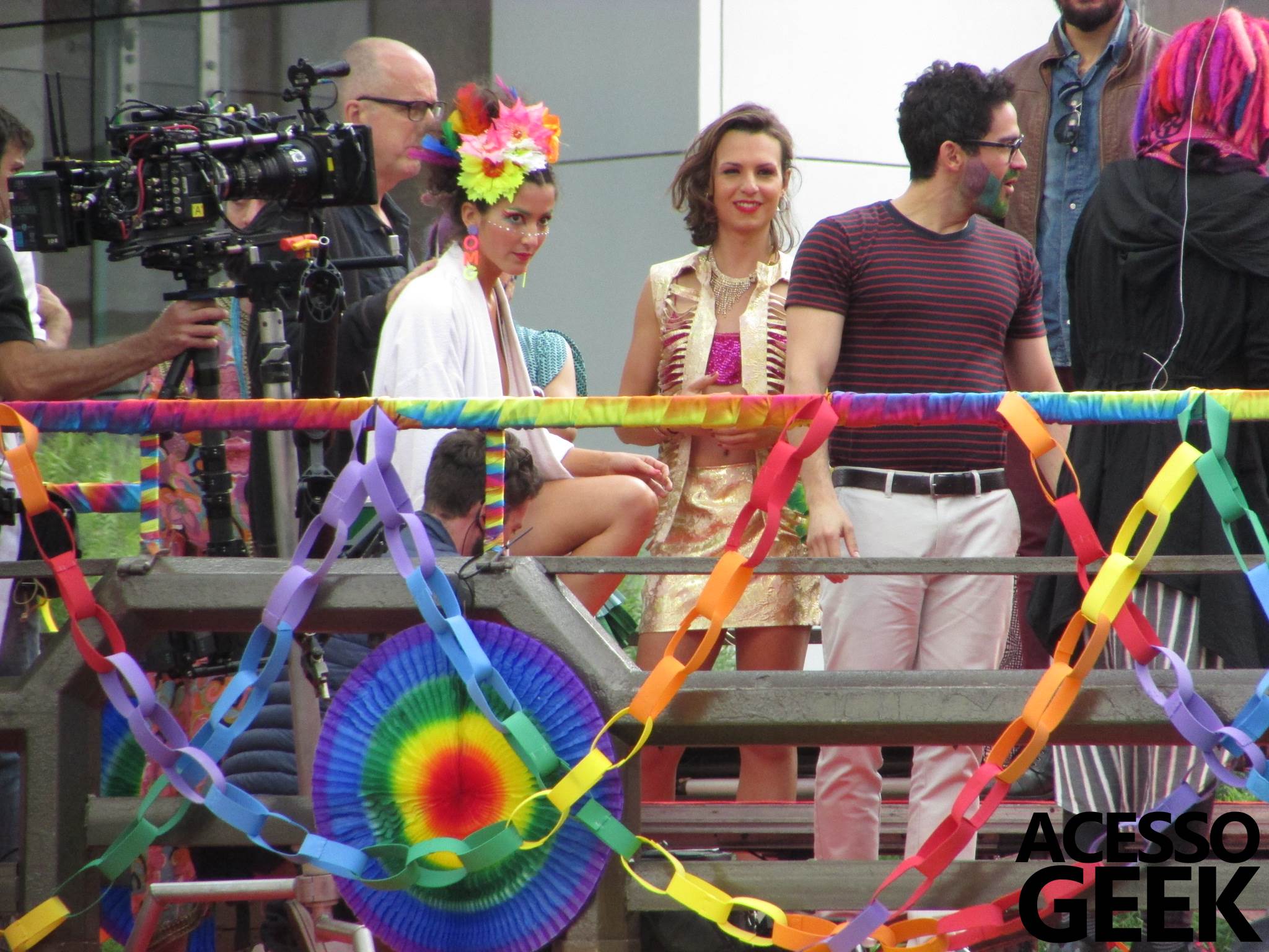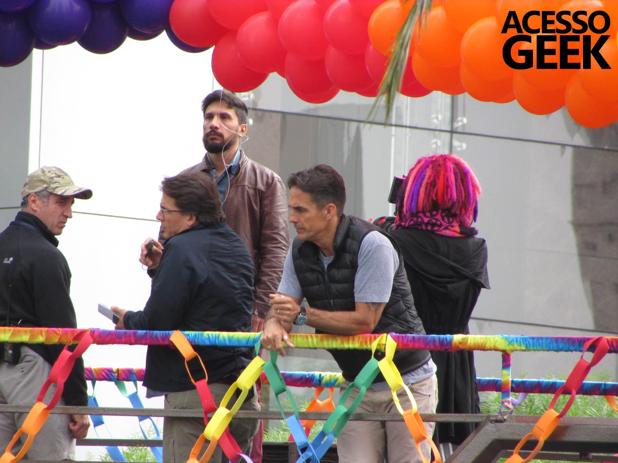 We had the opportunity to follow the recordings that happened last Saturday (28), at Avenida Chucri Zaidan, in São Paulo, more precisely next to the Shopping Morumbi. The producers of the serie, in association with O2 Filmes, mounted a “Trio Elétrico” (Trio Elétrico is the name given to a truck equipped with an extremely high powerful sound system and a musical group or some famous people and music on top of it), it was full of colorful balloons, representing the Gay Pride Parade, that happened on Sunday (28), at Paulista Avenue. Which was also the location of the recordings, as an extension of the recorded scene on Saturday.