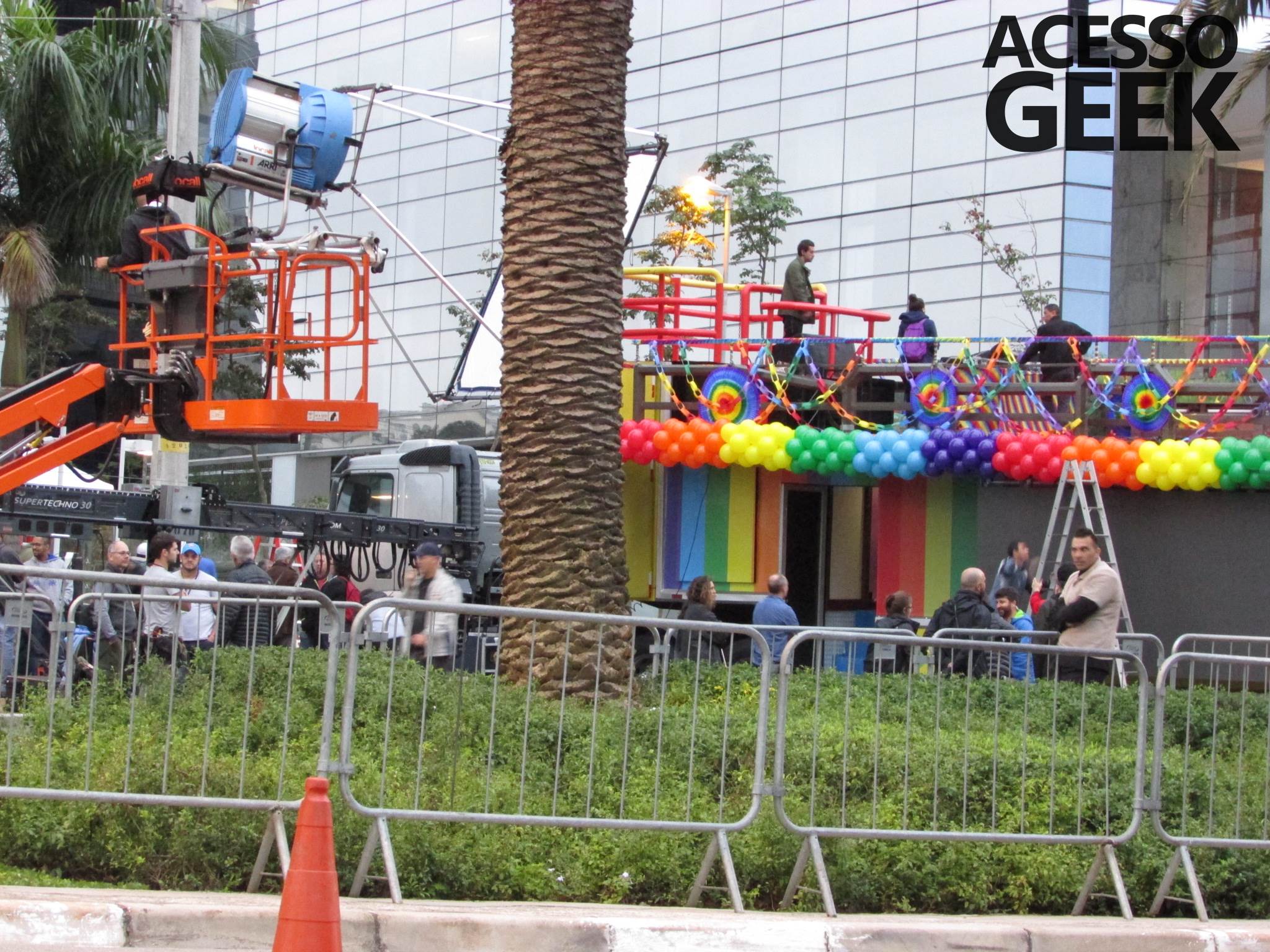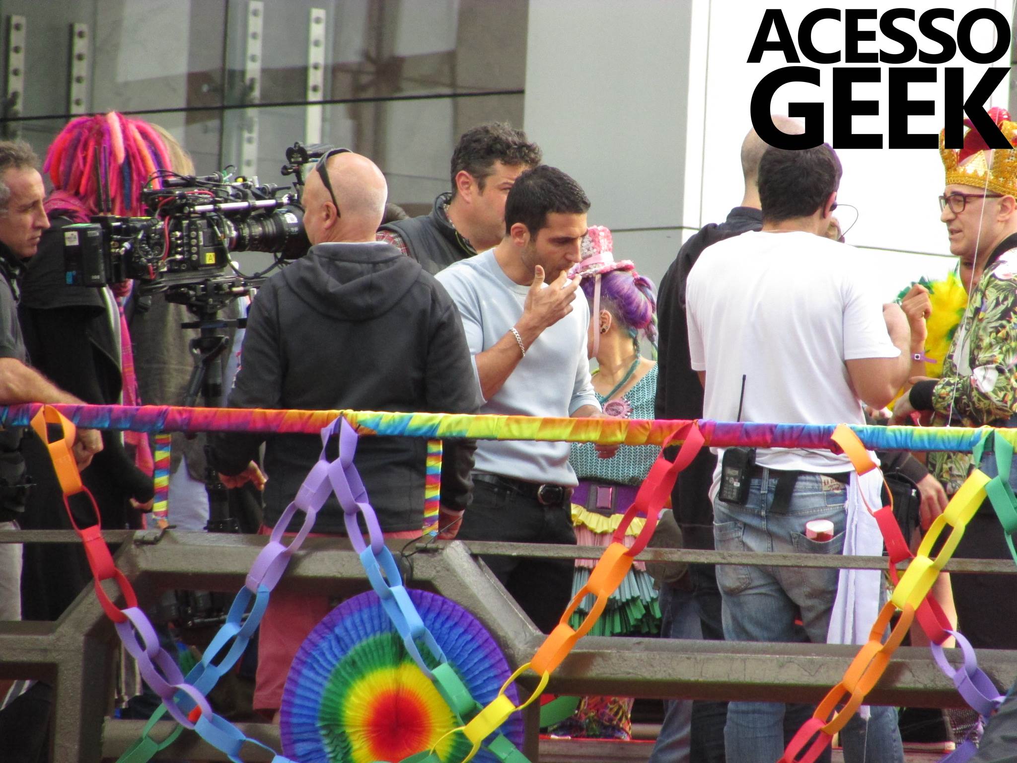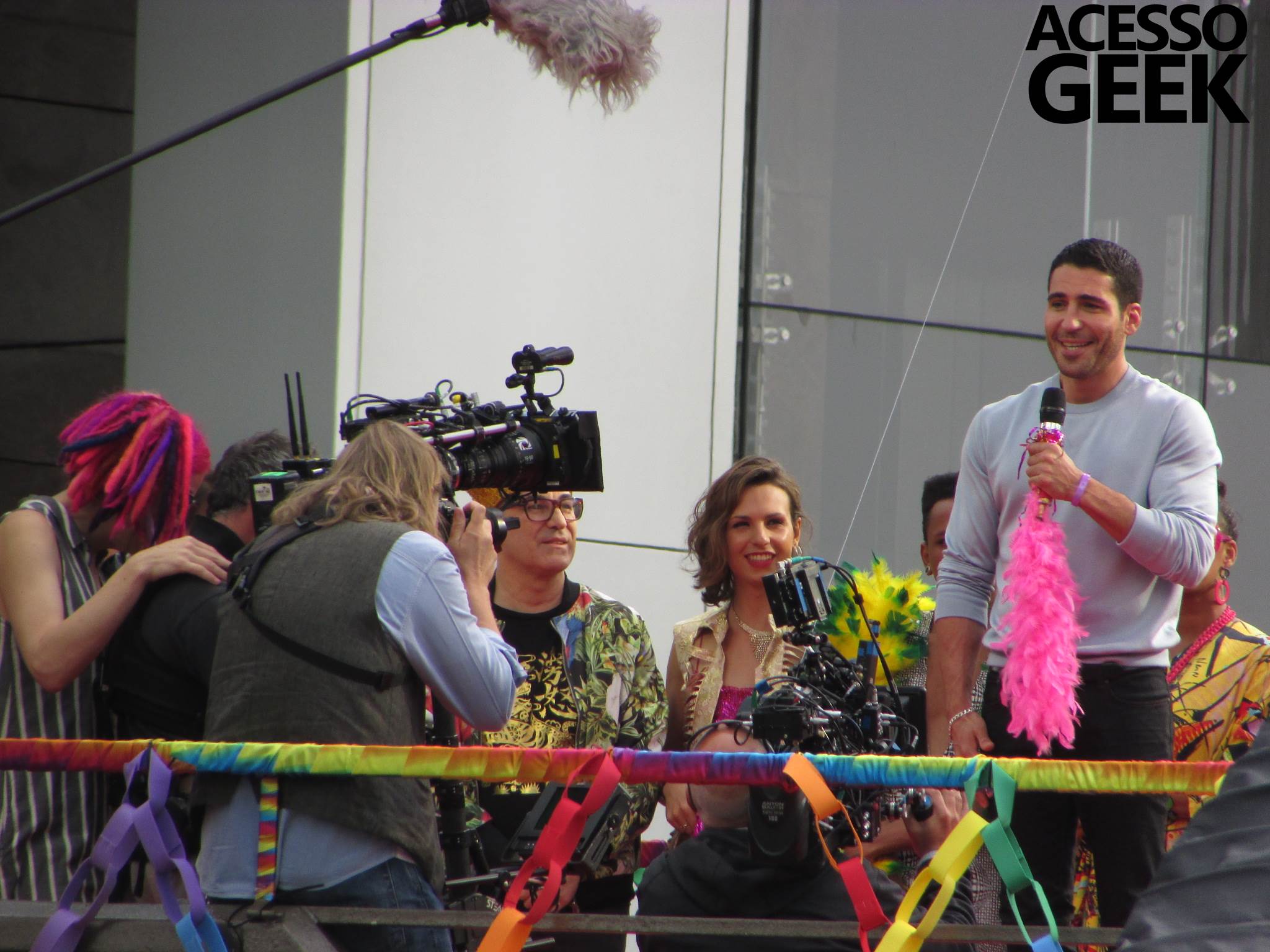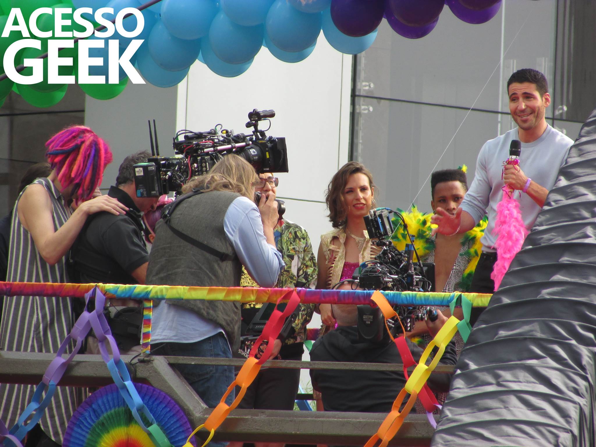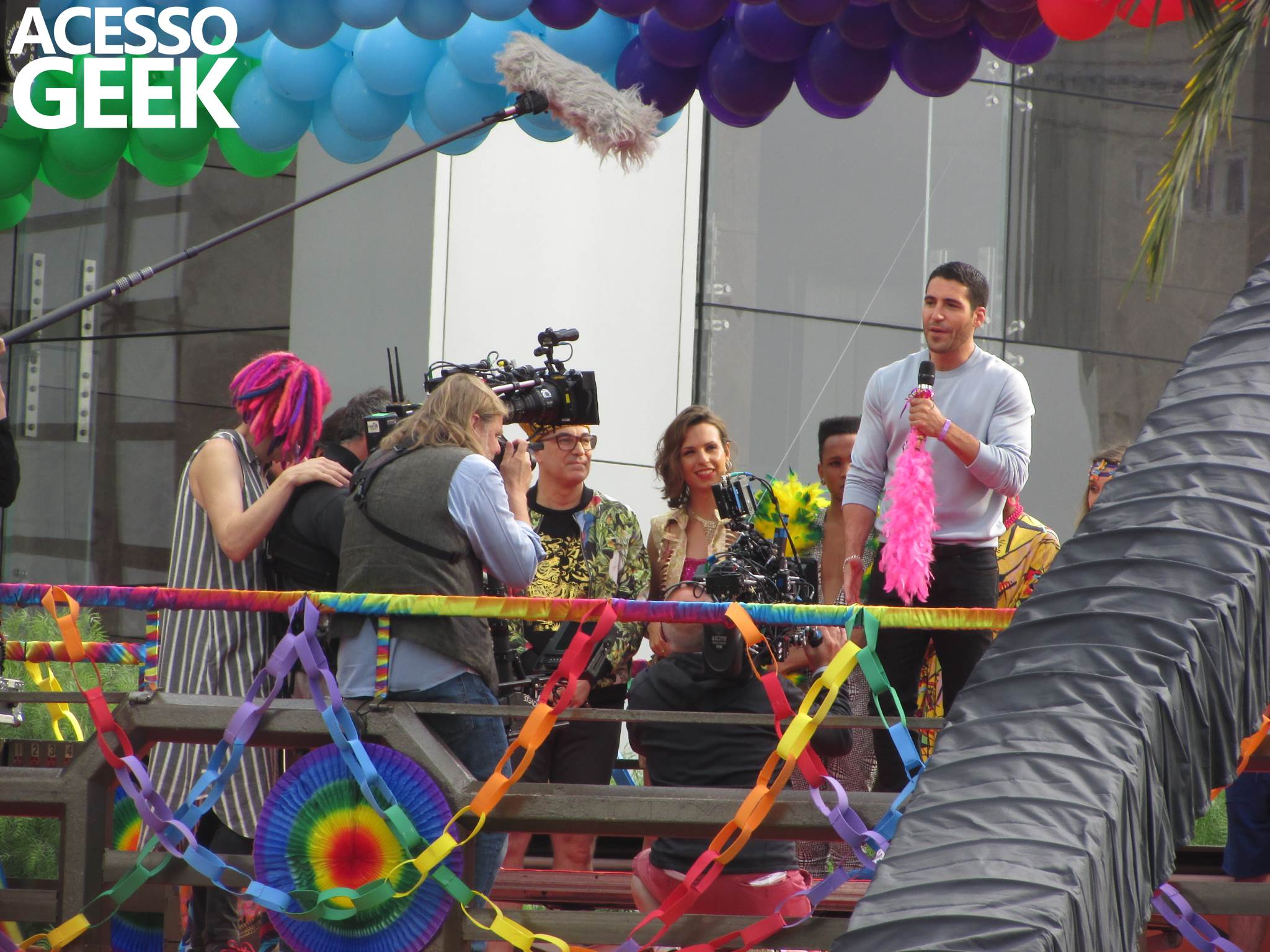 We had the opportunity to follow the recordings that happened last Saturday (28), at Avenida Chucri Zaidan, in São Paulo, more precisely next to the Shopping Morumbi. The producers of the serie, in association with O2 Filmes, mounted a “Trio Elétrico” (Trio Elétrico is the name given to a truck equipped with an extremely high powerful sound system and a musical group or some famous people and music on top of it), it was full of colorful balloons, representing the Gay Pride Parade, that happened on Sunday (28), at Paulista Avenue. Which was also the location of the recordings, as an extension of the recorded scene on Saturday.