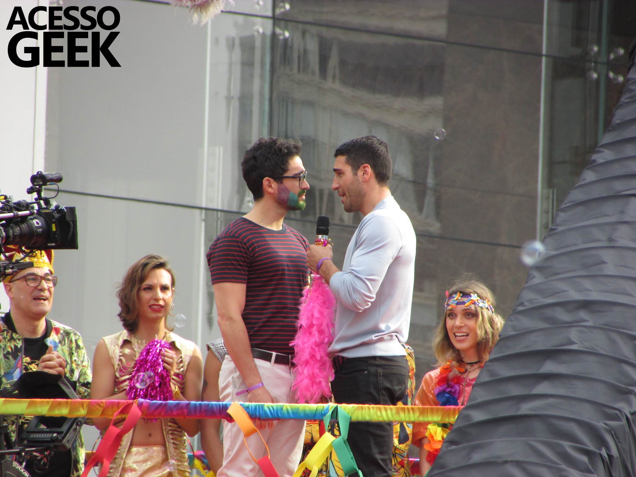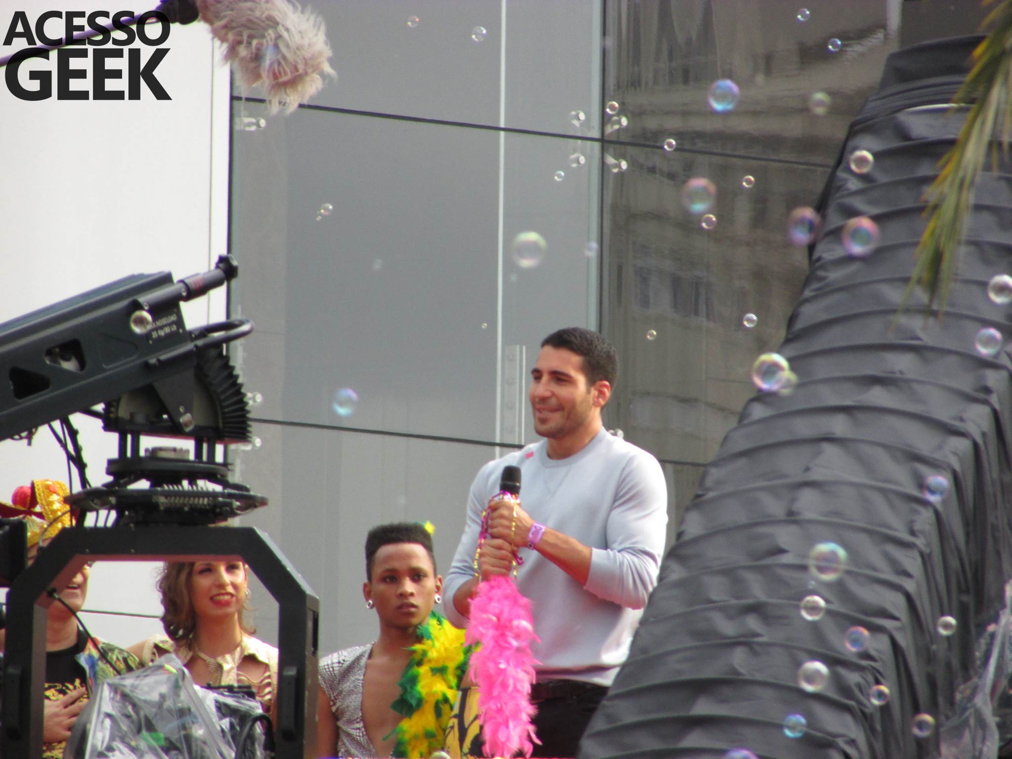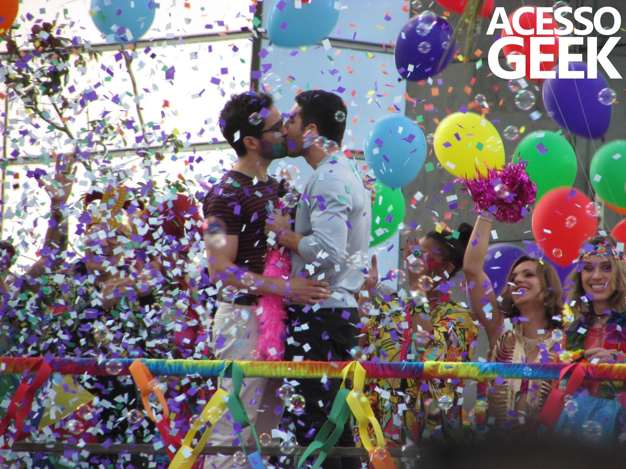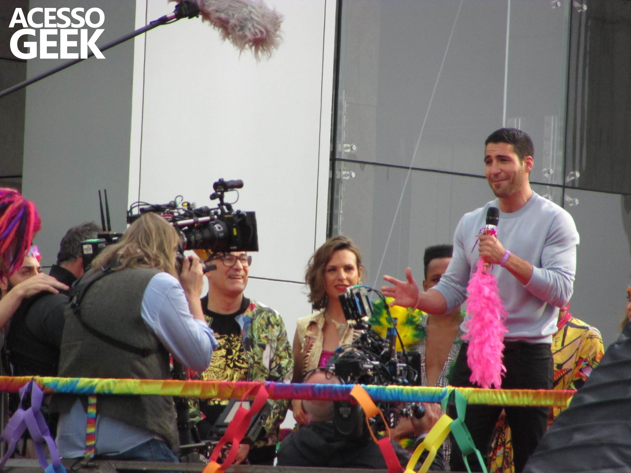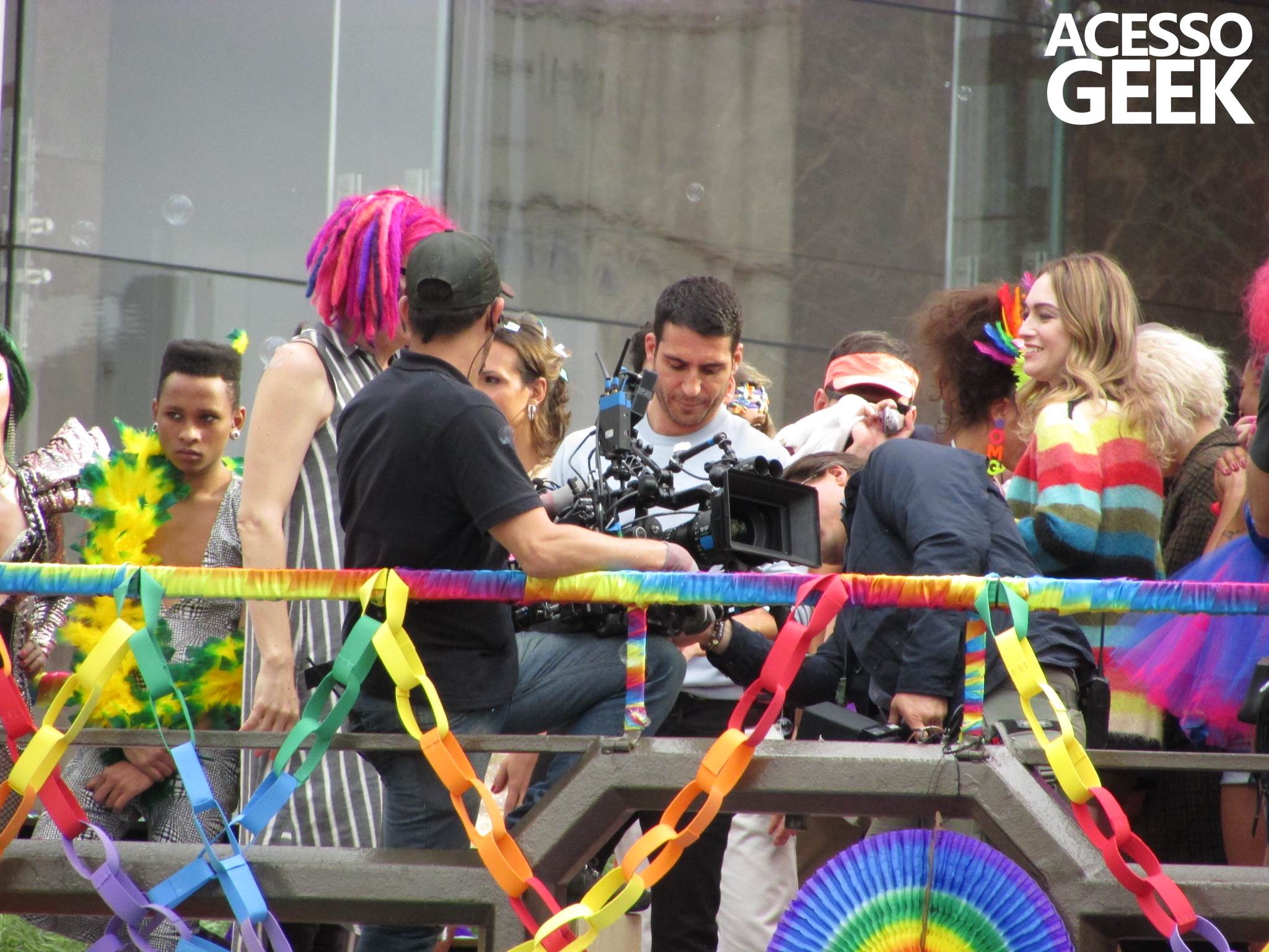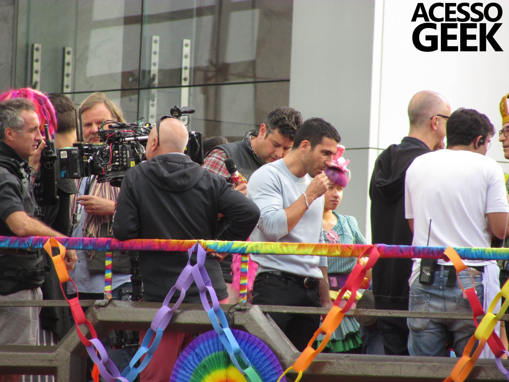 We had the opportunity to follow the recordings that happened last Saturday (28), at Avenida Chucri Zaidan, in São Paulo, more precisely next to the Shopping Morumbi. The producers of the serie, in association with O2 Filmes, mounted a “Trio Elétrico” (Trio Elétrico is the name given to a truck equipped with an extremely high powerful sound system and a musical group or some famous people and music on top of it), it was full of colorful balloons, representing the Gay Pride Parade, that happened on Sunday (28), at Paulista Avenue. Which was also the location of the recordings, as an extension of the recorded scene on Saturday.