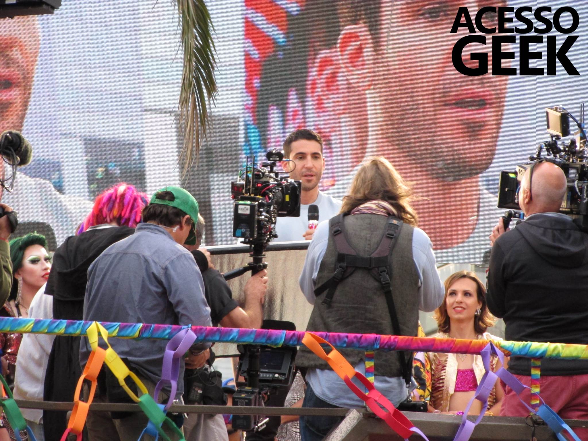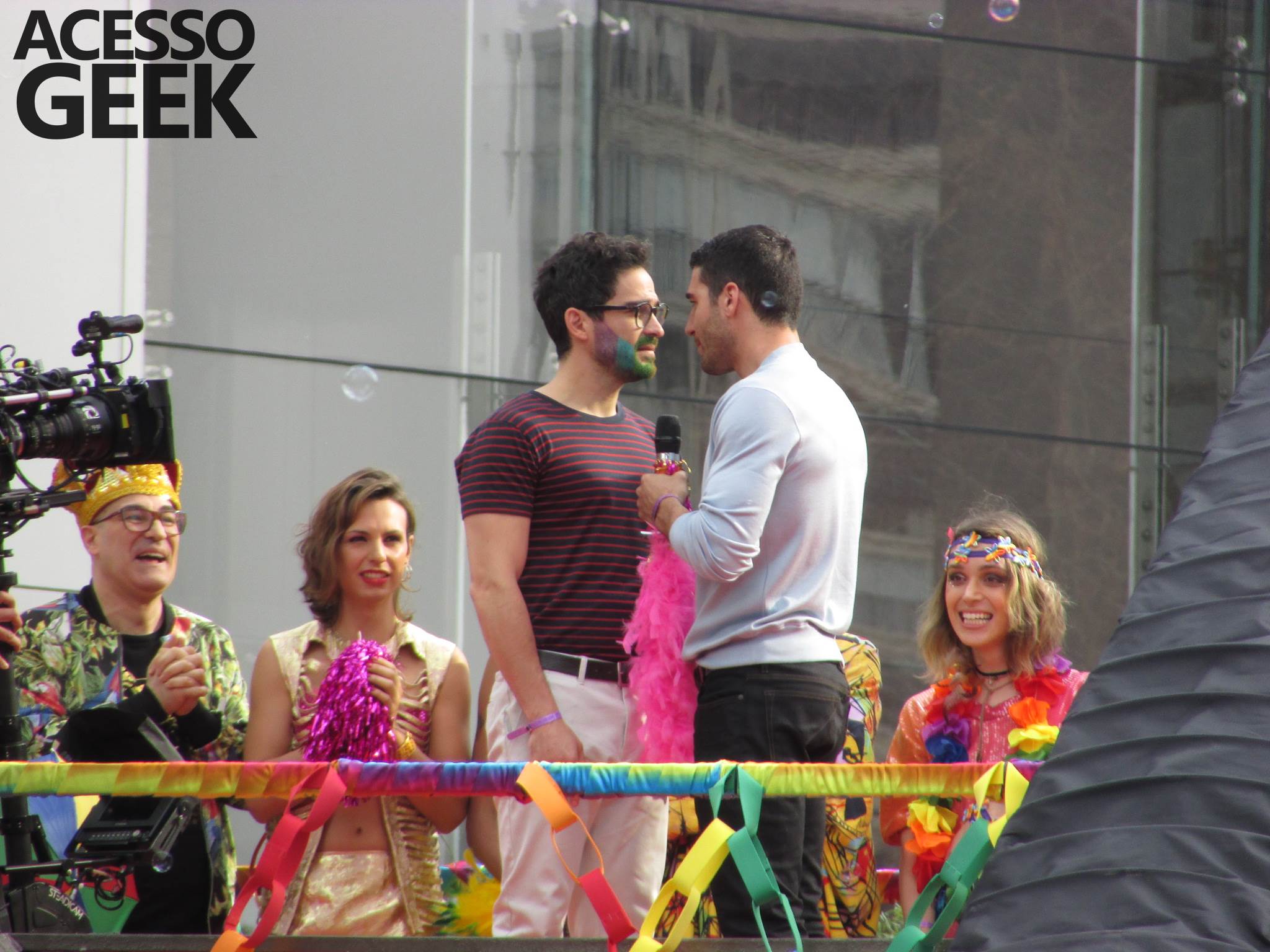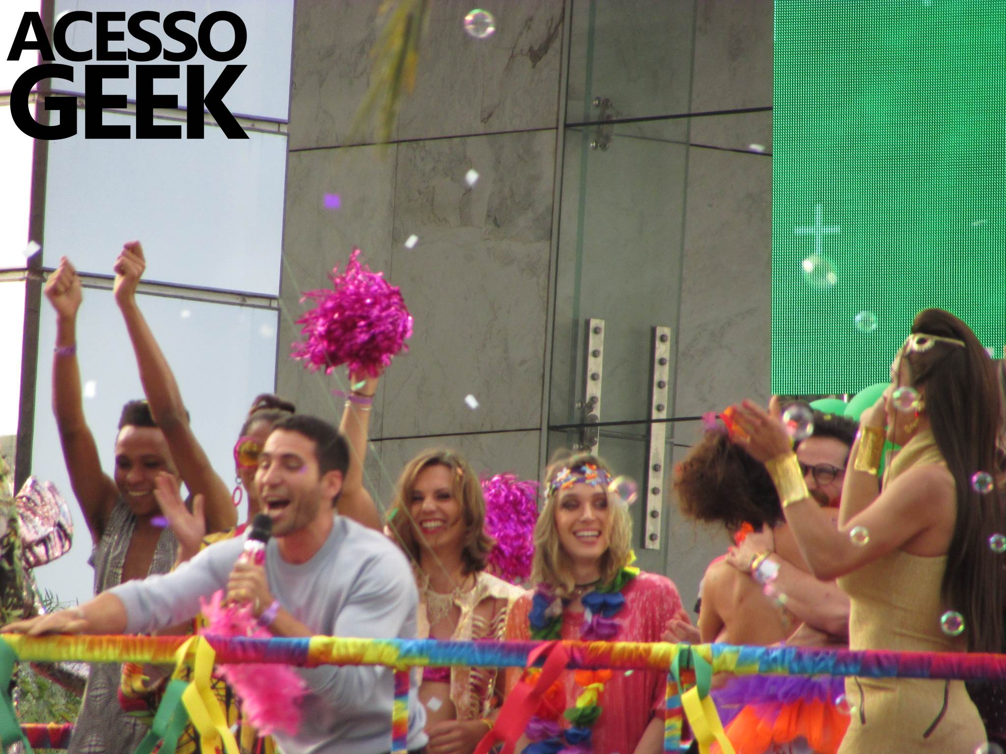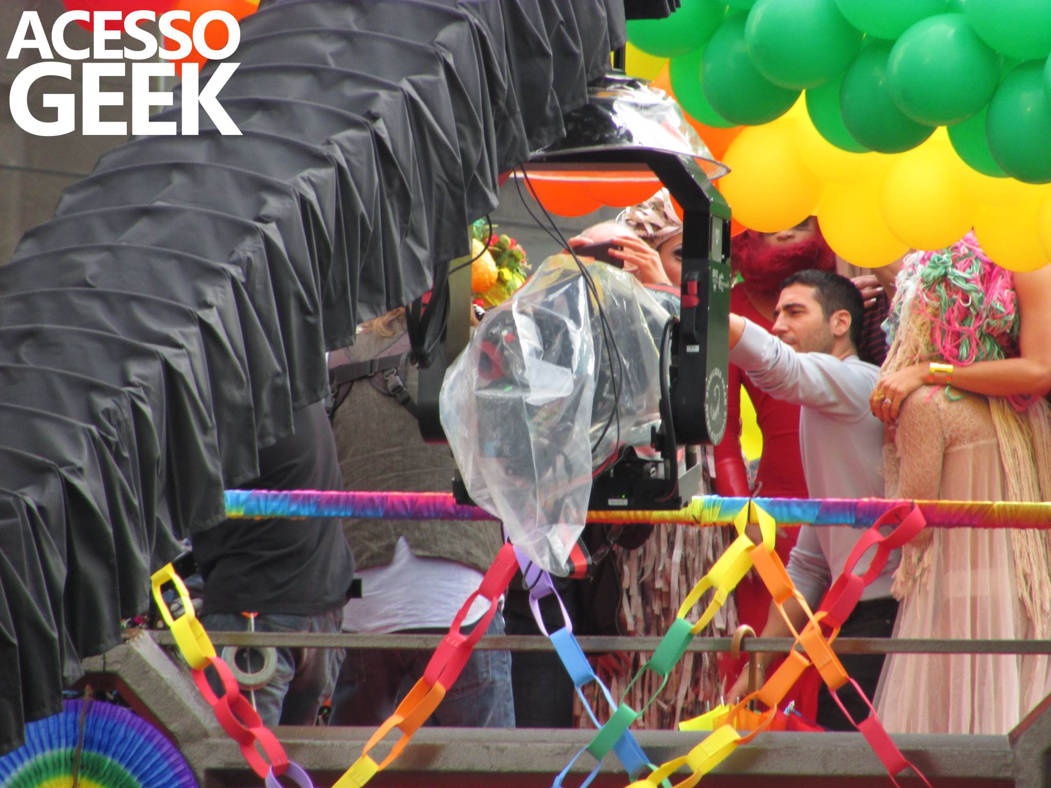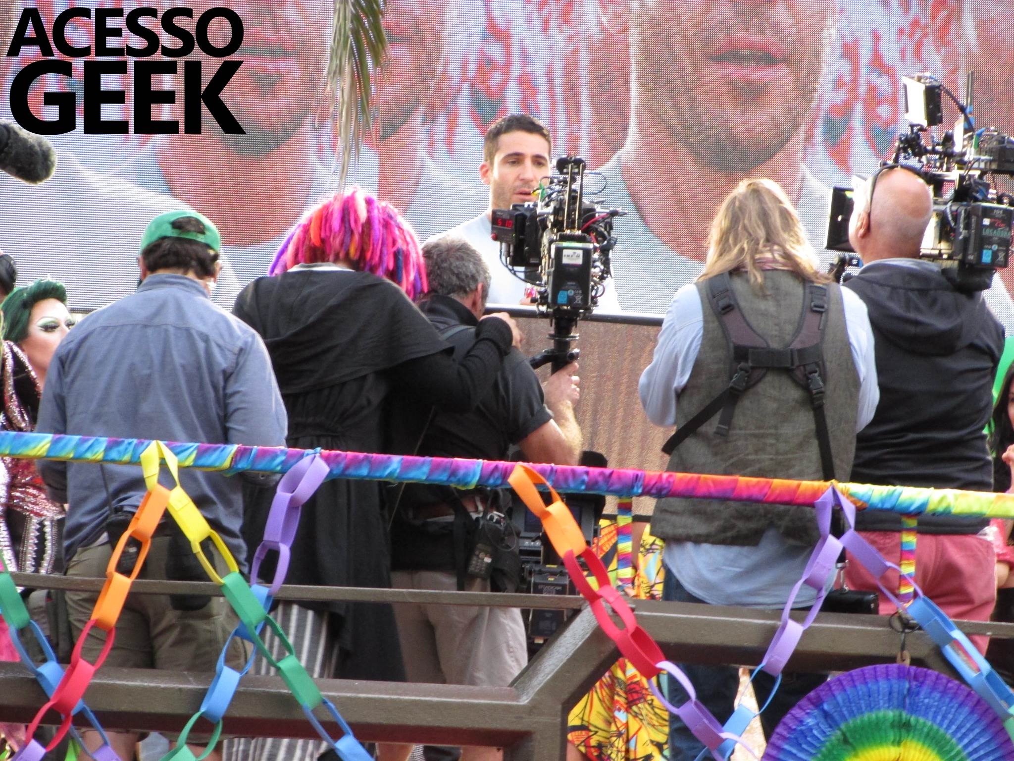 We had the opportunity to follow the recordings that happened last Saturday (28), at Avenida Chucri Zaidan, in São Paulo, more precisely next to the Shopping Morumbi. The producers of the serie, in association with O2 Filmes, mounted a “Trio Elétrico” (Trio Elétrico is the name given to a truck equipped with an extremely high powerful sound system and a musical group or some famous people and music on top of it), it was full of colorful balloons, representing the Gay Pride Parade, that happened on Sunday (28), at Paulista Avenue. Which was also the location of the recordings, as an extension of the recorded scene on Saturday.
