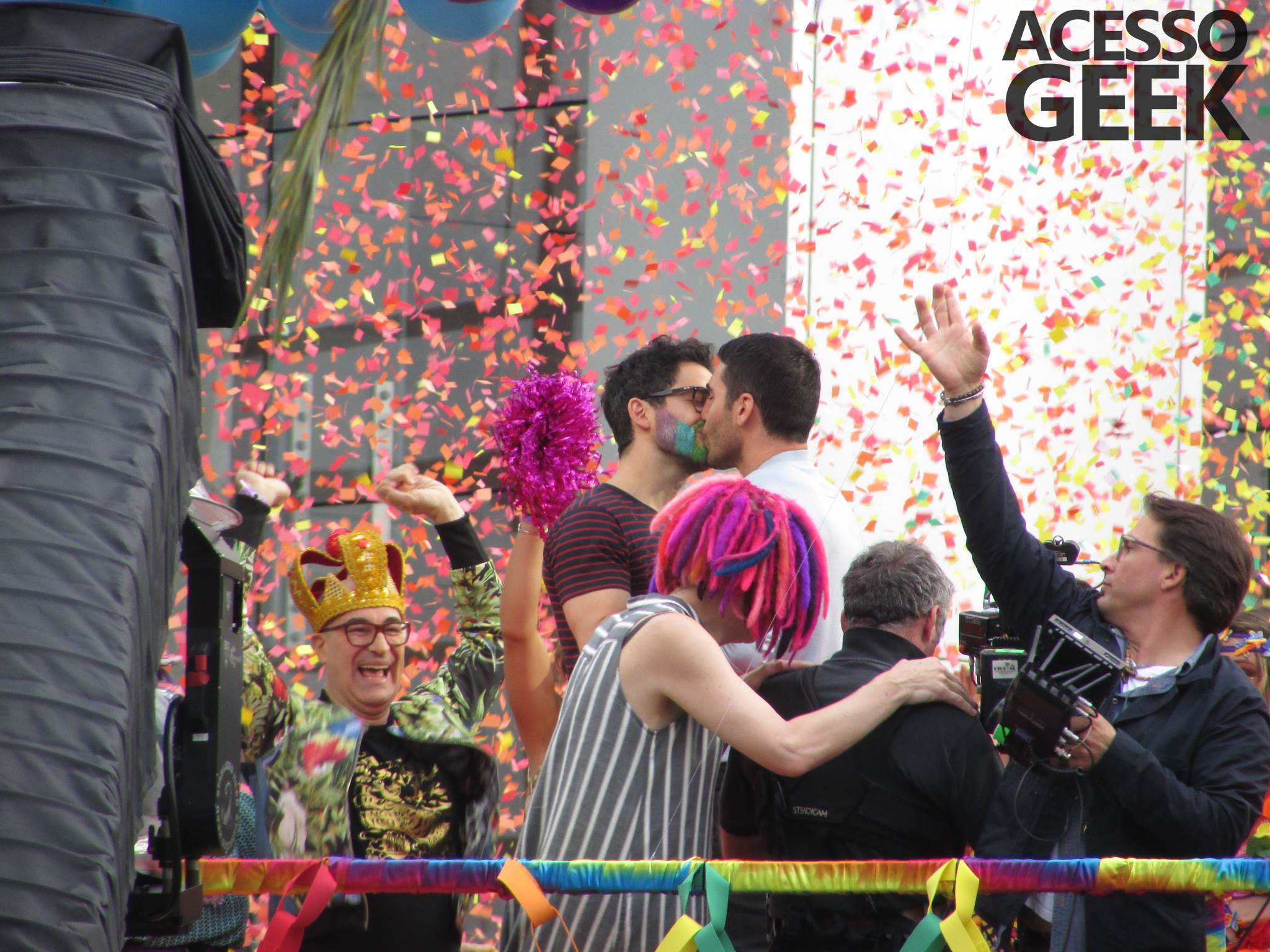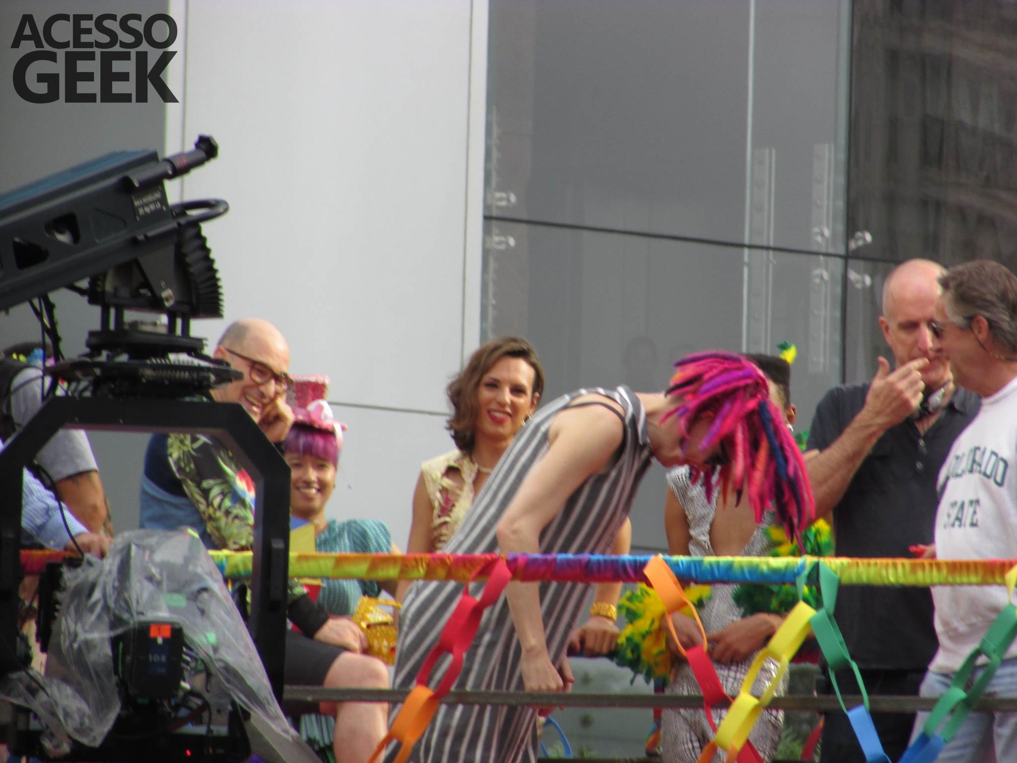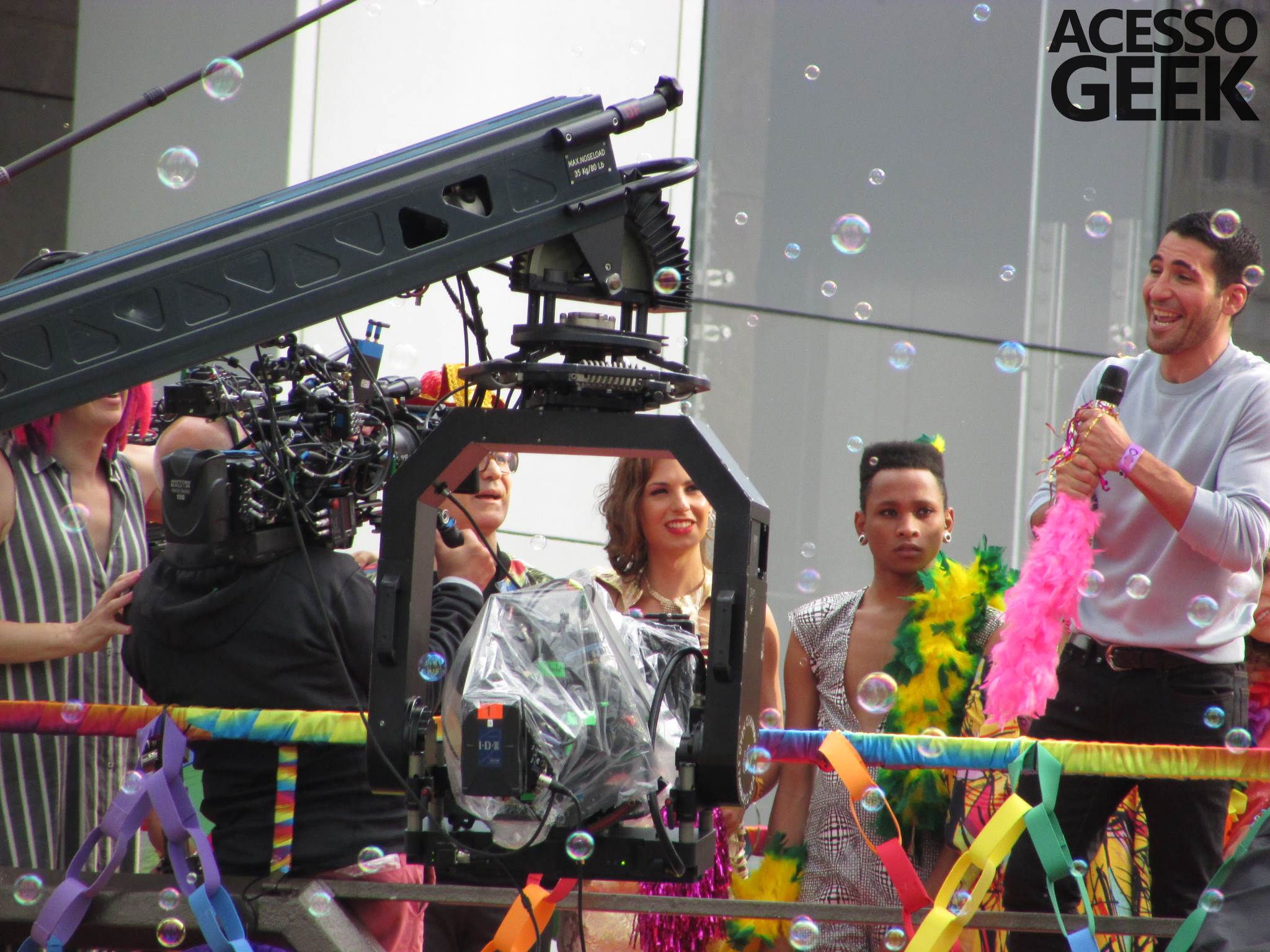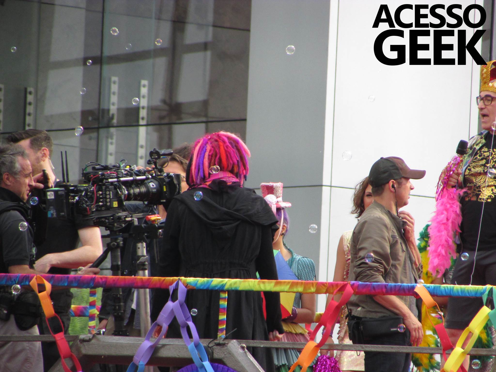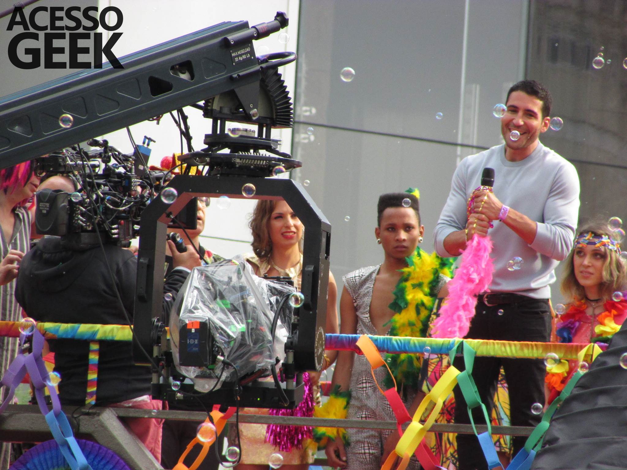 We had the opportunity to follow the recordings that happened last Saturday (28), at Avenida Chucri Zaidan, in São Paulo, more precisely next to the Shopping Morumbi. The producers of the serie, in association with O2 Filmes, mounted a “Trio Elétrico” (Trio Elétrico is the name given to a truck equipped with an extremely high powerful sound system and a musical group or some famous people and music on top of it), it was full of colorful balloons, representing the Gay Pride Parade, that happened on Sunday (28), at Paulista Avenue. Which was also the location of the recordings, as an extension of the recorded scene on Saturday.