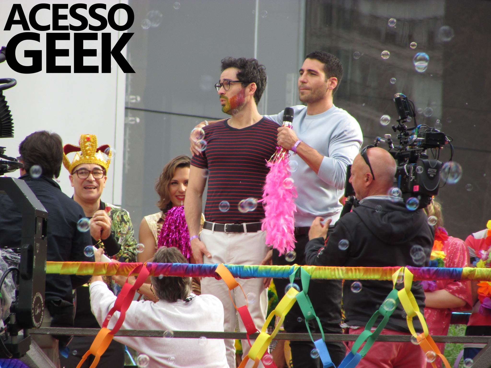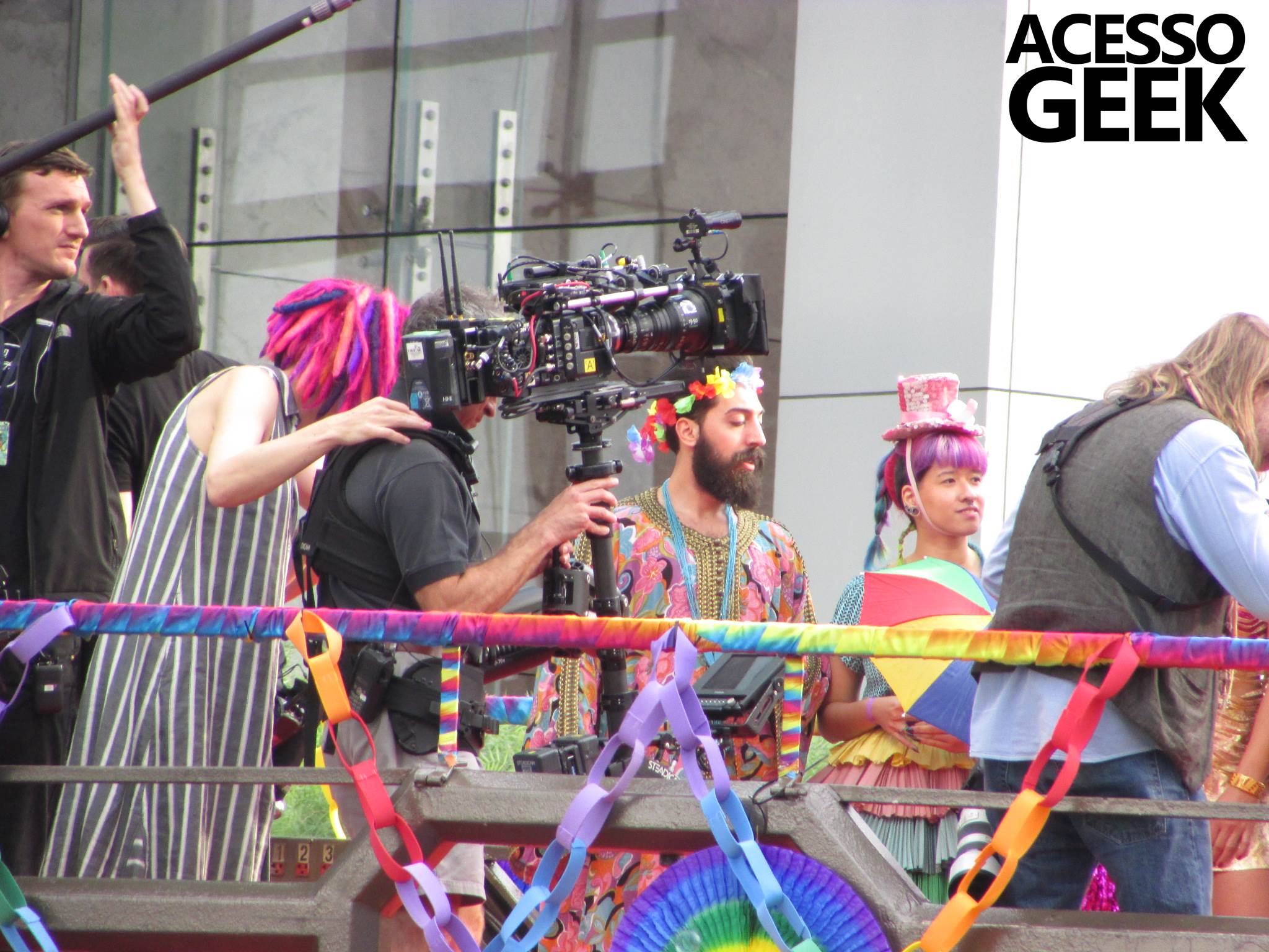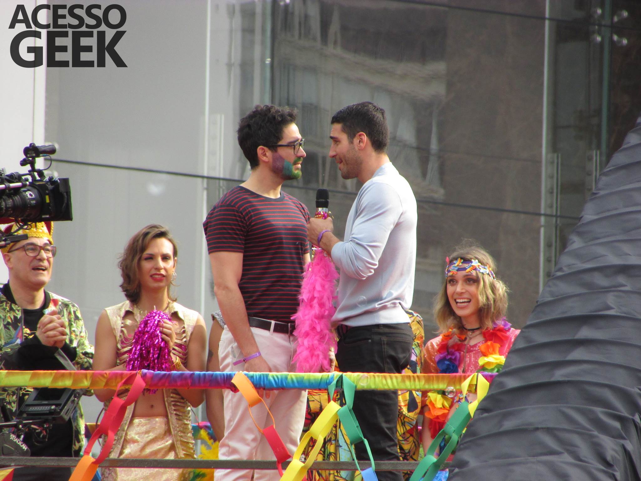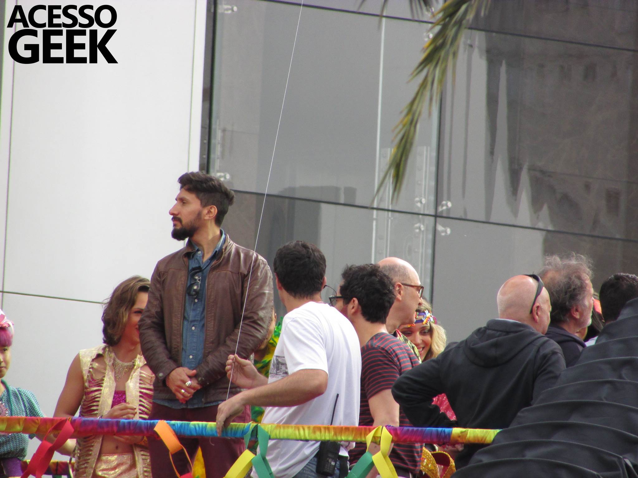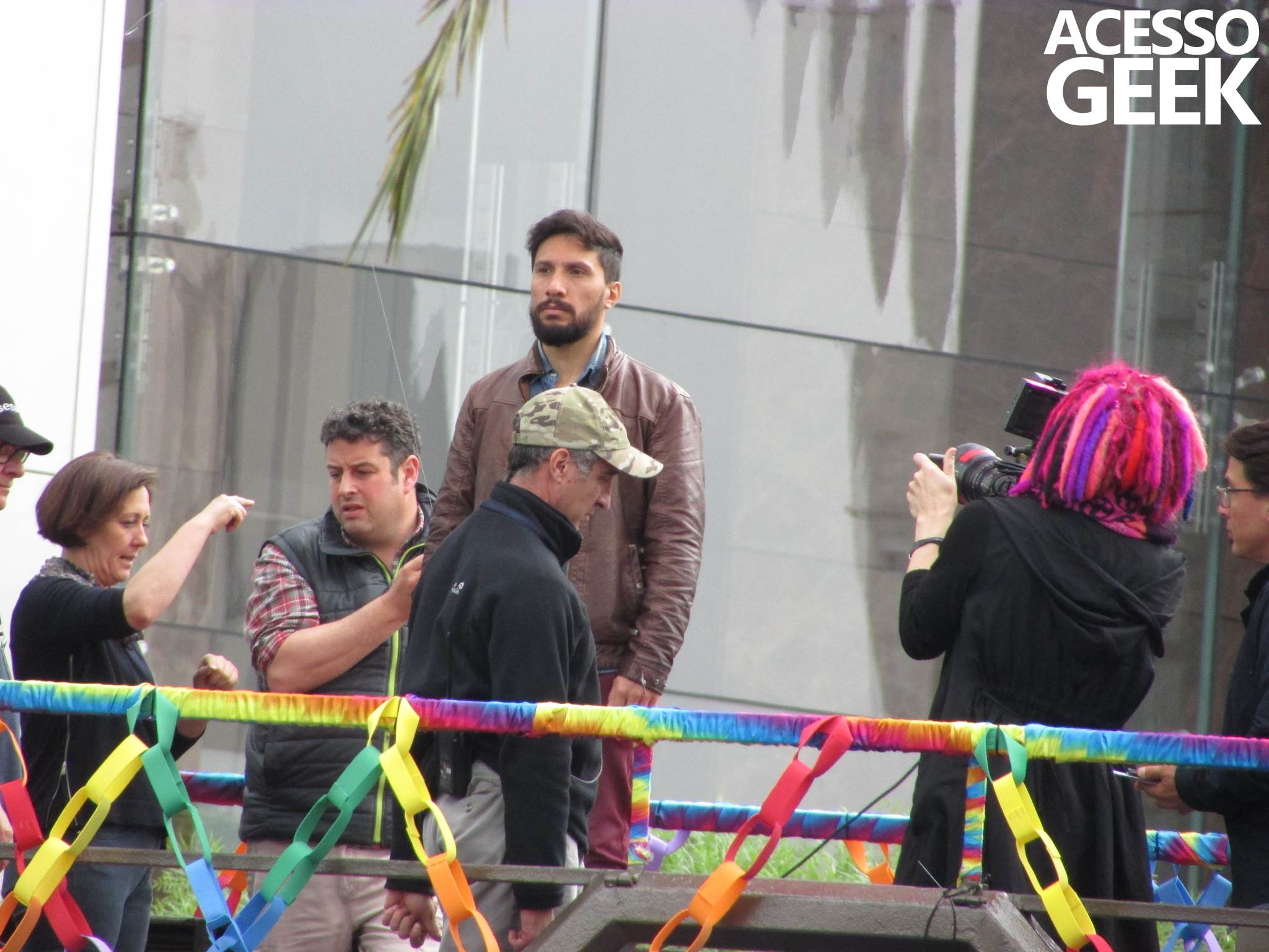 We had the opportunity to follow the recordings that happened last Saturday (28), at Avenida Chucri Zaidan, in São Paulo, more precisely next to the Shopping Morumbi. The producers of the serie, in association with O2 Filmes, mounted a “Trio Elétrico” (Trio Elétrico is the name given to a truck equipped with an extremely high powerful sound system and a musical group or some famous people and music on top of it), it was full of colorful balloons, representing the Gay Pride Parade, that happened on Sunday (28), at Paulista Avenue. Which was also the location of the recordings, as an extension of the recorded scene on Saturday.