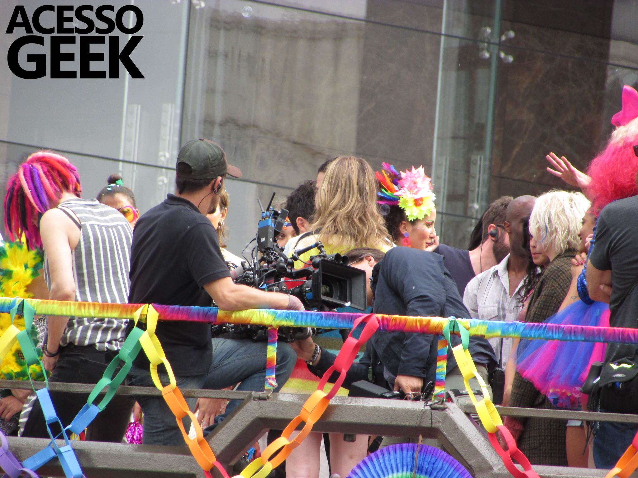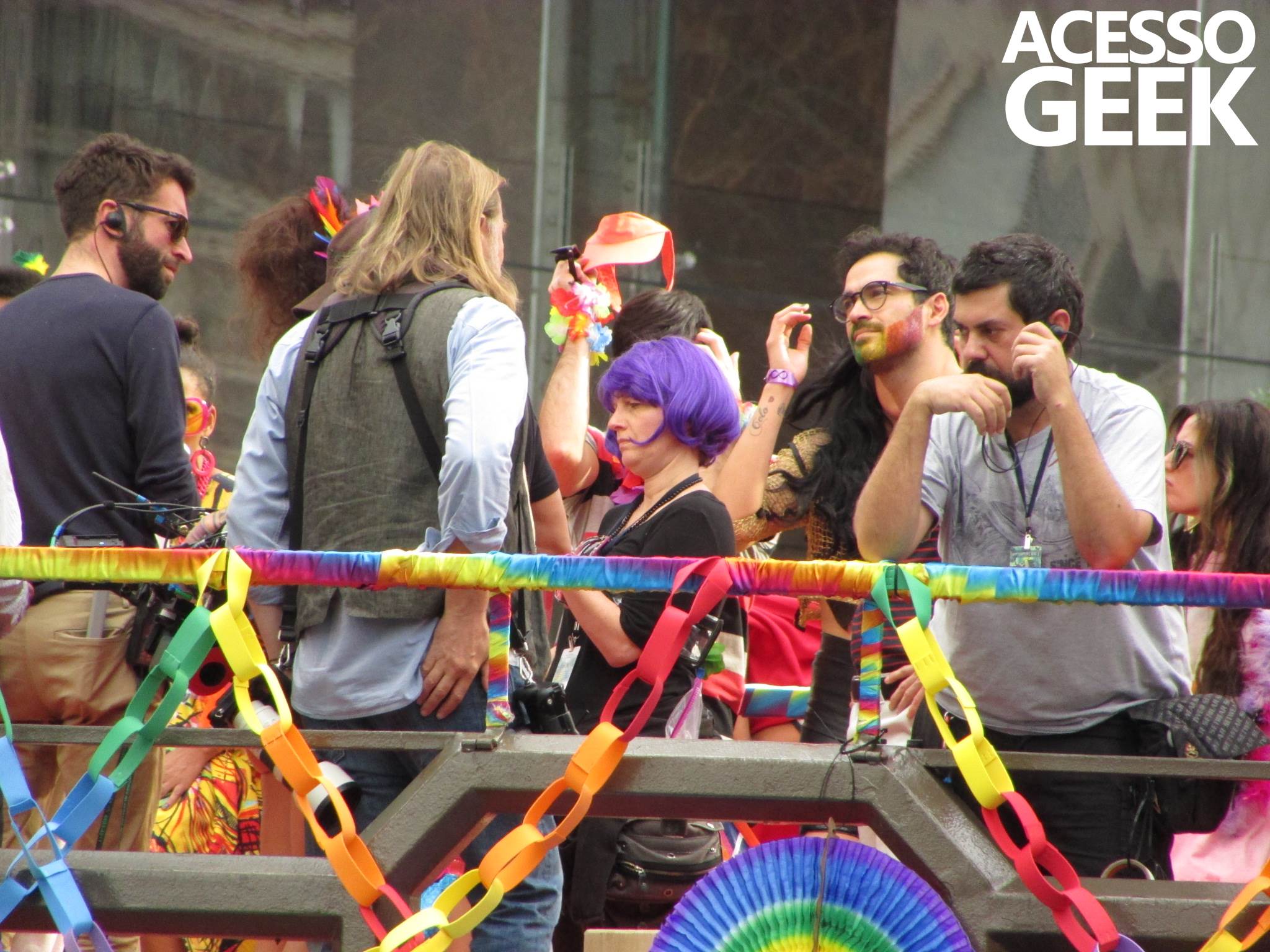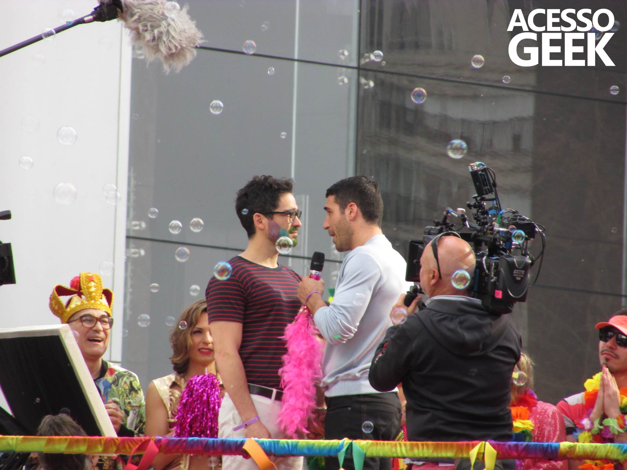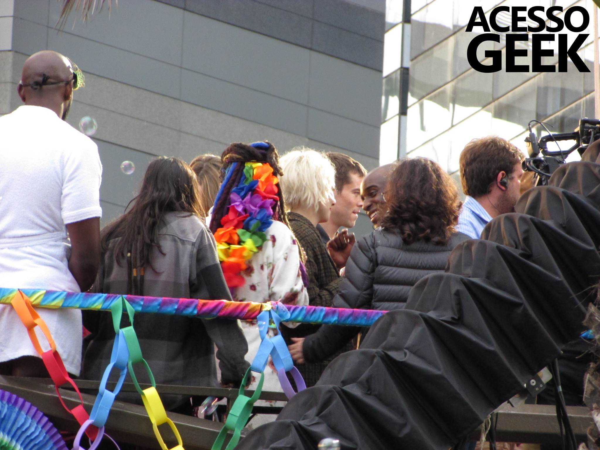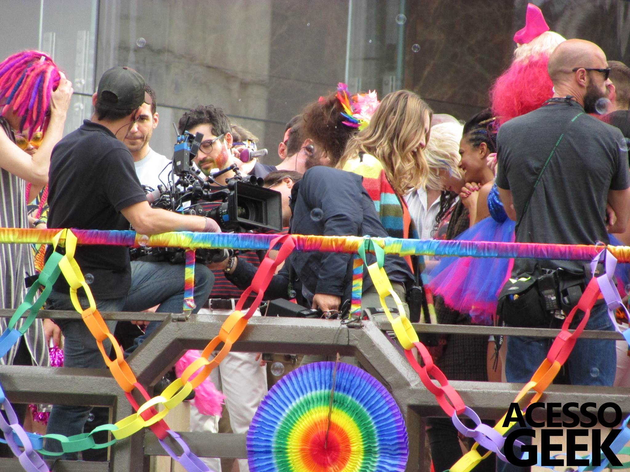 We had the opportunity to follow the recordings that happened last Saturday (28), at Avenida Chucri Zaidan, in São Paulo, more precisely next to the Shopping Morumbi. The producers of the serie, in association with O2 Filmes, mounted a “Trio Elétrico” (Trio Elétrico is the name given to a truck equipped with an extremely high powerful sound system and a musical group or some famous people and music on top of it), it was full of colorful balloons, representing the Gay Pride Parade, that happened on Sunday (28), at Paulista Avenue. Which was also the location of the recordings, as an extension of the recorded scene on Saturday.
