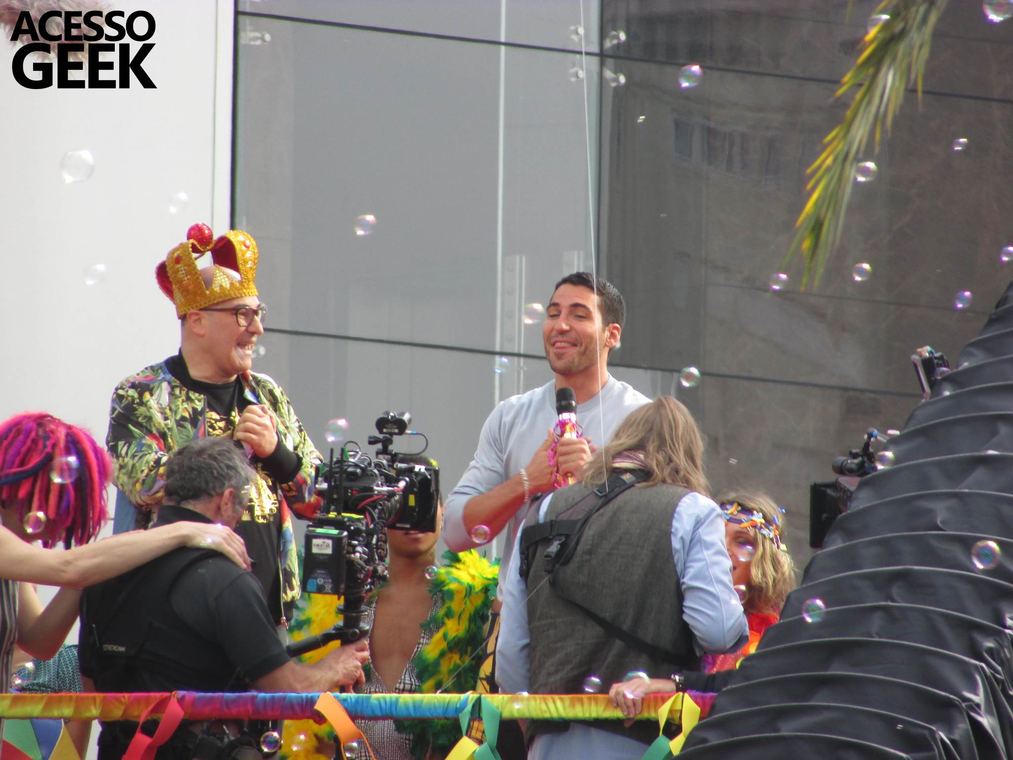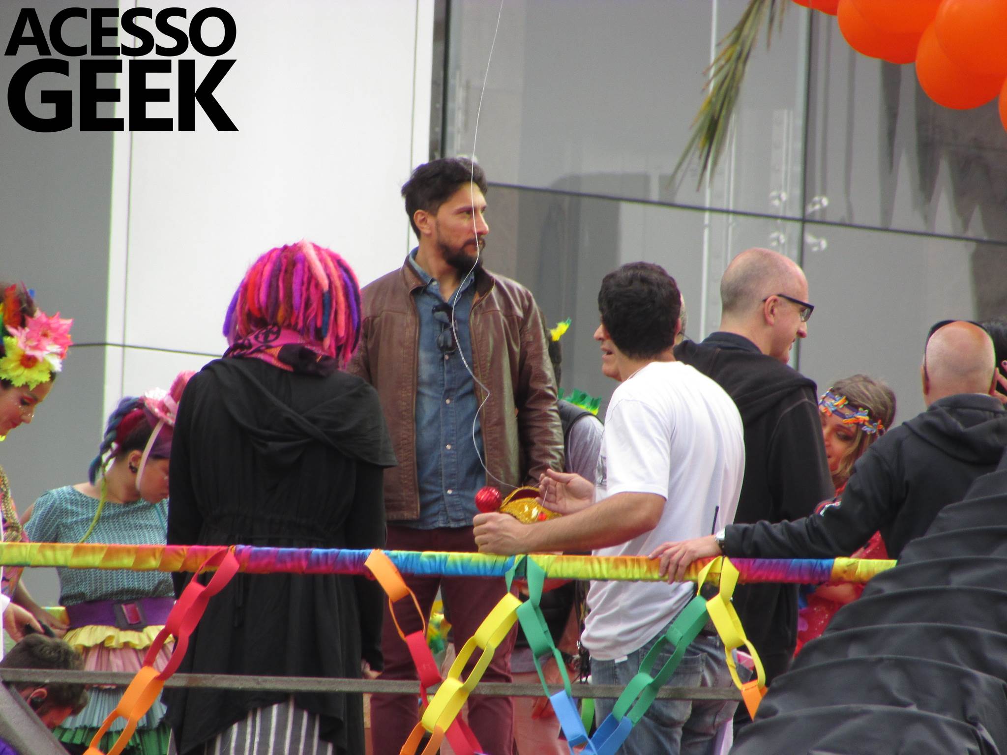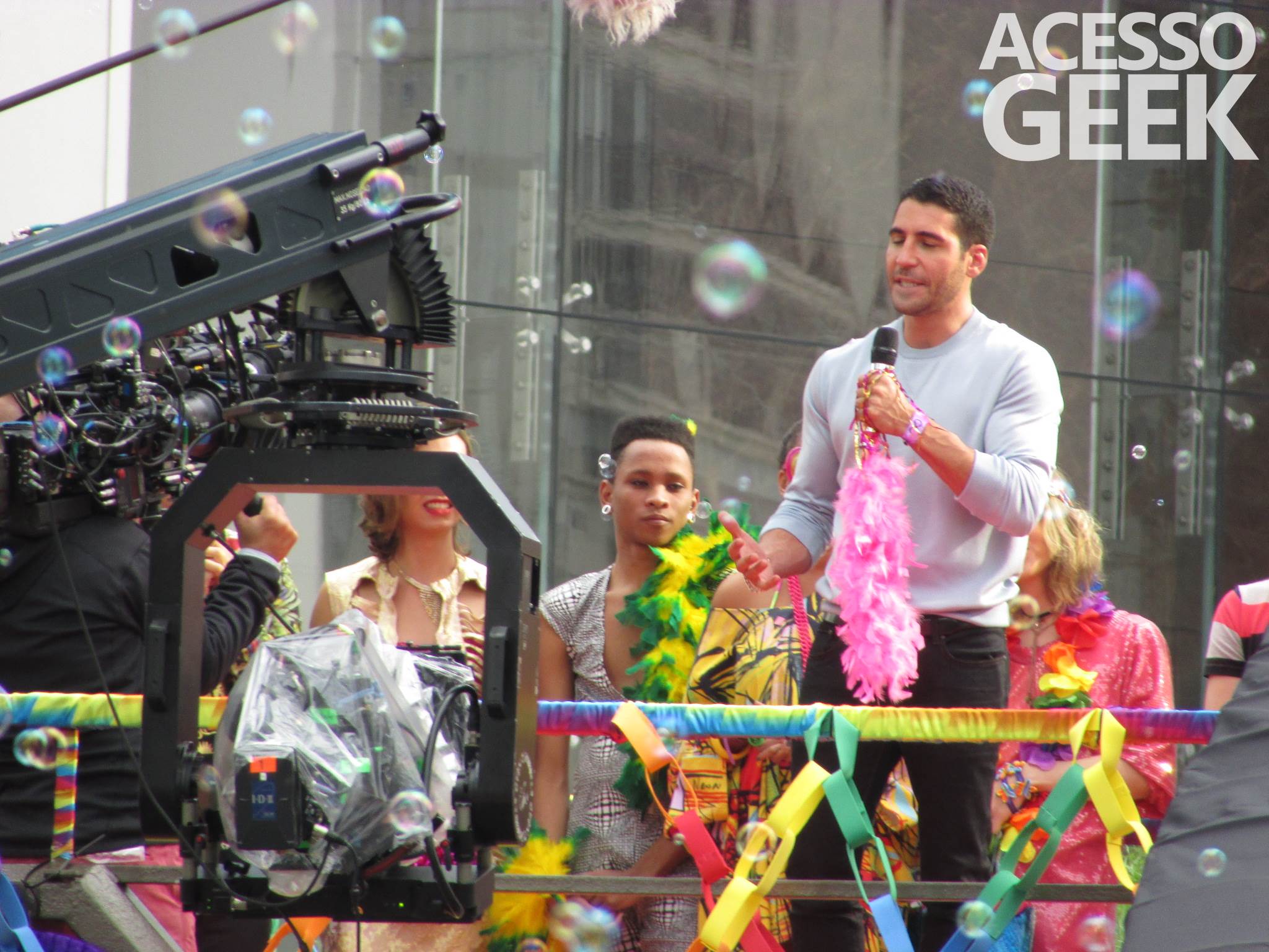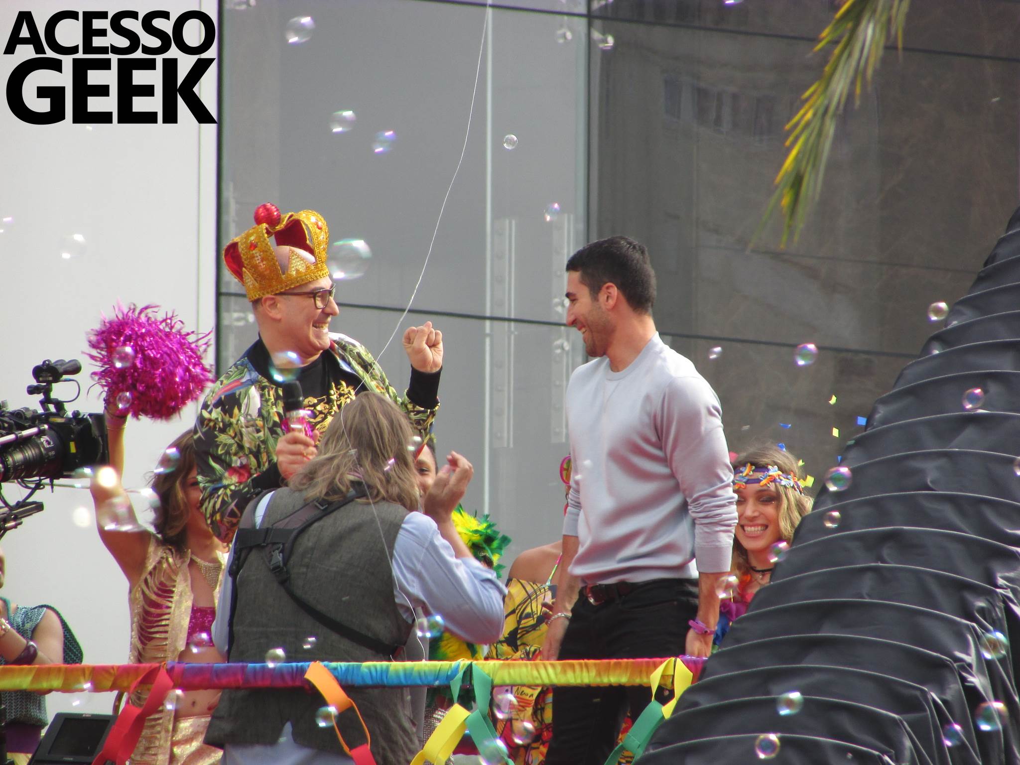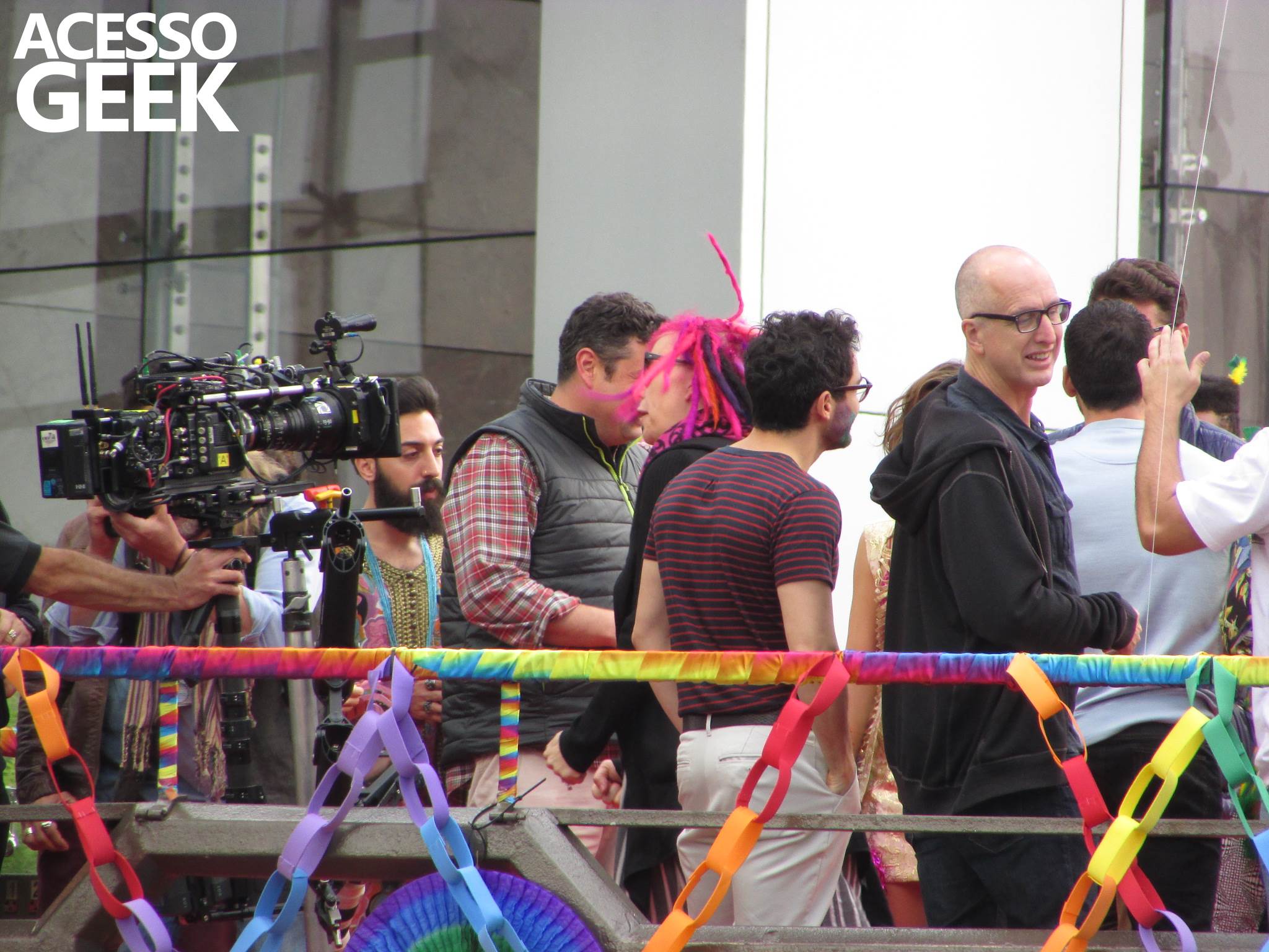 We had the opportunity to follow the recordings that happened last Saturday (28), at Avenida Chucri Zaidan, in São Paulo, more precisely next to the Shopping Morumbi. The producers of the serie, in association with O2 Filmes, mounted a “Trio Elétrico” (Trio Elétrico is the name given to a truck equipped with an extremely high powerful sound system and a musical group or some famous people and music on top of it), it was full of colorful balloons, representing the Gay Pride Parade, that happened on Sunday (28), at Paulista Avenue. Which was also the location of the recordings, as an extension of the recorded scene on Saturday.
