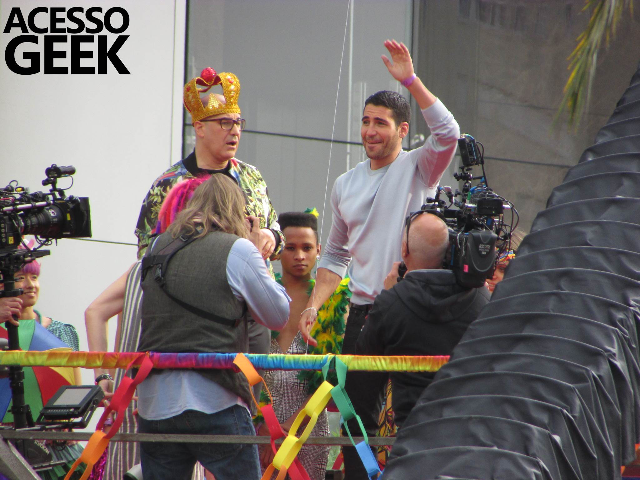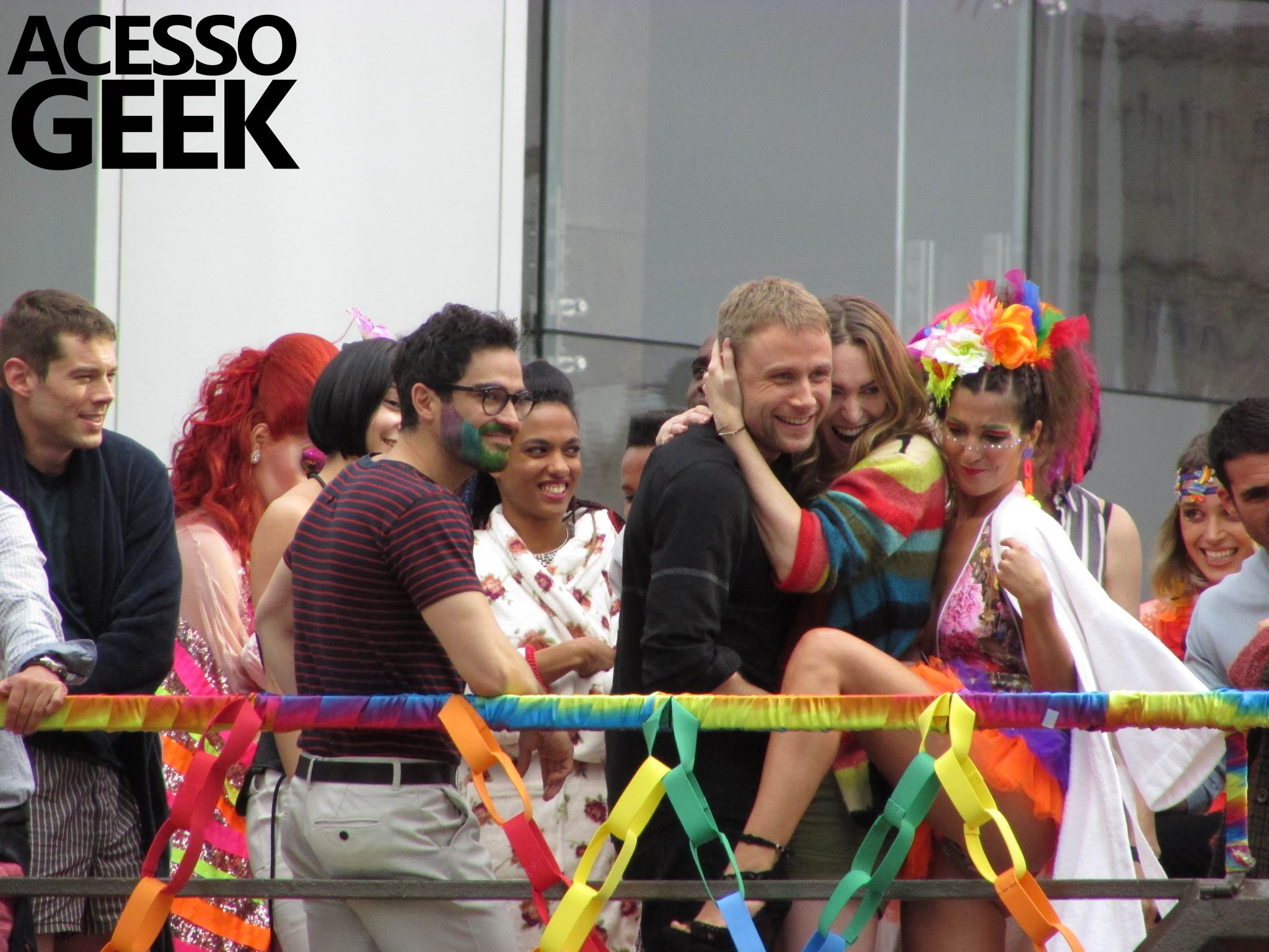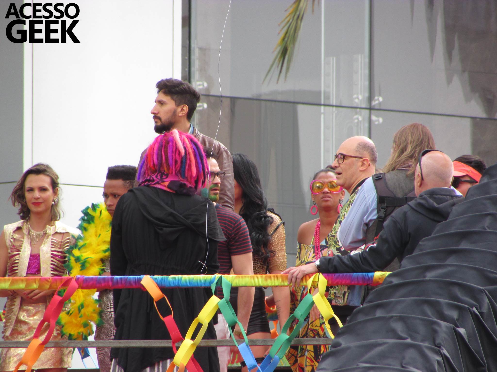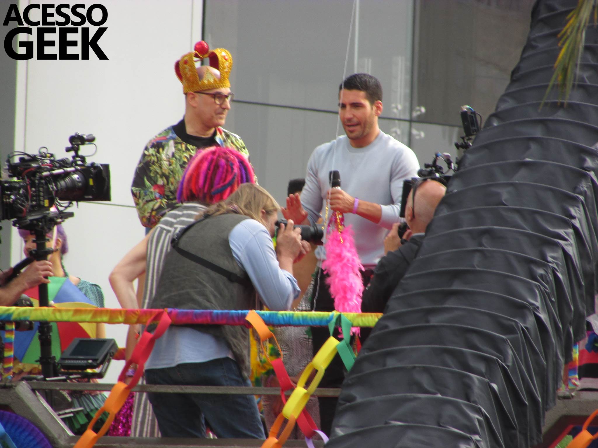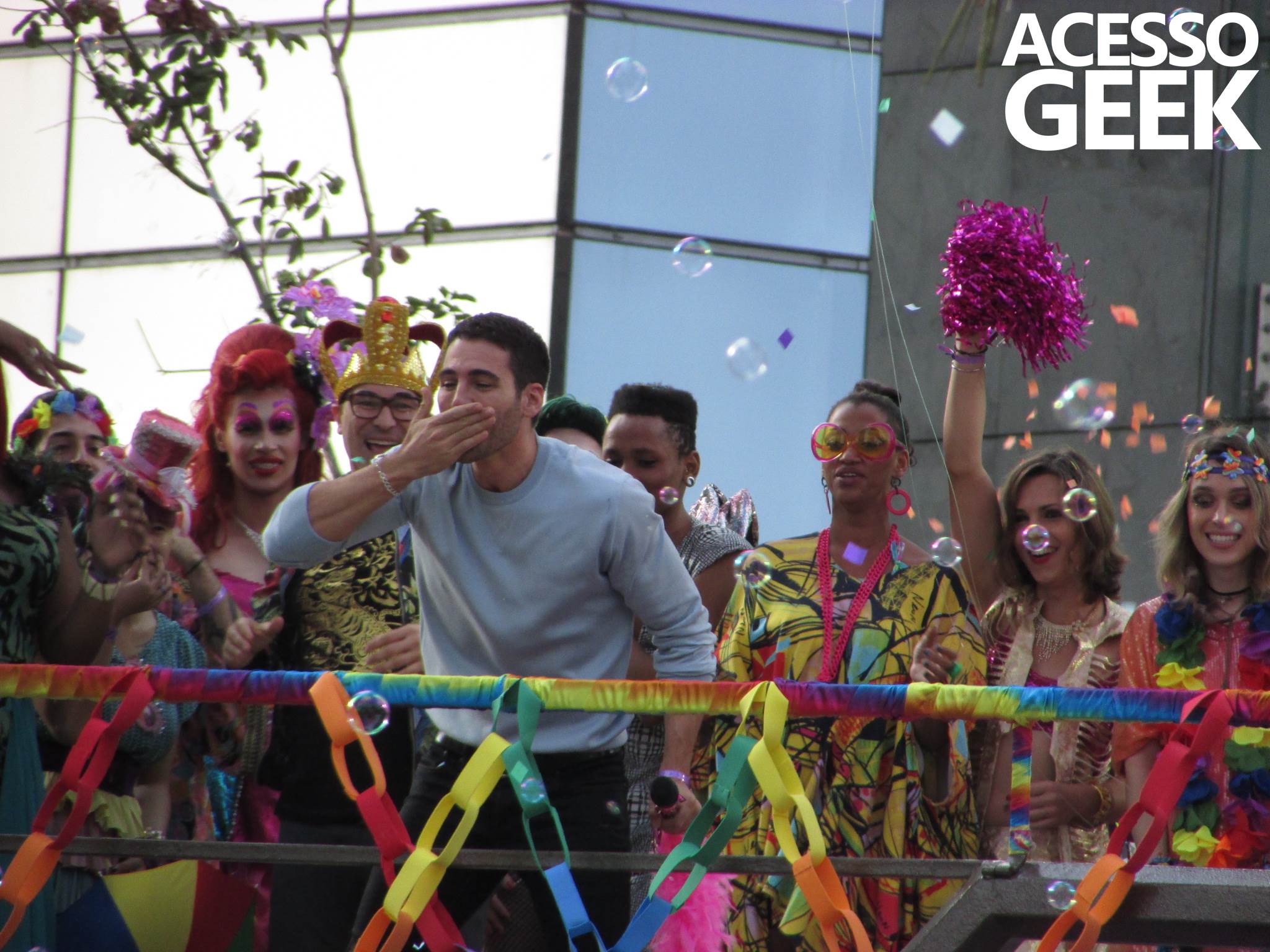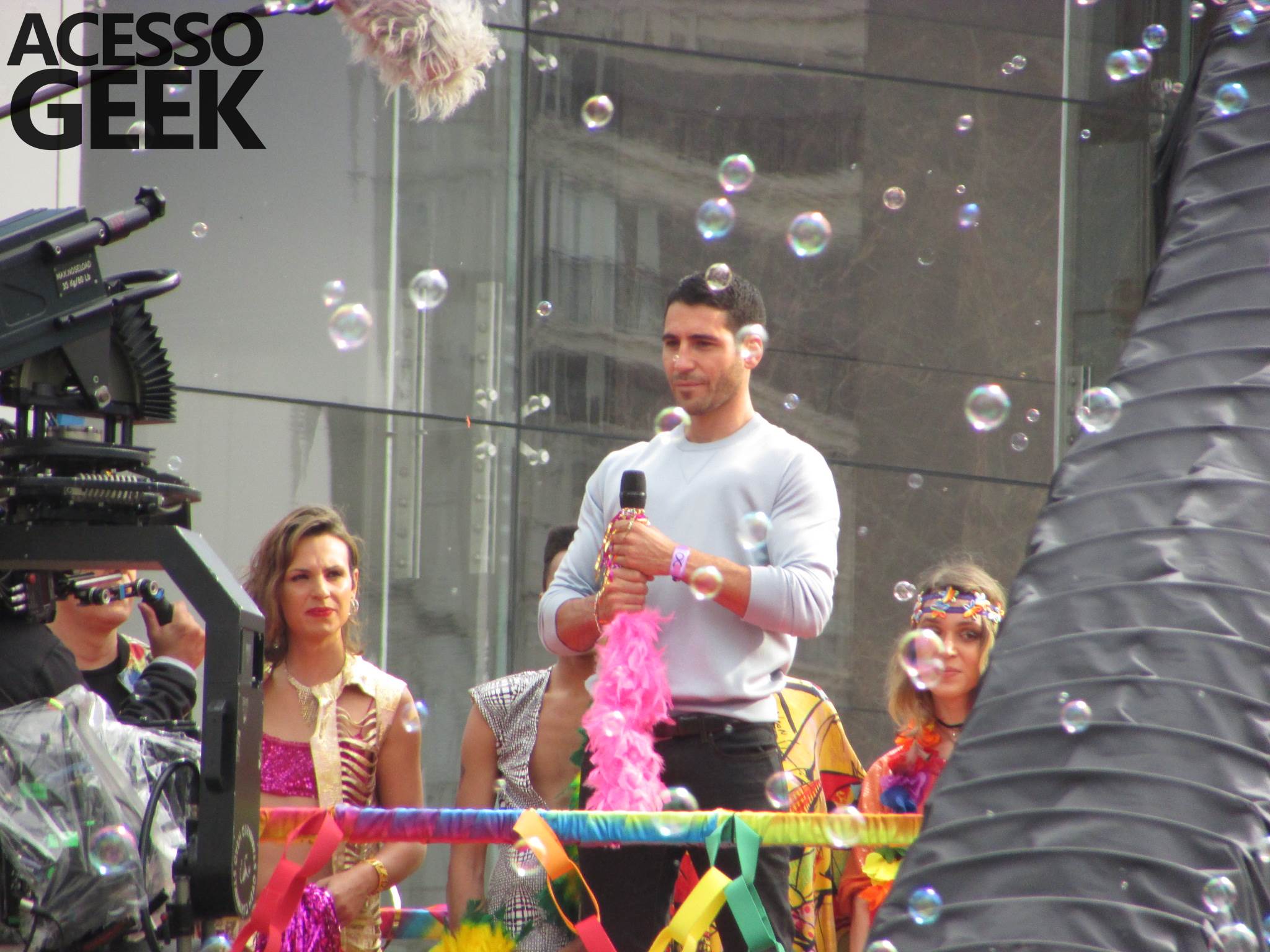 We had the opportunity to follow the recordings that happened last Saturday (28), at Avenida Chucri Zaidan, in São Paulo, more precisely next to the Shopping Morumbi. The producers of the serie, in association with O2 Filmes, mounted a “Trio Elétrico” (Trio Elétrico is the name given to a truck equipped with an extremely high powerful sound system and a musical group or some famous people and music on top of it), it was full of colorful balloons, representing the Gay Pride Parade, that happened on Sunday (28), at Paulista Avenue. Which was also the location of the recordings, as an extension of the recorded scene on Saturday.