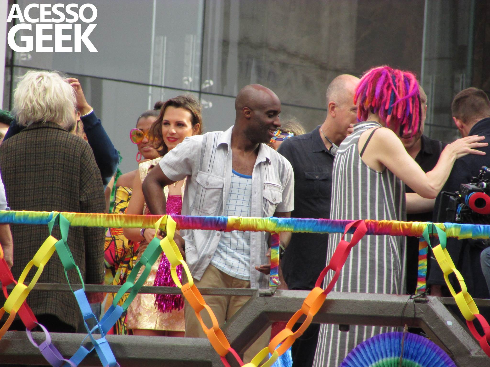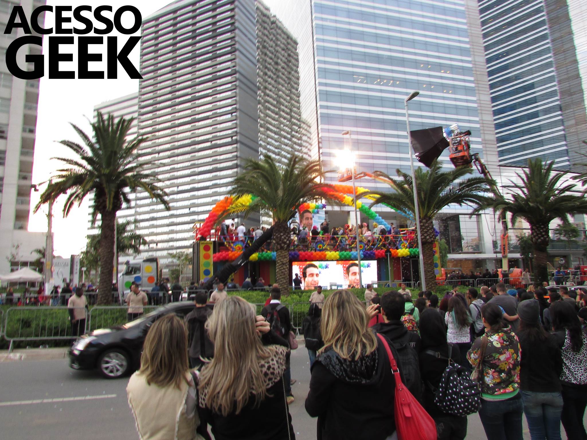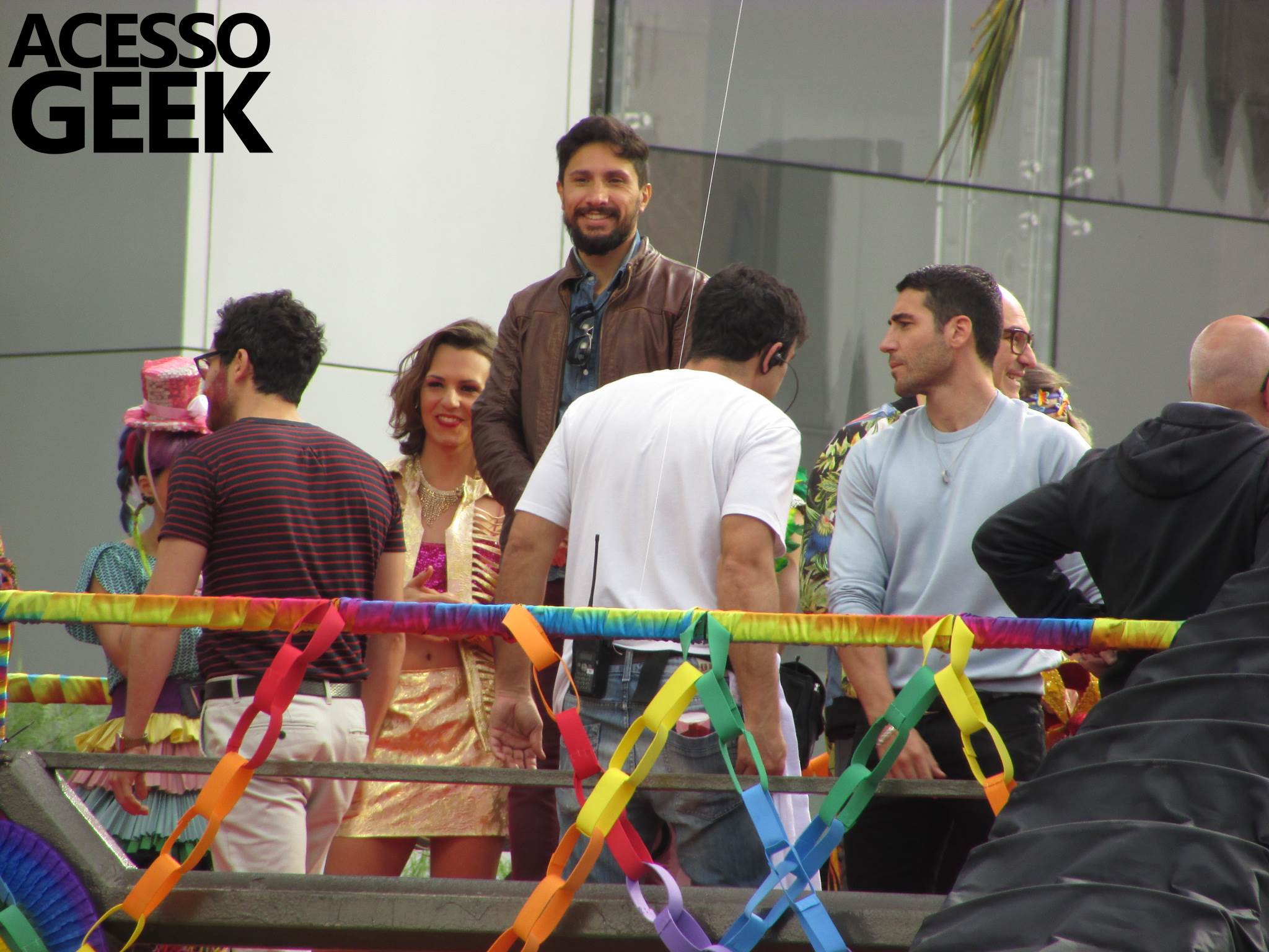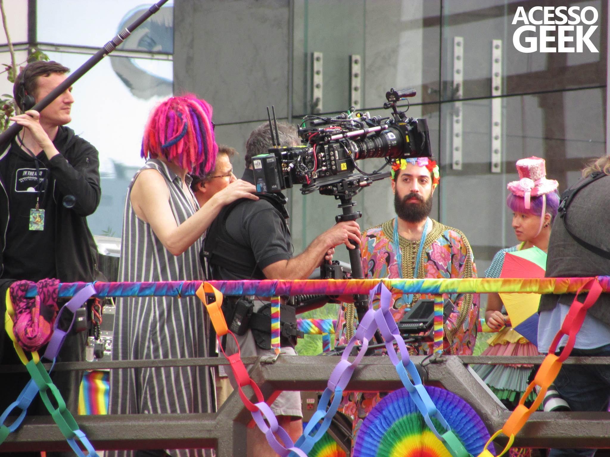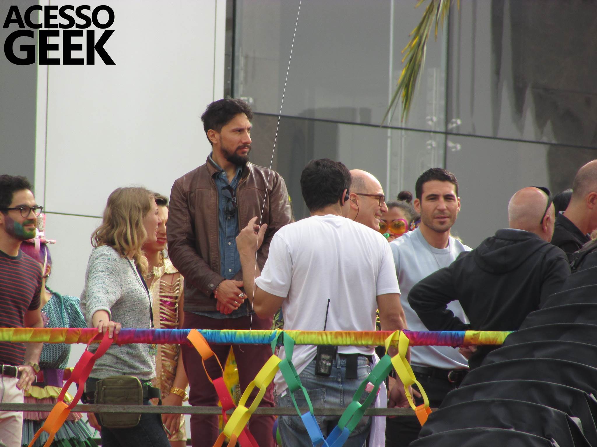 We had the opportunity to follow the recordings that happened last Saturday (28), at Avenida Chucri Zaidan, in São Paulo, more precisely next to the Shopping Morumbi. The producers of the serie, in association with O2 Filmes, mounted a “Trio Elétrico” (Trio Elétrico is the name given to a truck equipped with an extremely high powerful sound system and a musical group or some famous people and music on top of it), it was full of colorful balloons, representing the Gay Pride Parade, that happened on Sunday (28), at Paulista Avenue. Which was also the location of the recordings, as an extension of the recorded scene on Saturday.