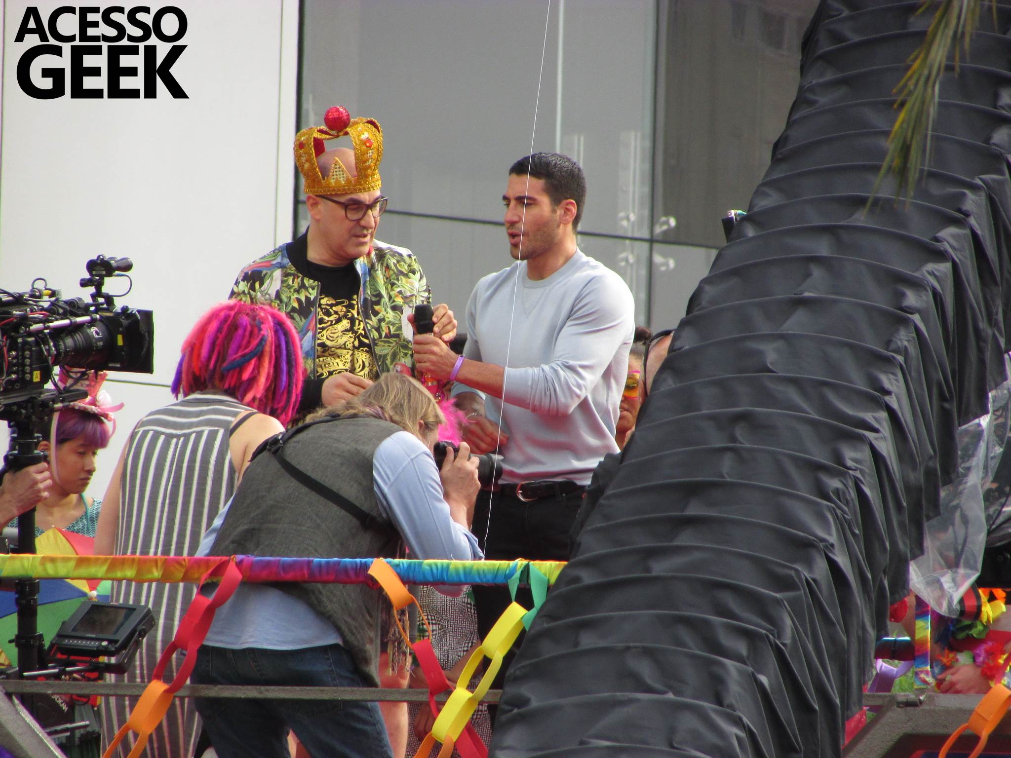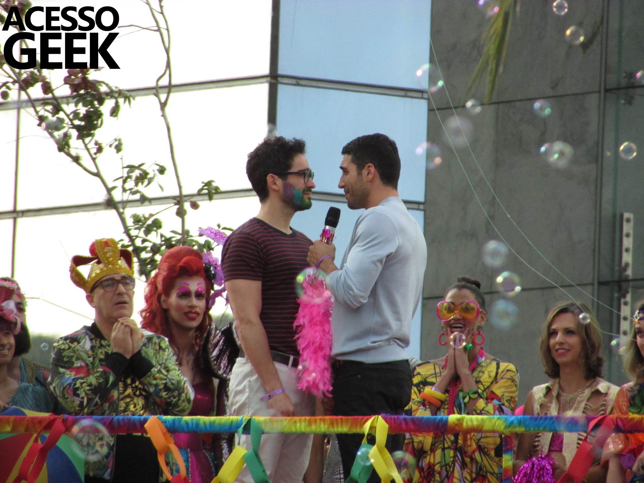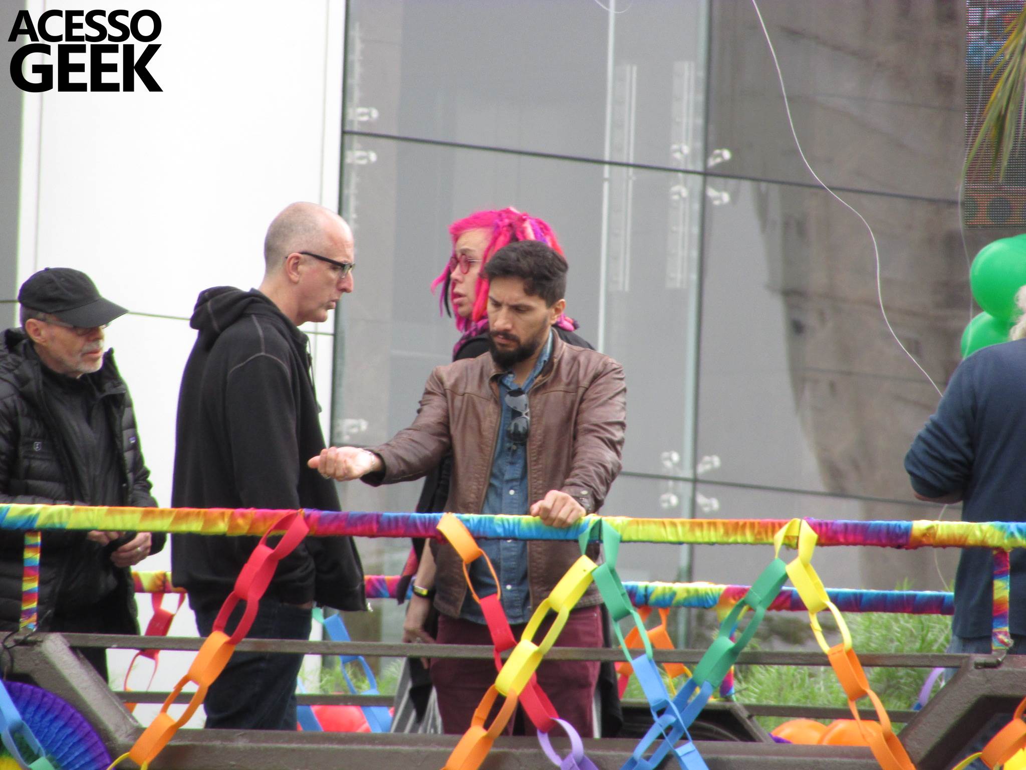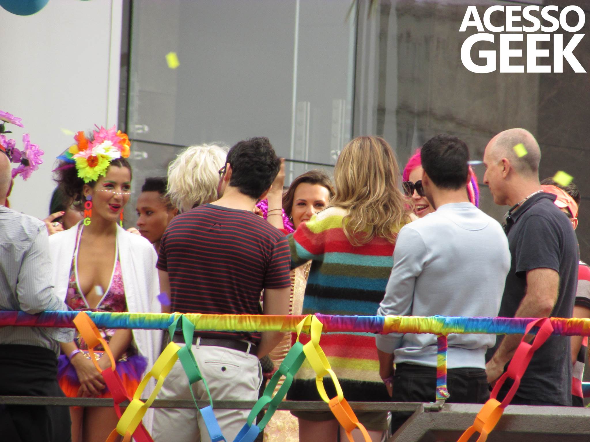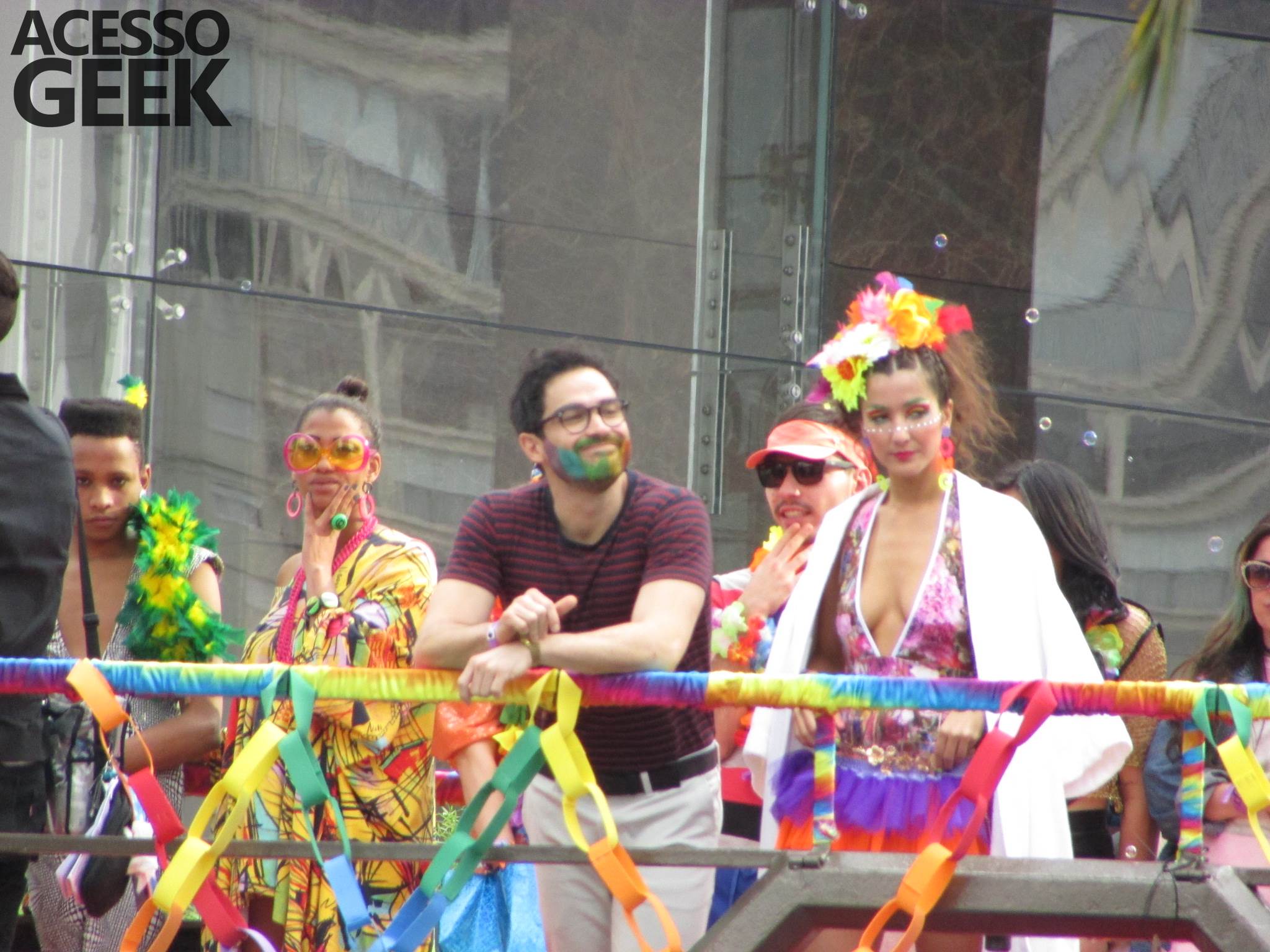 We had the opportunity to follow the recordings that happened last Saturday (28), at Avenida Chucri Zaidan, in São Paulo, more precisely next to the Shopping Morumbi. The producers of the serie, in association with O2 Filmes, mounted a “Trio Elétrico” (Trio Elétrico is the name given to a truck equipped with an extremely high powerful sound system and a musical group or some famous people and music on top of it), it was full of colorful balloons, representing the Gay Pride Parade, that happened on Sunday (28), at Paulista Avenue. Which was also the location of the recordings, as an extension of the recorded scene on Saturday.