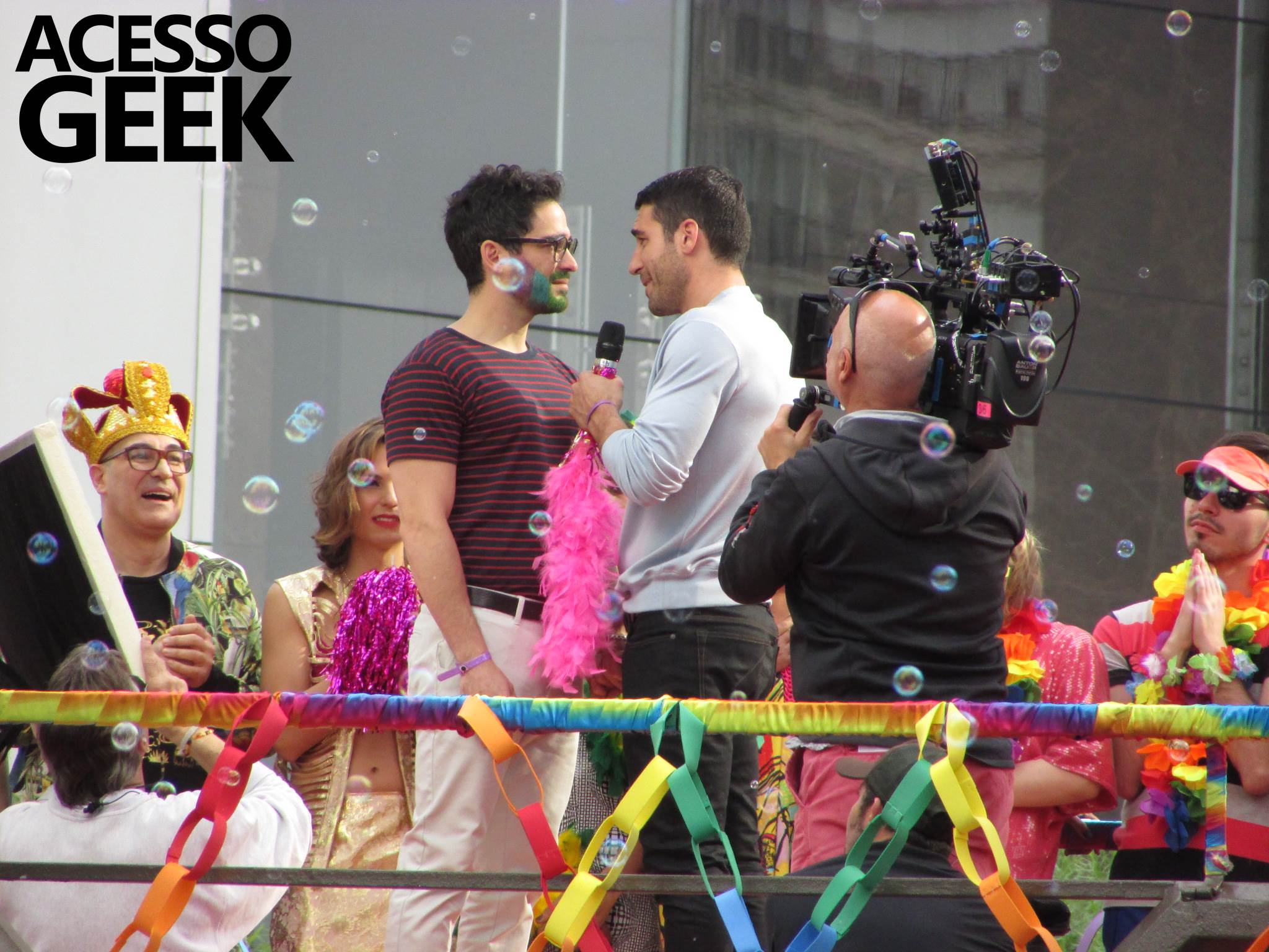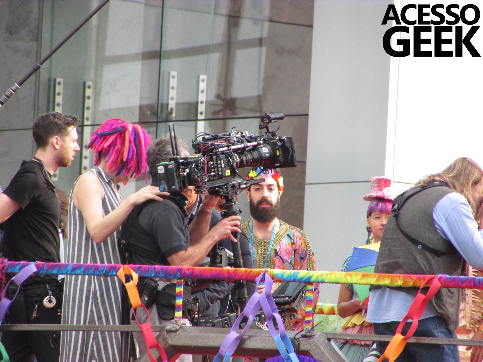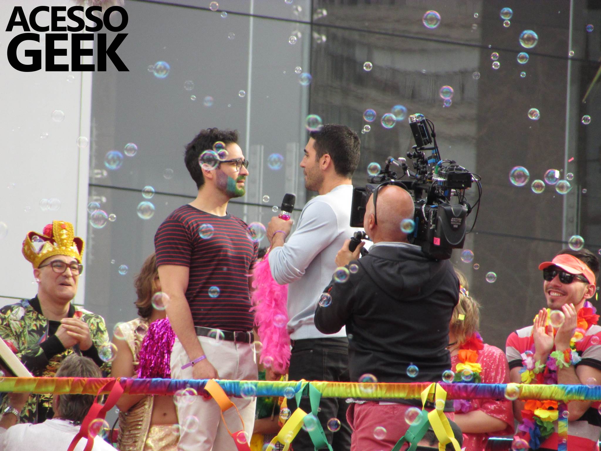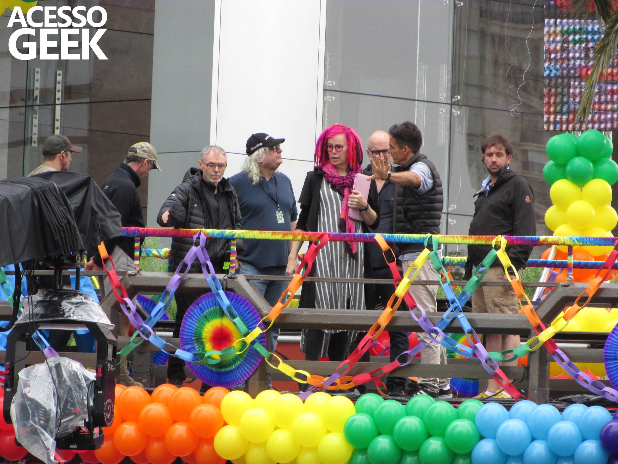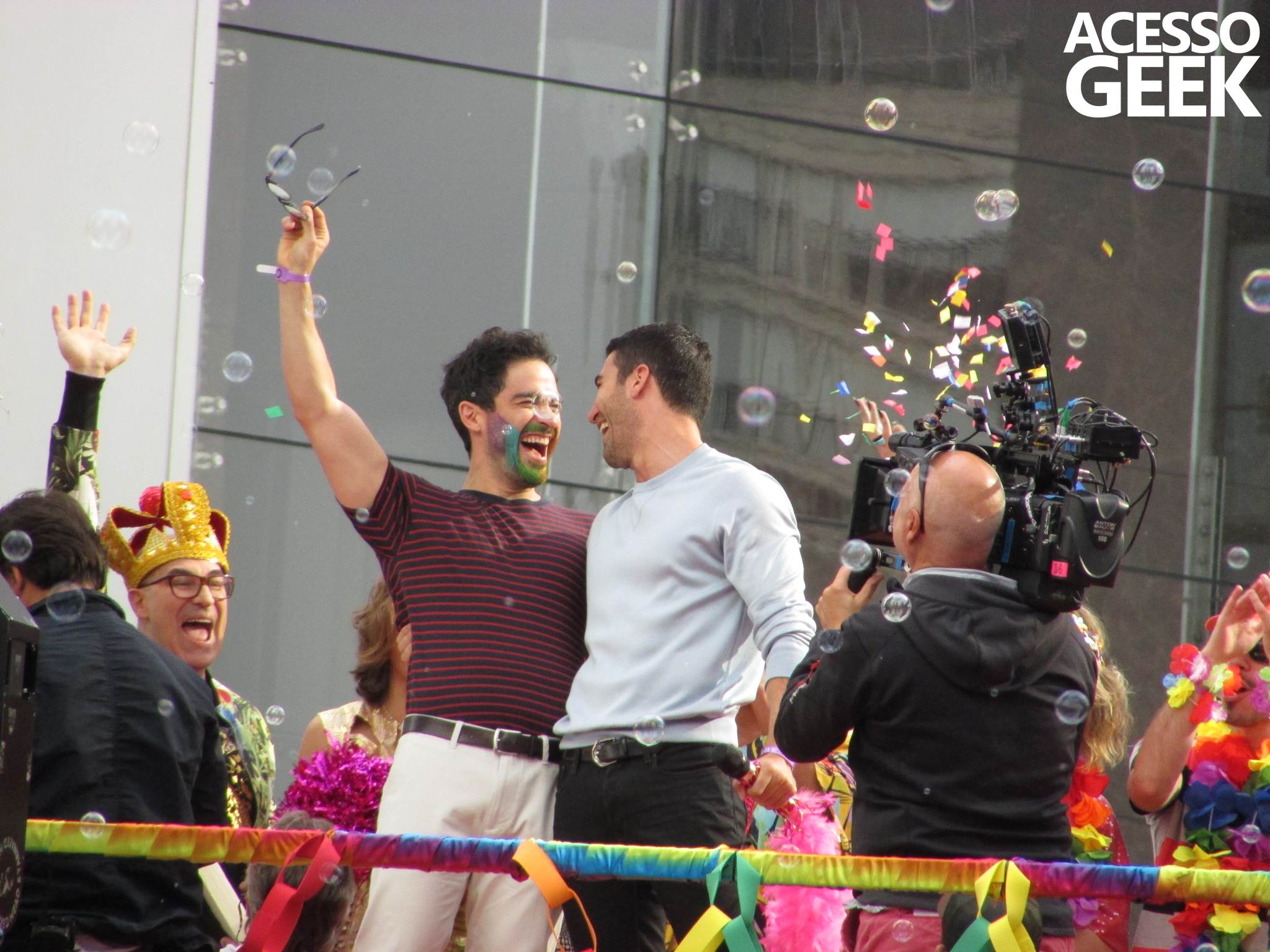 We had the opportunity to follow the recordings that happened last Saturday (28), at Avenida Chucri Zaidan, in São Paulo, more precisely next to the Shopping Morumbi. The producers of the serie, in association with O2 Filmes, mounted a “Trio Elétrico” (Trio Elétrico is the name given to a truck equipped with an extremely high powerful sound system and a musical group or some famous people and music on top of it), it was full of colorful balloons, representing the Gay Pride Parade, that happened on Sunday (28), at Paulista Avenue. Which was also the location of the recordings, as an extension of the recorded scene on Saturday.