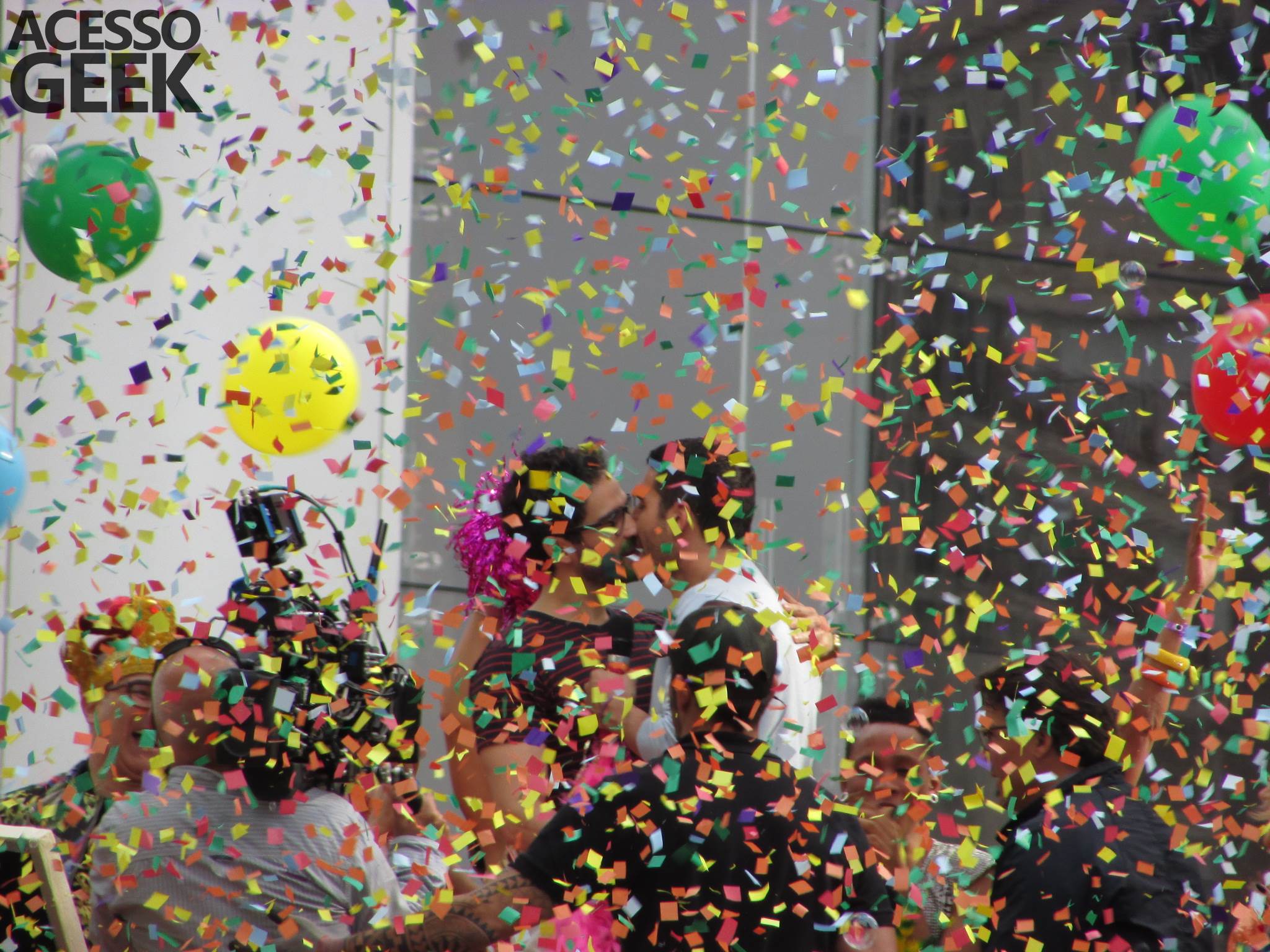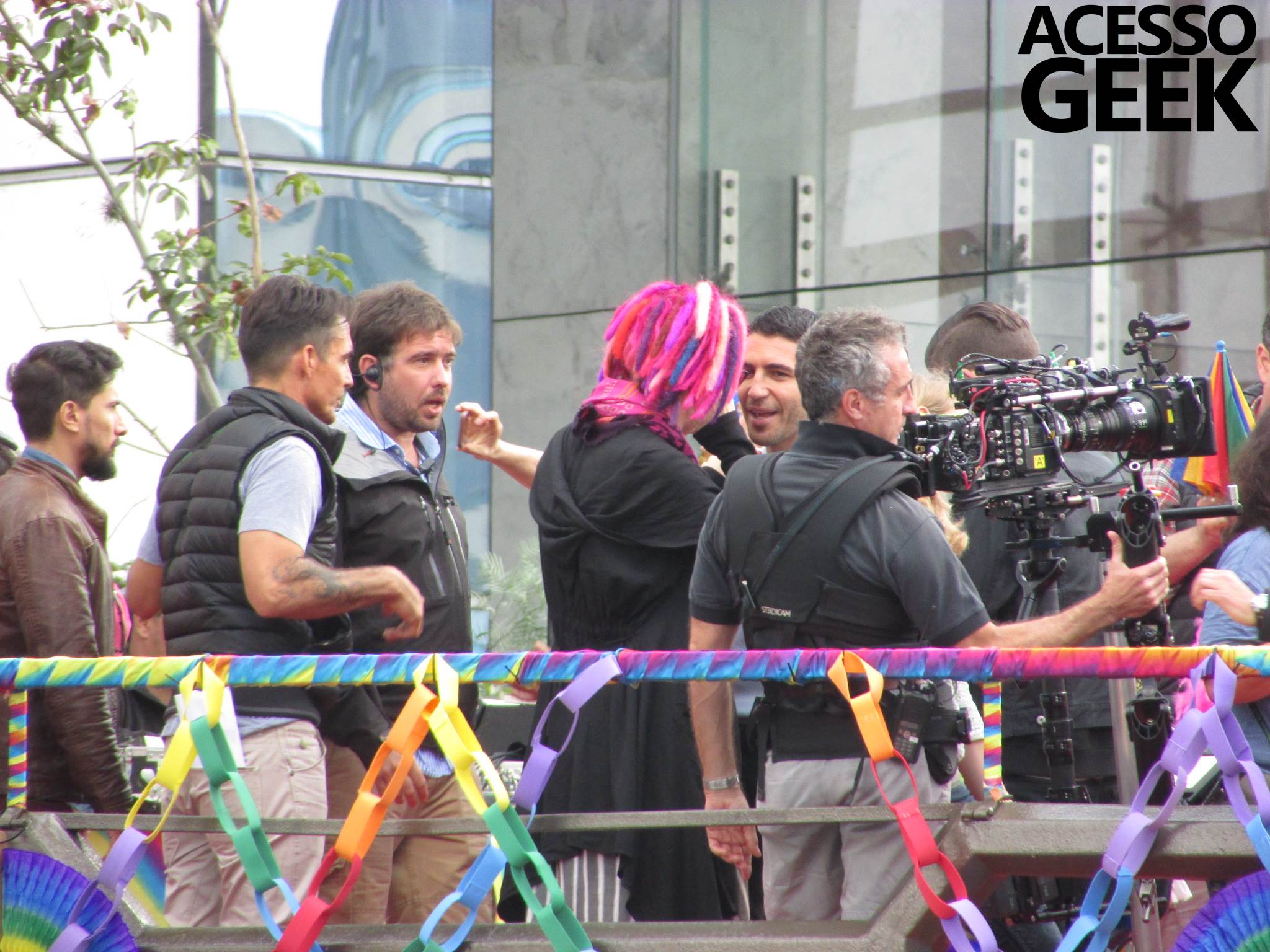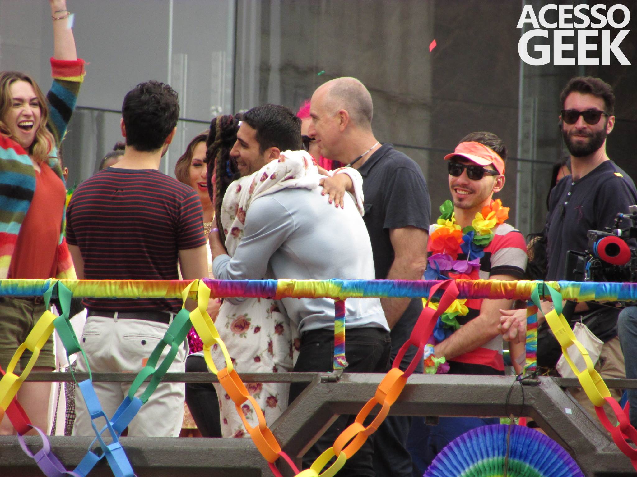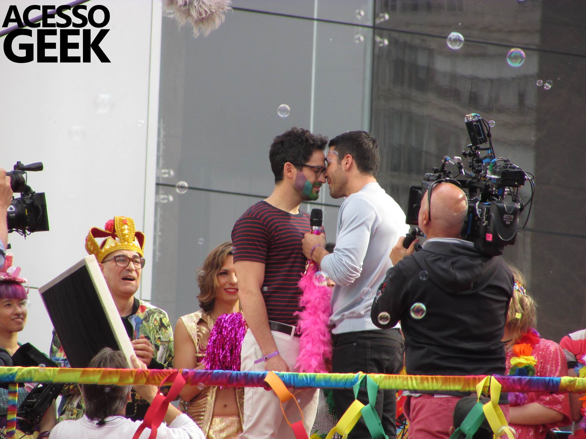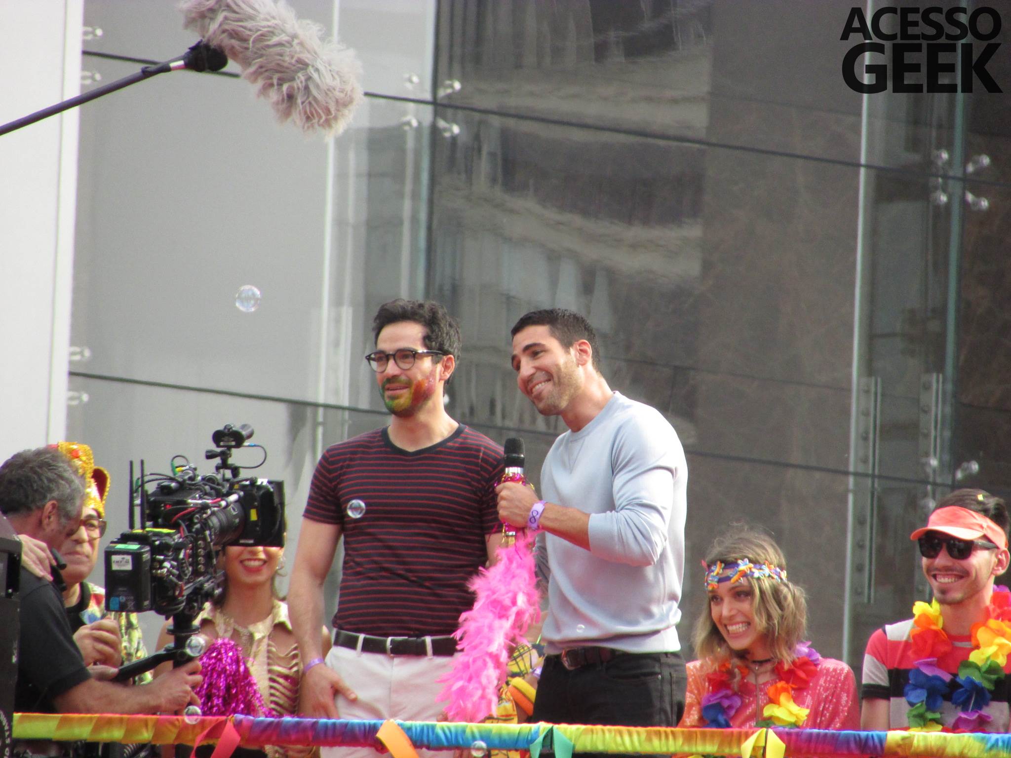We had the opportunity to follow the recordings that happened last Saturday (28), at Avenida Chucri Zaidan, in São Paulo, more precisely next to the Shopping Morumbi. The producers of the serie, in association with O2 Filmes, mounted a “Trio Elétrico” (Trio Elétrico is the name given to a truck equipped with an extremely high powerful sound system and a musical group or some famous people and music on top of it), it was full of colorful balloons, representing the Gay Pride Parade, that happened on Sunday (28), at Paulista Avenue. Which was also the location of the recordings, as an extension of the recorded scene on Saturday.