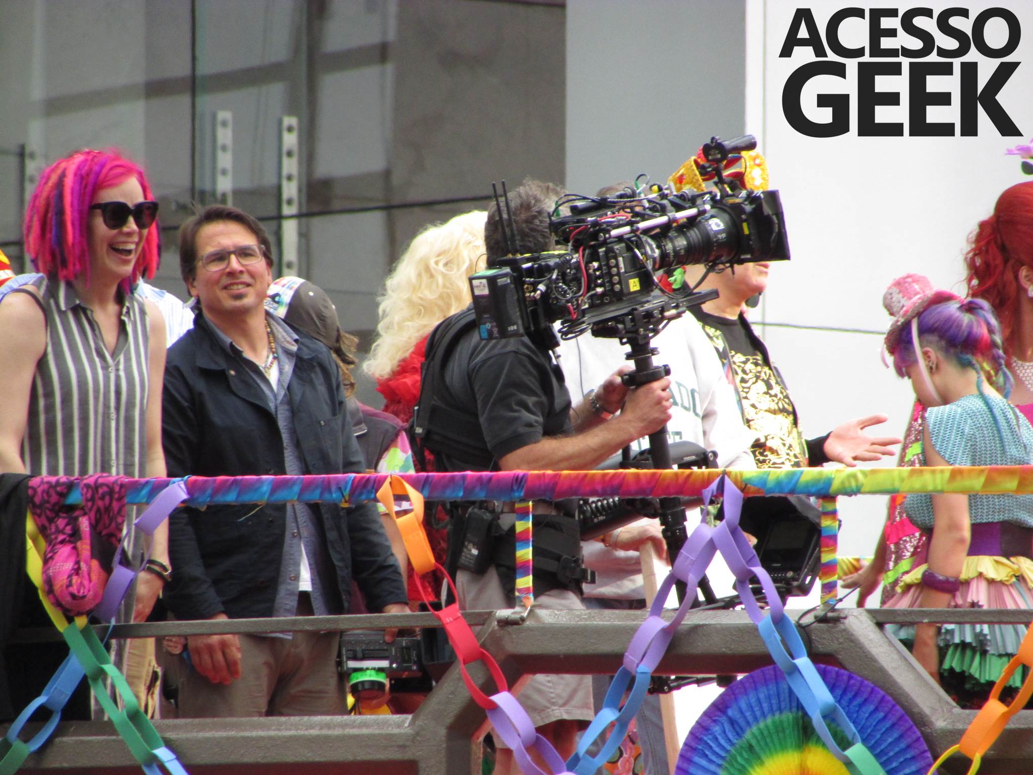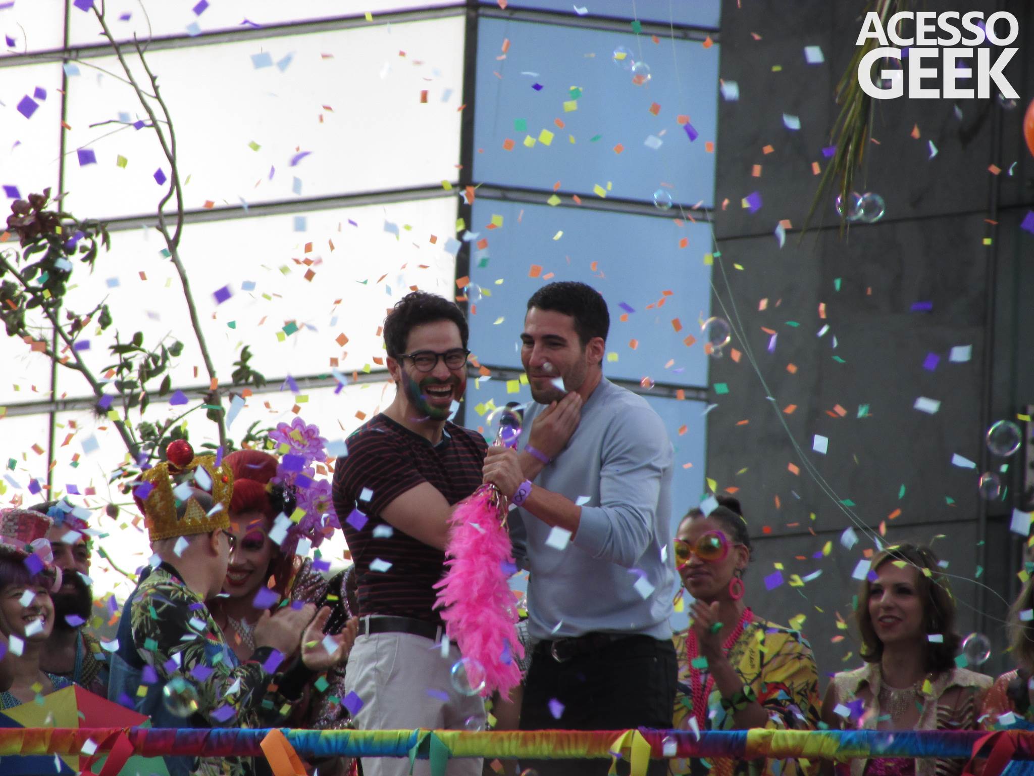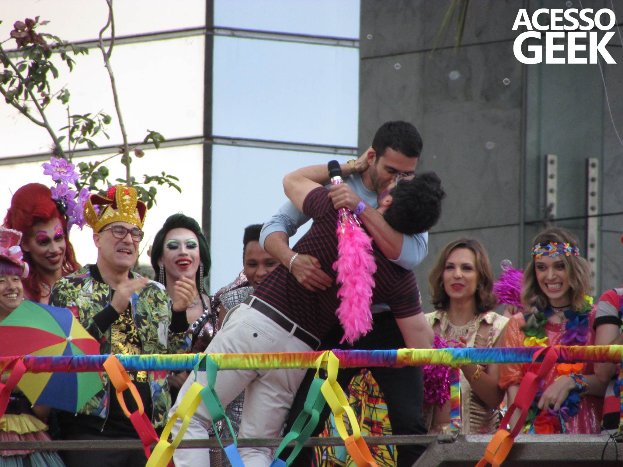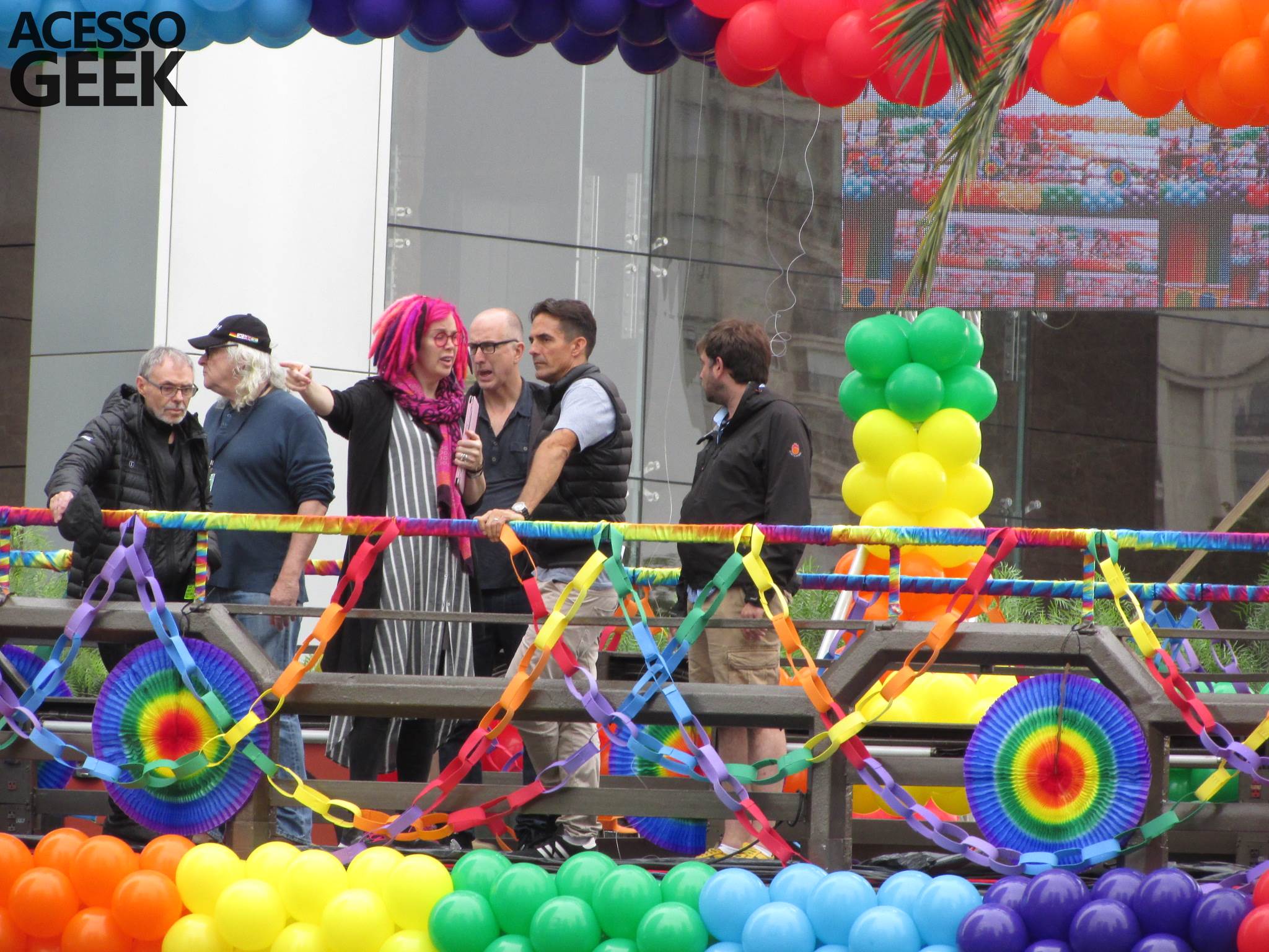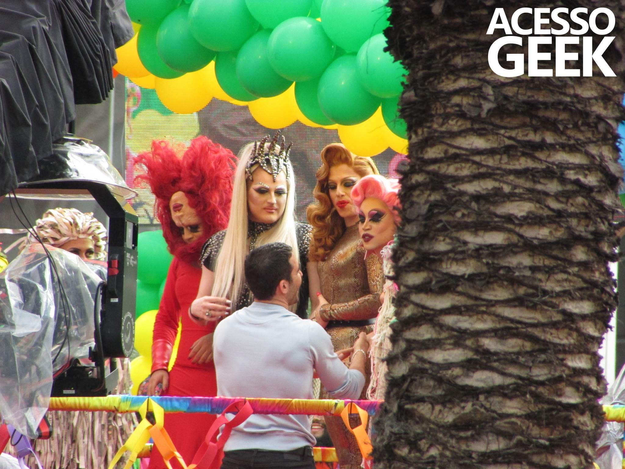 We had the opportunity to follow the recordings that happened last Saturday (28), at Avenida Chucri Zaidan, in São Paulo, more precisely next to the Shopping Morumbi. The producers of the serie, in association with O2 Filmes, mounted a “Trio Elétrico” (Trio Elétrico is the name given to a truck equipped with an extremely high powerful sound system and a musical group or some famous people and music on top of it), it was full of colorful balloons, representing the Gay Pride Parade, that happened on Sunday (28), at Paulista Avenue. Which was also the location of the recordings, as an extension of the recorded scene on Saturday.
