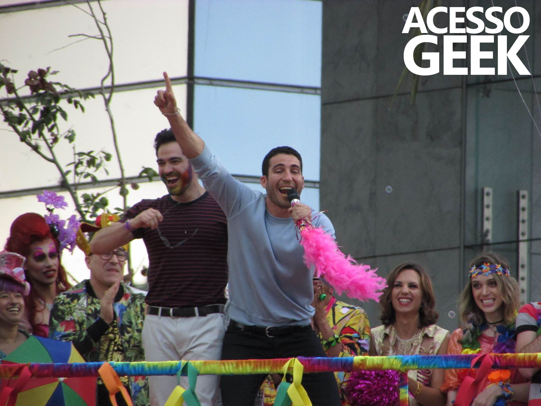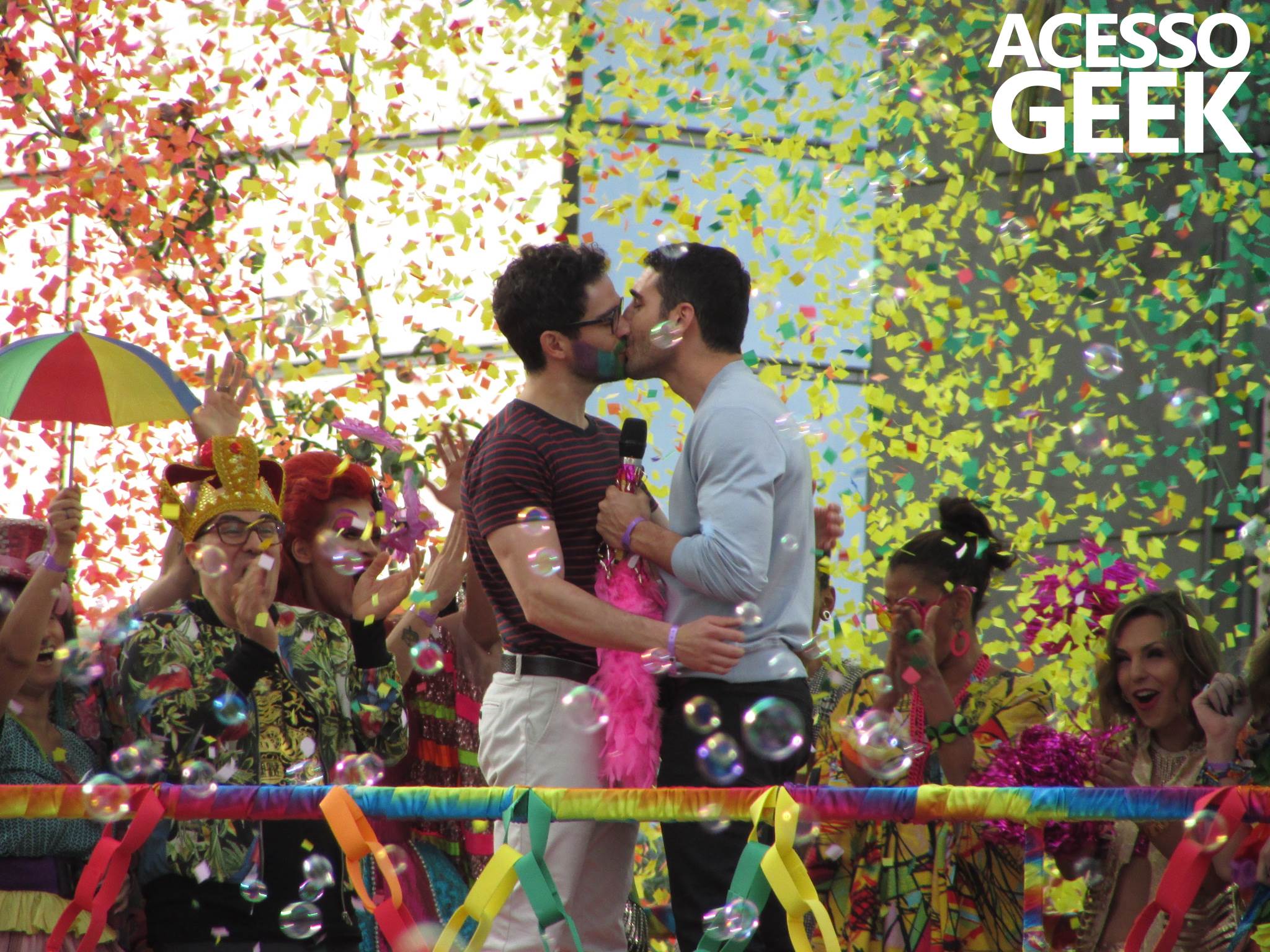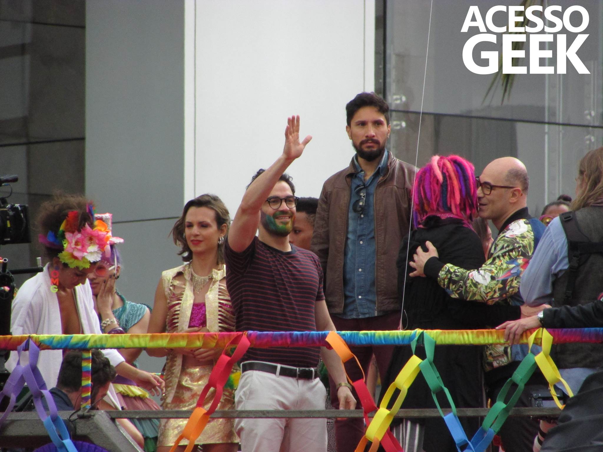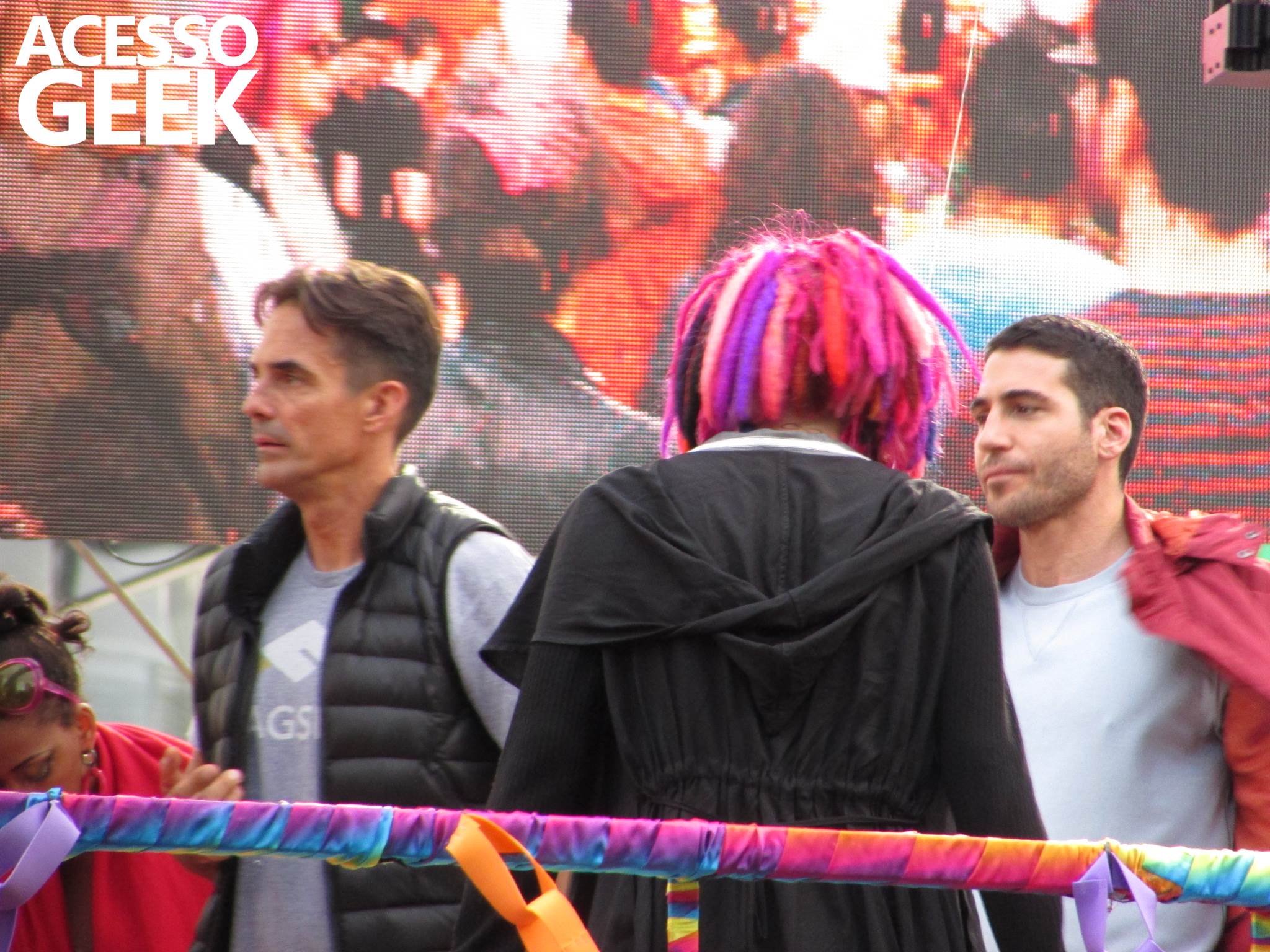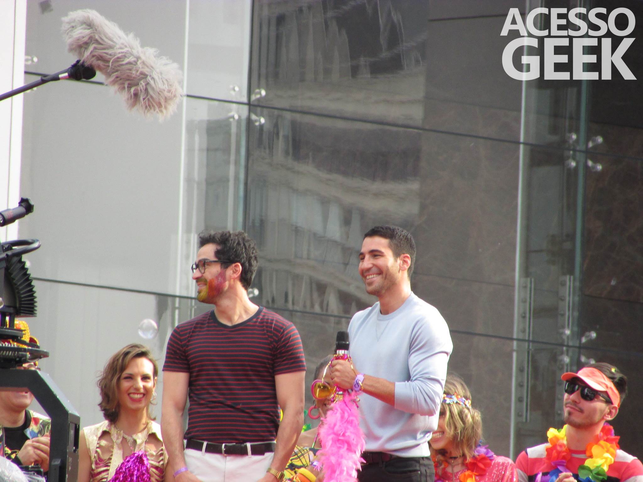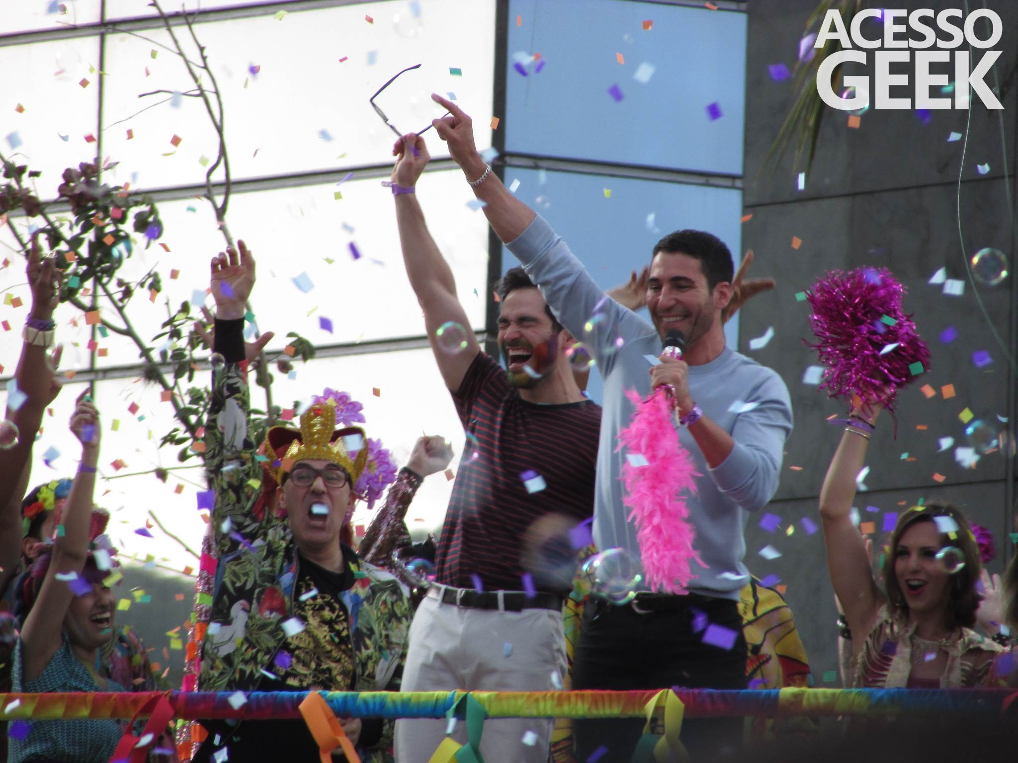 We had the opportunity to follow the recordings that happened last Saturday (28), at Avenida Chucri Zaidan, in São Paulo, more precisely next to the Shopping Morumbi. The producers of the serie, in association with O2 Filmes, mounted a “Trio Elétrico” (Trio Elétrico is the name given to a truck equipped with an extremely high powerful sound system and a musical group or some famous people and music on top of it), it was full of colorful balloons, representing the Gay Pride Parade, that happened on Sunday (28), at Paulista Avenue. Which was also the location of the recordings, as an extension of the recorded scene on Saturday.