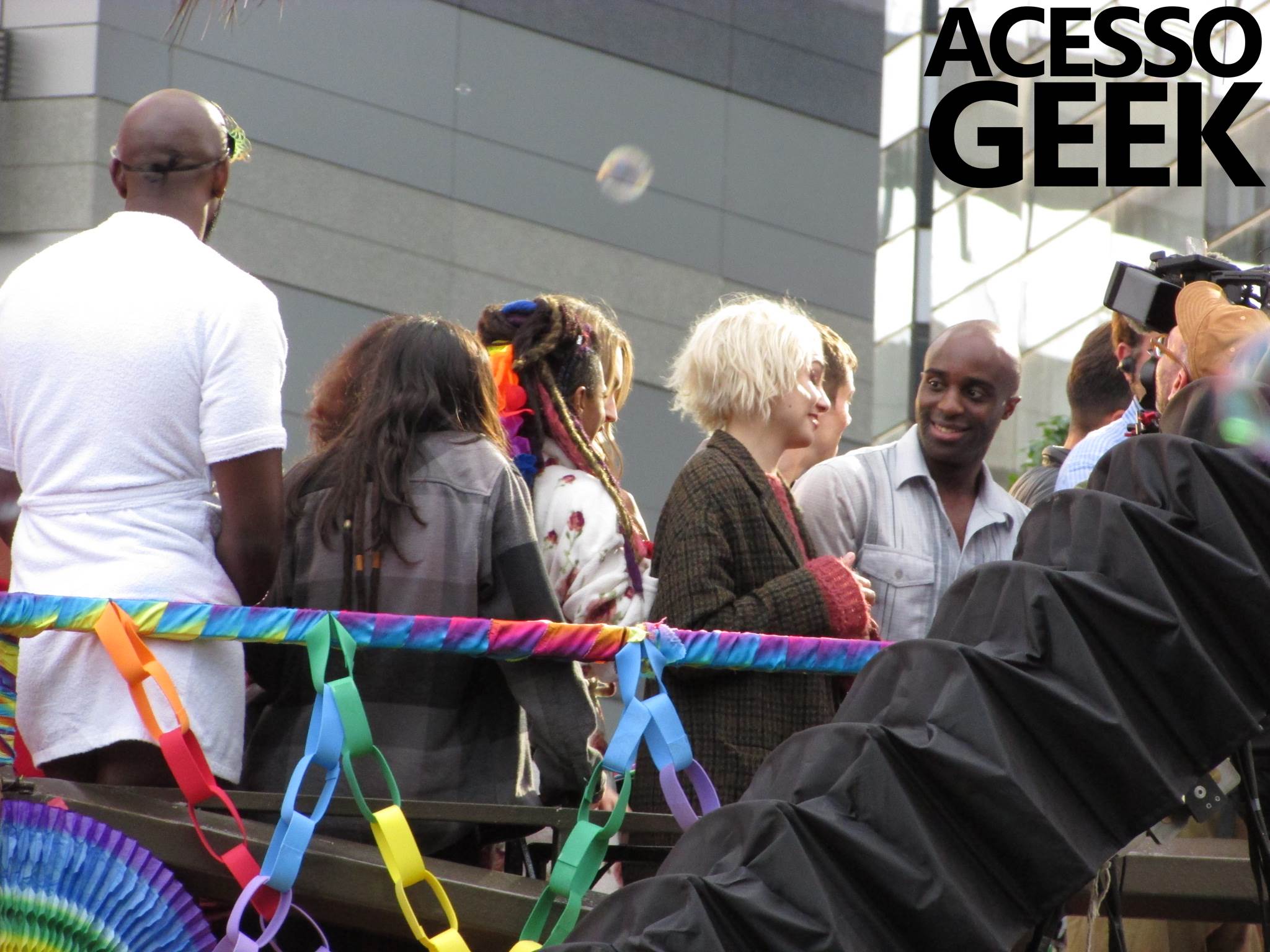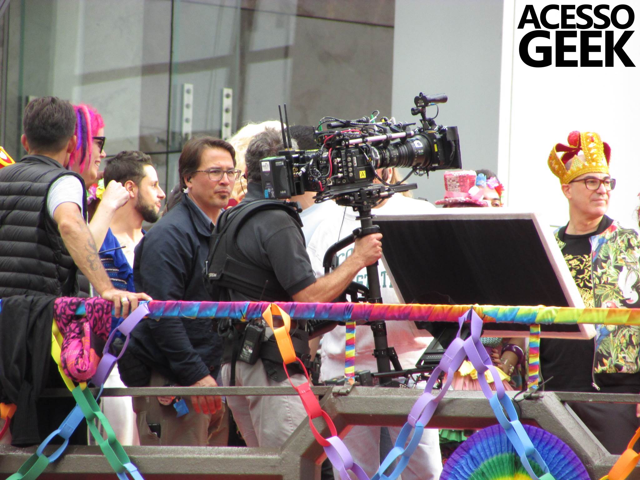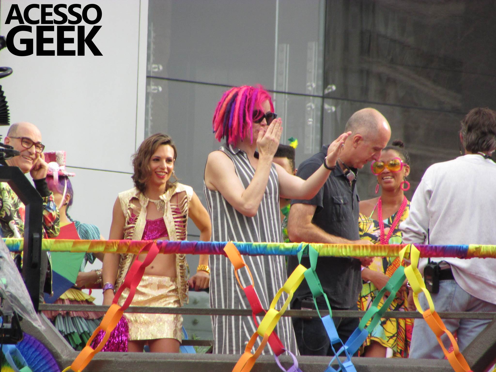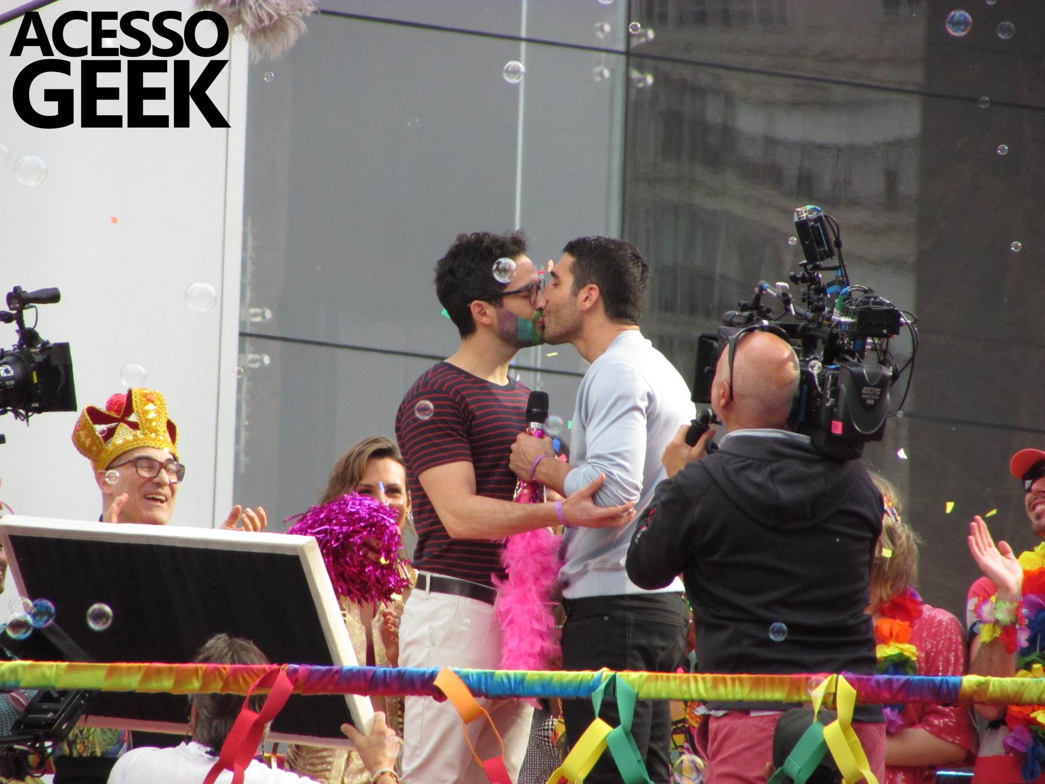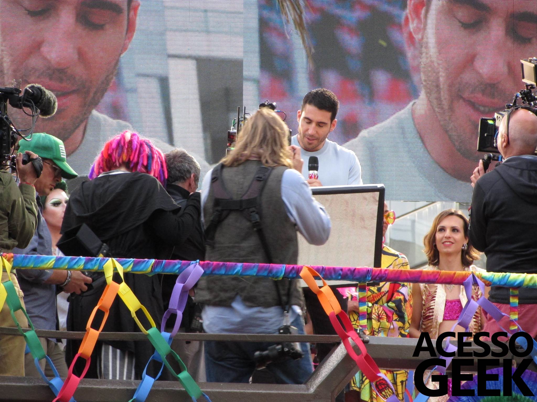 We had the opportunity to follow the recordings that happened last Saturday (28), at Avenida Chucri Zaidan, in São Paulo, more precisely next to the Shopping Morumbi. The producers of the serie, in association with O2 Filmes, mounted a “Trio Elétrico” (Trio Elétrico is the name given to a truck equipped with an extremely high powerful sound system and a musical group or some famous people and music on top of it), it was full of colorful balloons, representing the Gay Pride Parade, that happened on Sunday (28), at Paulista Avenue. Which was also the location of the recordings, as an extension of the recorded scene on Saturday.