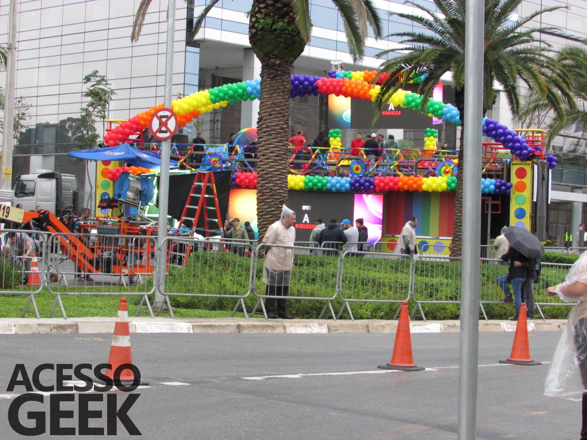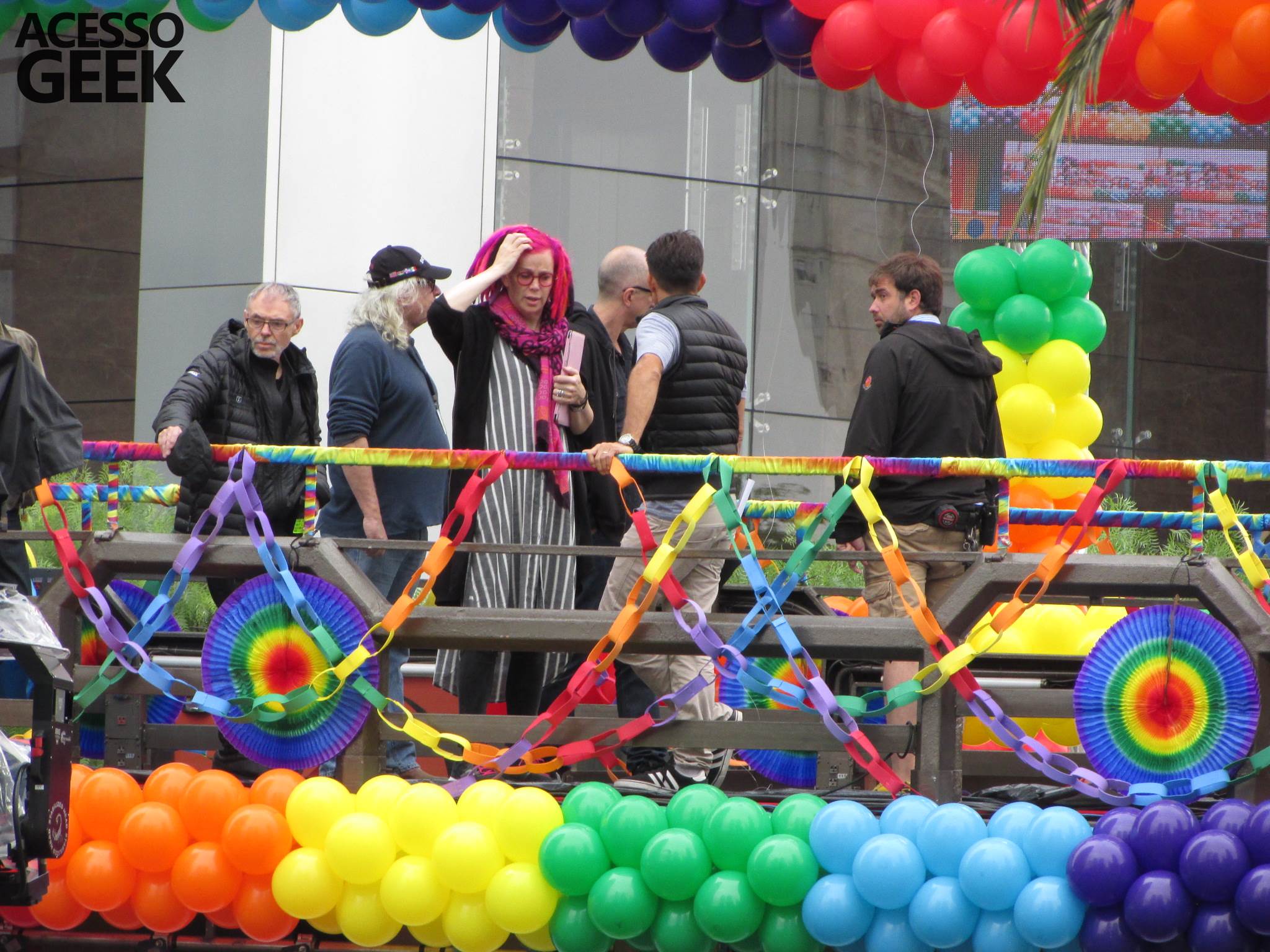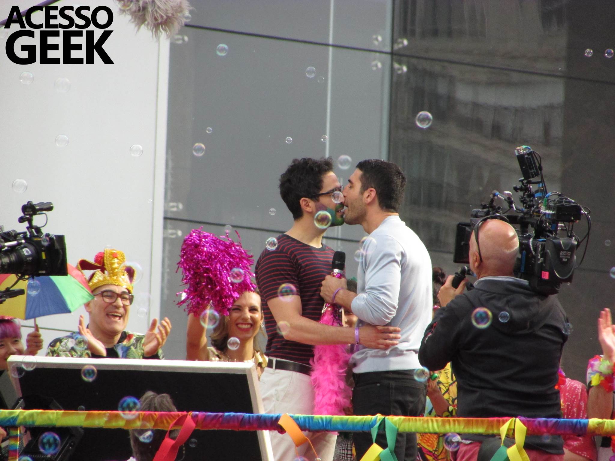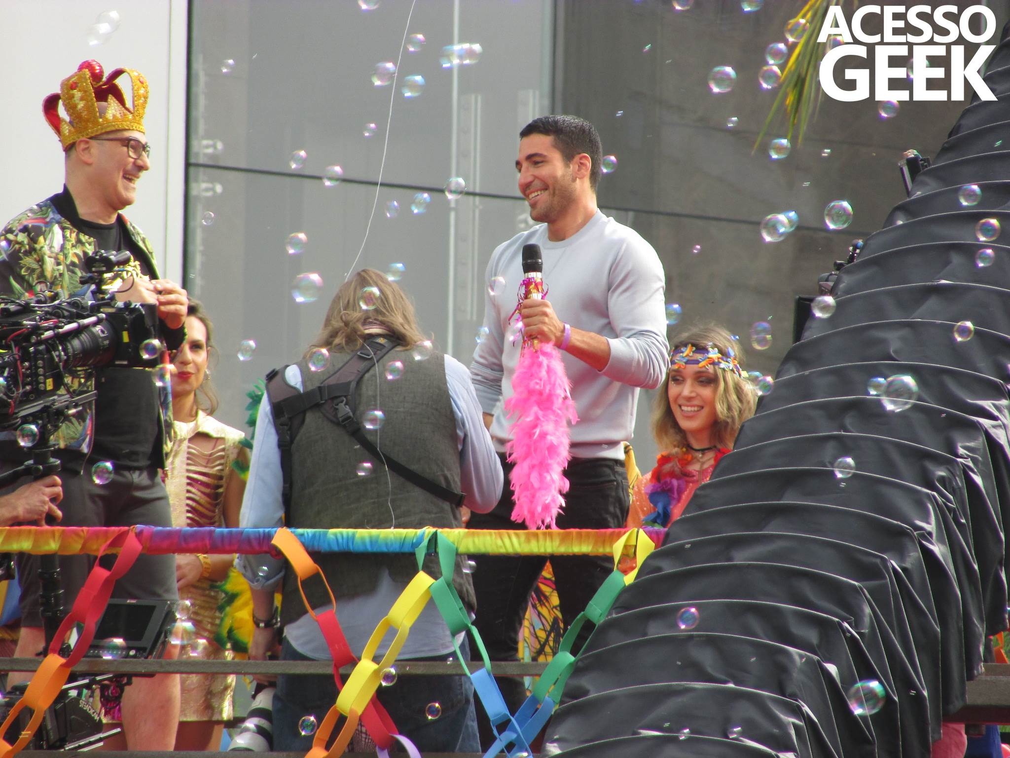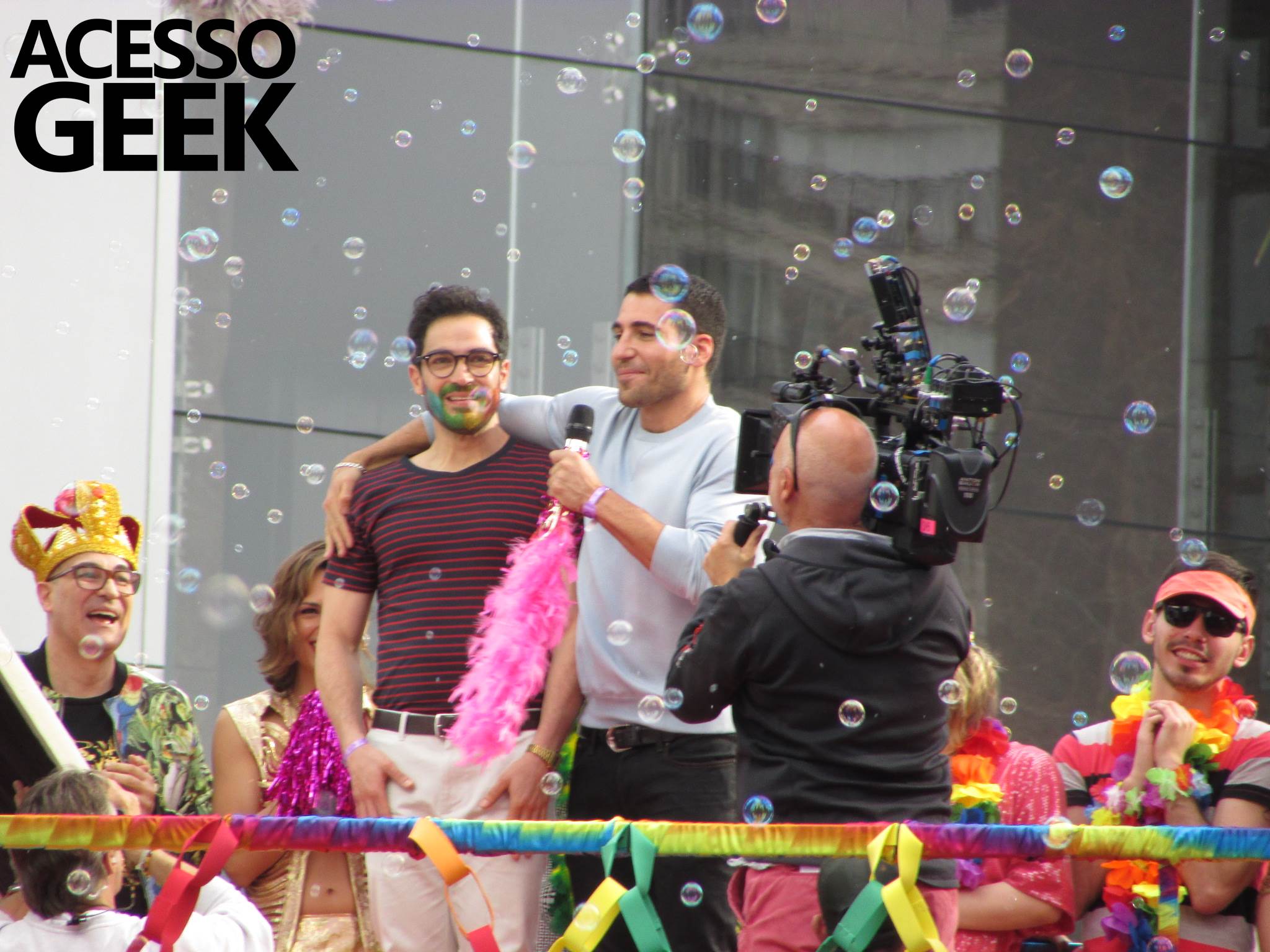 We had the opportunity to follow the recordings that happened last Saturday (28), at Avenida Chucri Zaidan, in São Paulo, more precisely next to the Shopping Morumbi. The producers of the serie, in association with O2 Filmes, mounted a “Trio Elétrico” (Trio Elétrico is the name given to a truck equipped with an extremely high powerful sound system and a musical group or some famous people and music on top of it), it was full of colorful balloons, representing the Gay Pride Parade, that happened on Sunday (28), at Paulista Avenue. Which was also the location of the recordings, as an extension of the recorded scene on Saturday.