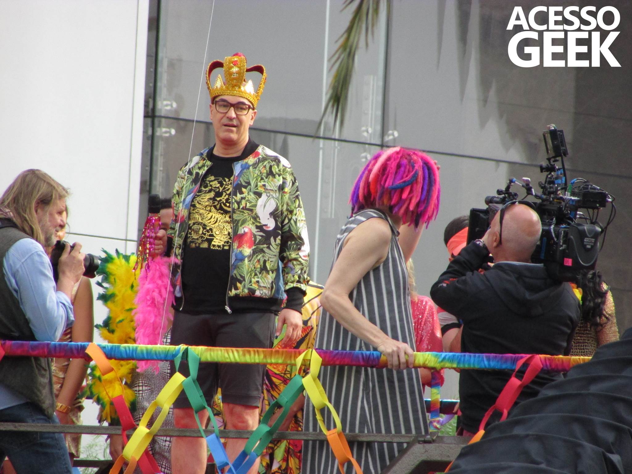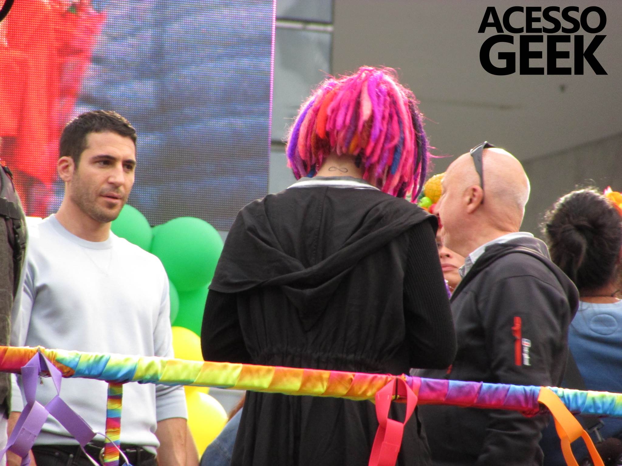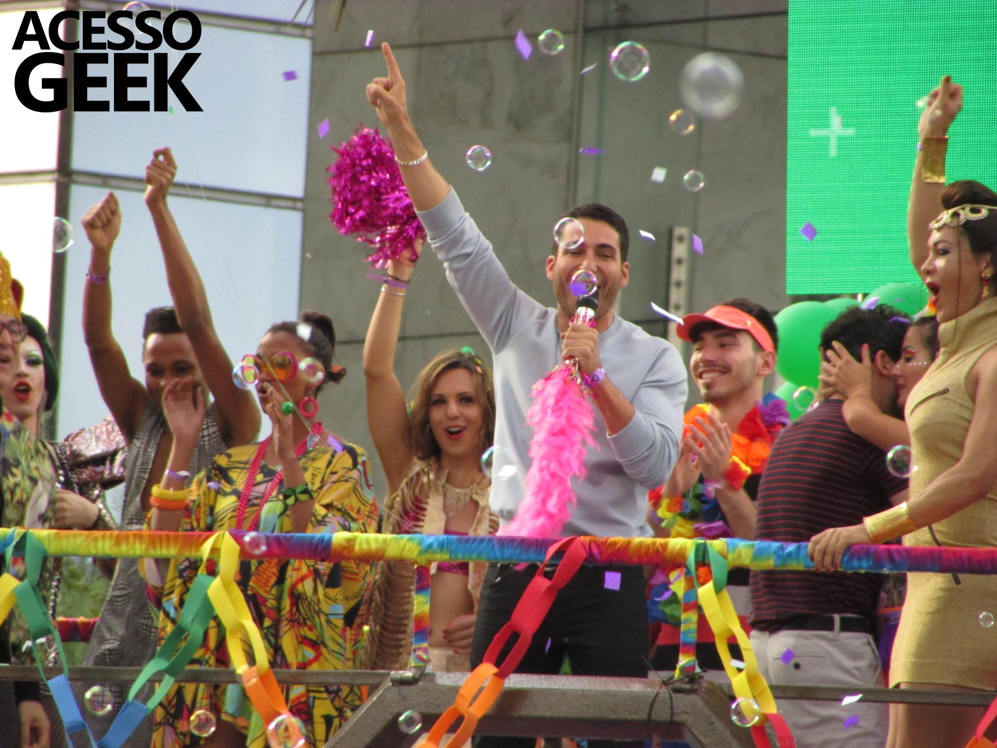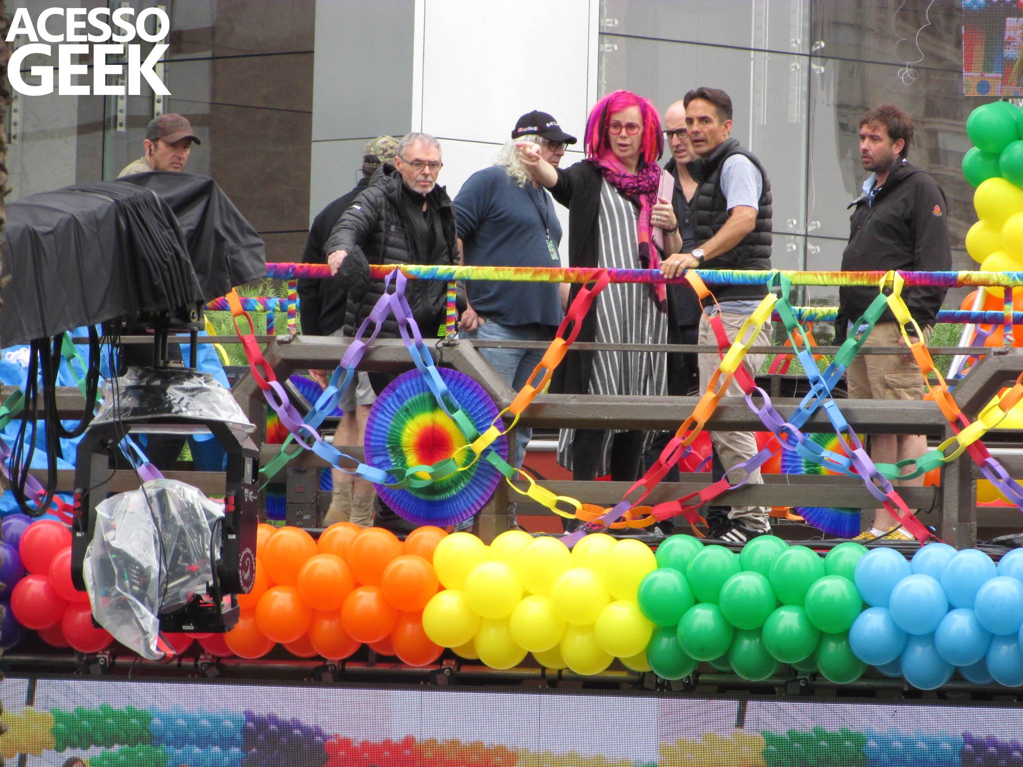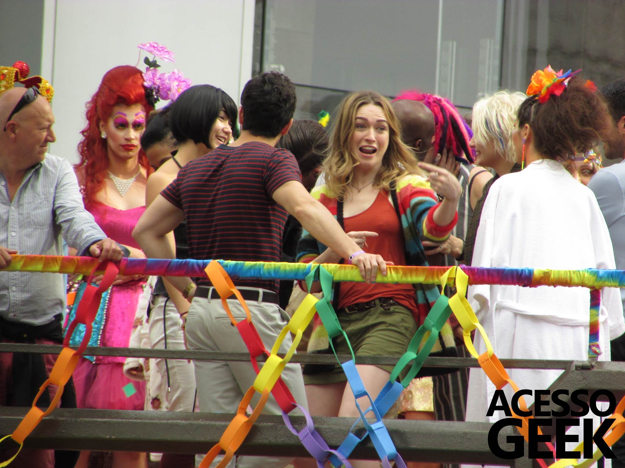 We had the opportunity to follow the recordings that happened last Saturday (28), at Avenida Chucri Zaidan, in São Paulo, more precisely next to the Shopping Morumbi. The producers of the serie, in association with O2 Filmes, mounted a “Trio Elétrico” (Trio Elétrico is the name given to a truck equipped with an extremely high powerful sound system and a musical group or some famous people and music on top of it), it was full of colorful balloons, representing the Gay Pride Parade, that happened on Sunday (28), at Paulista Avenue. Which was also the location of the recordings, as an extension of the recorded scene on Saturday.