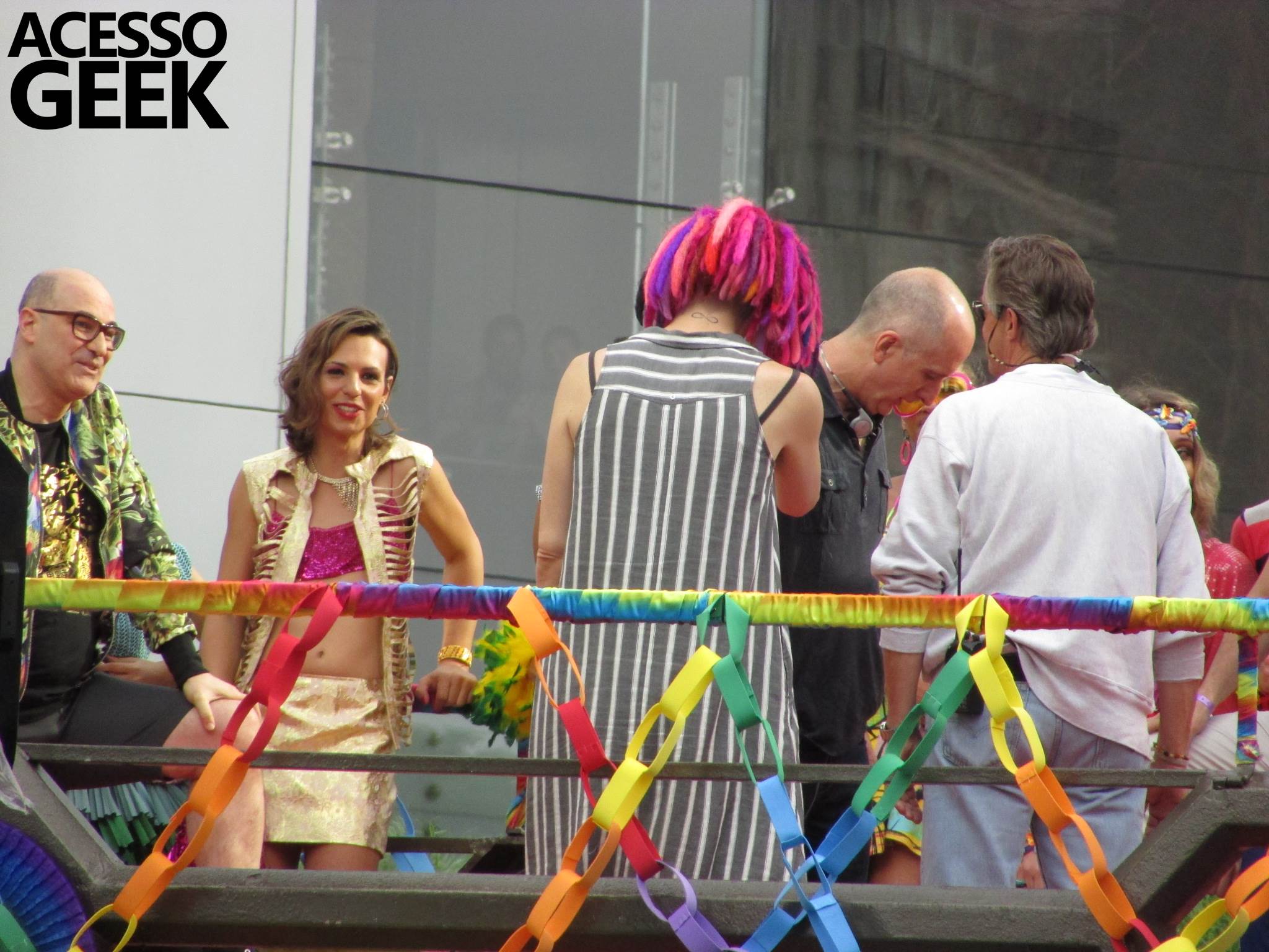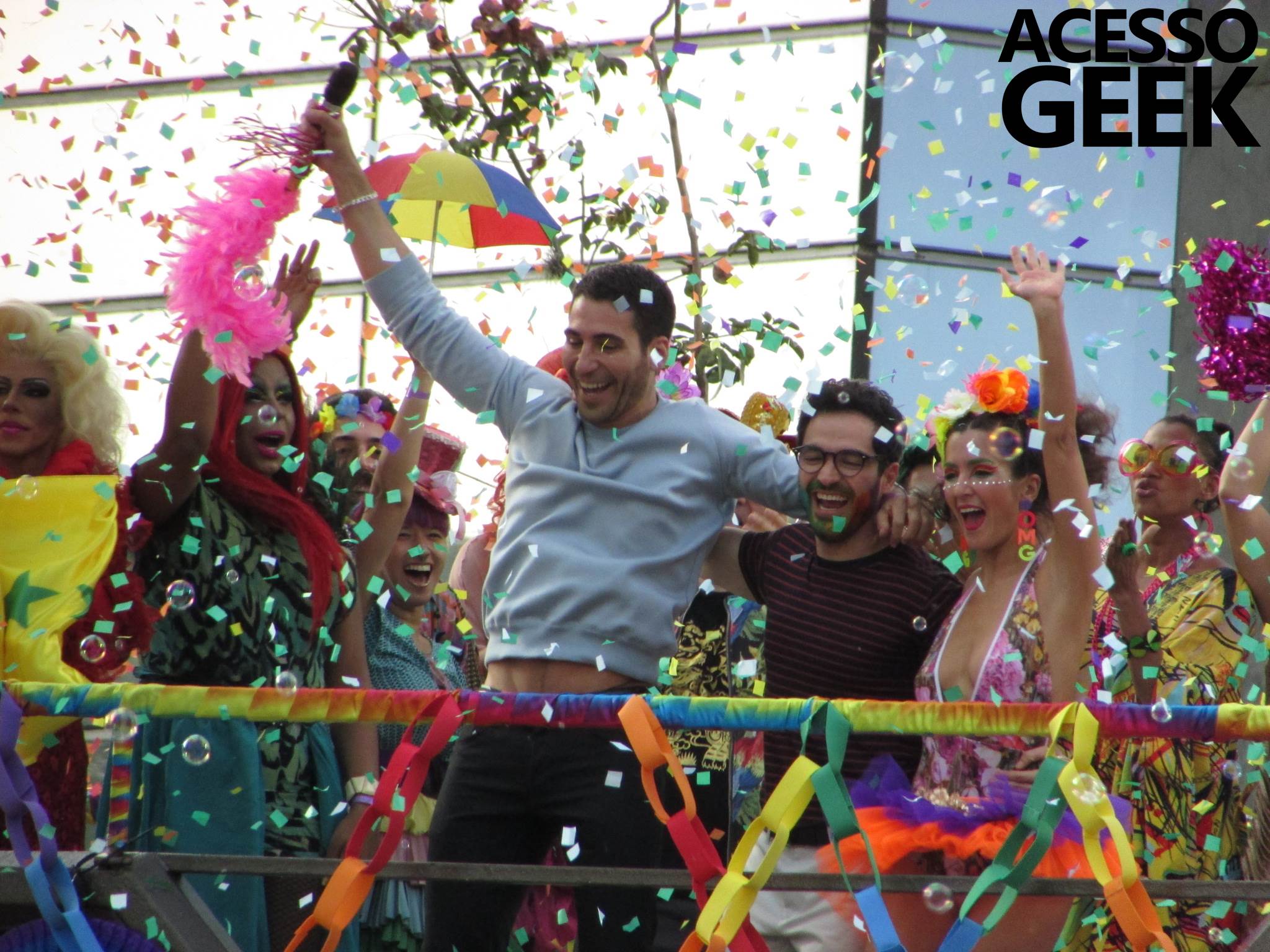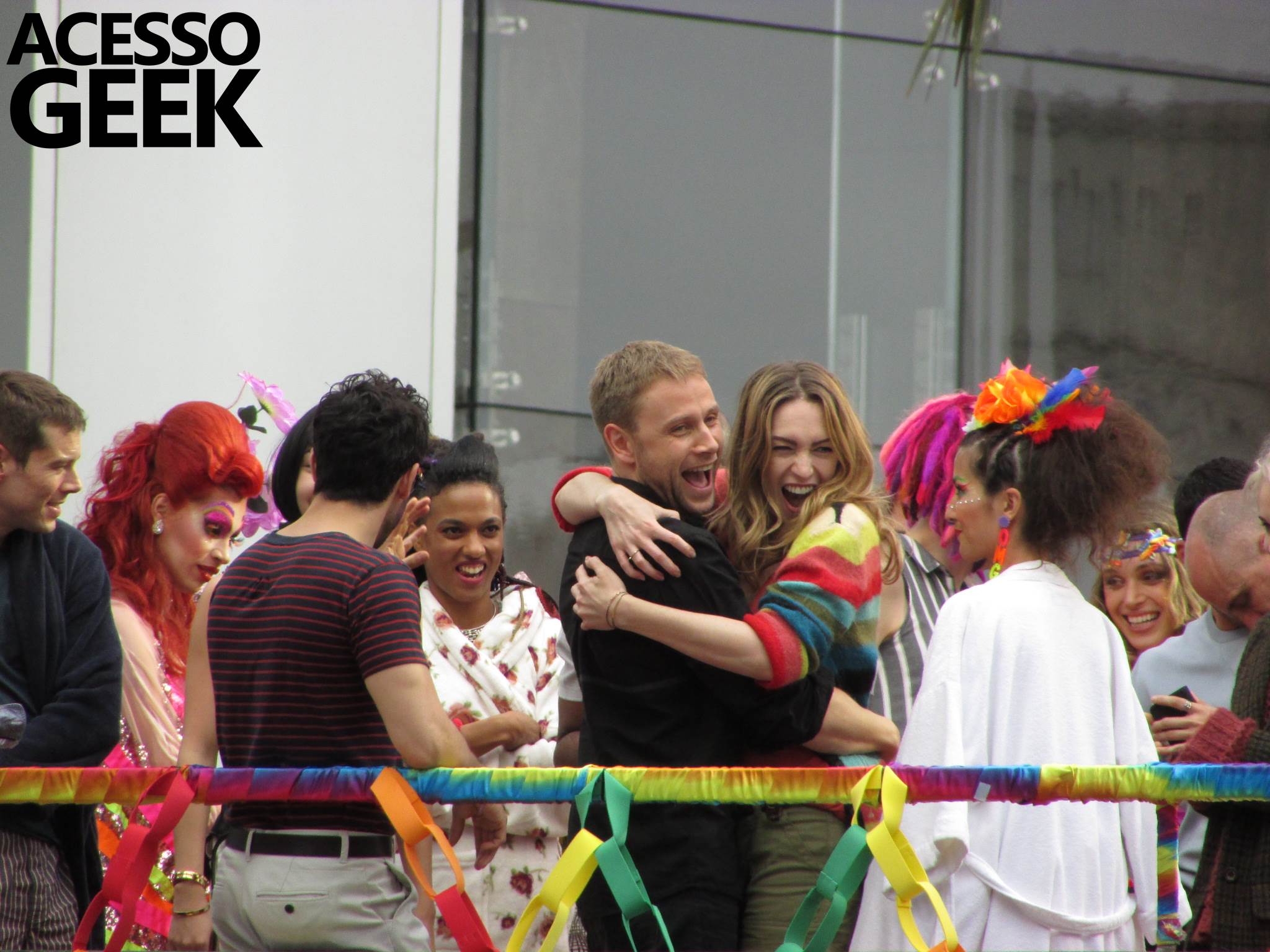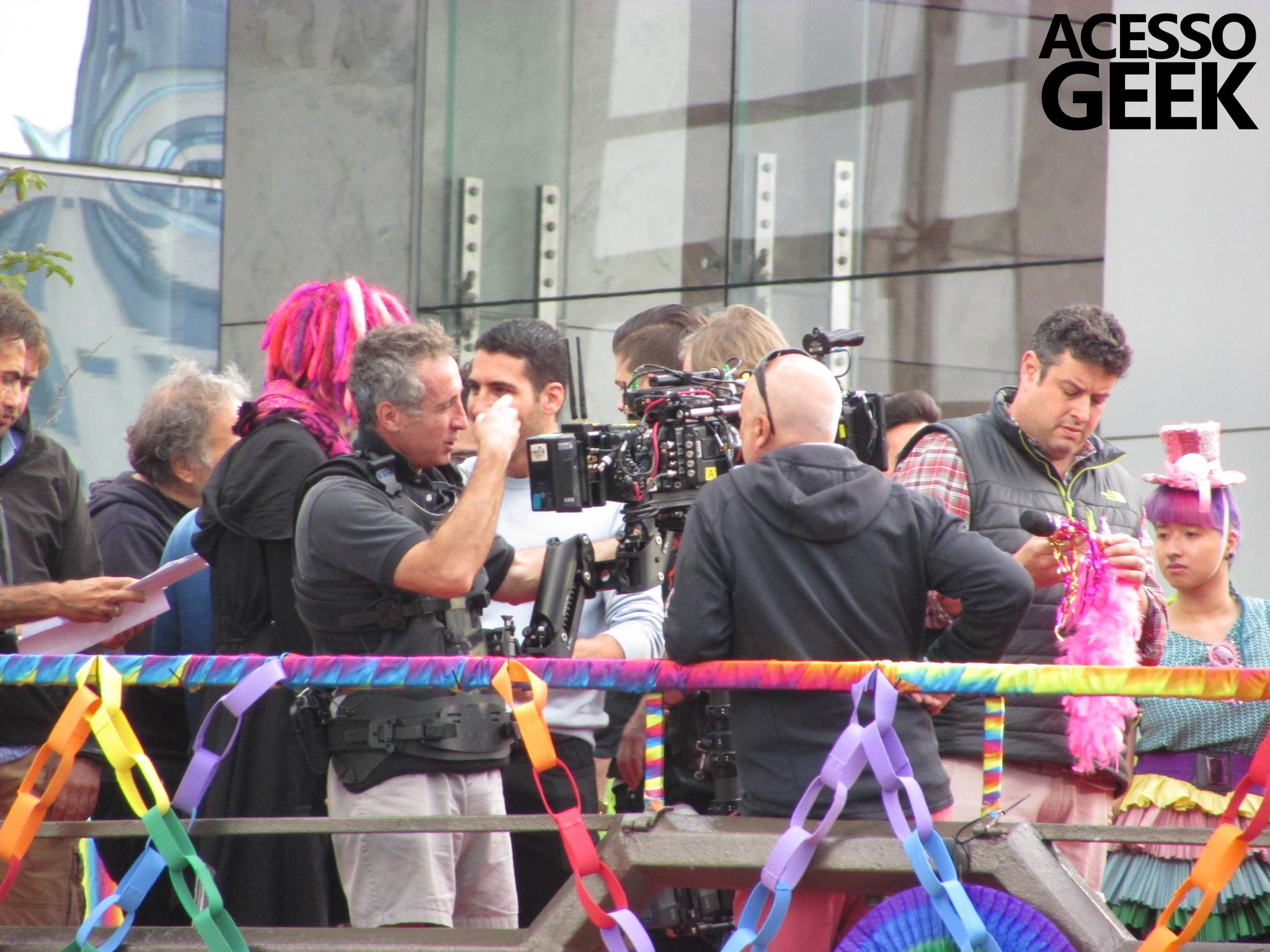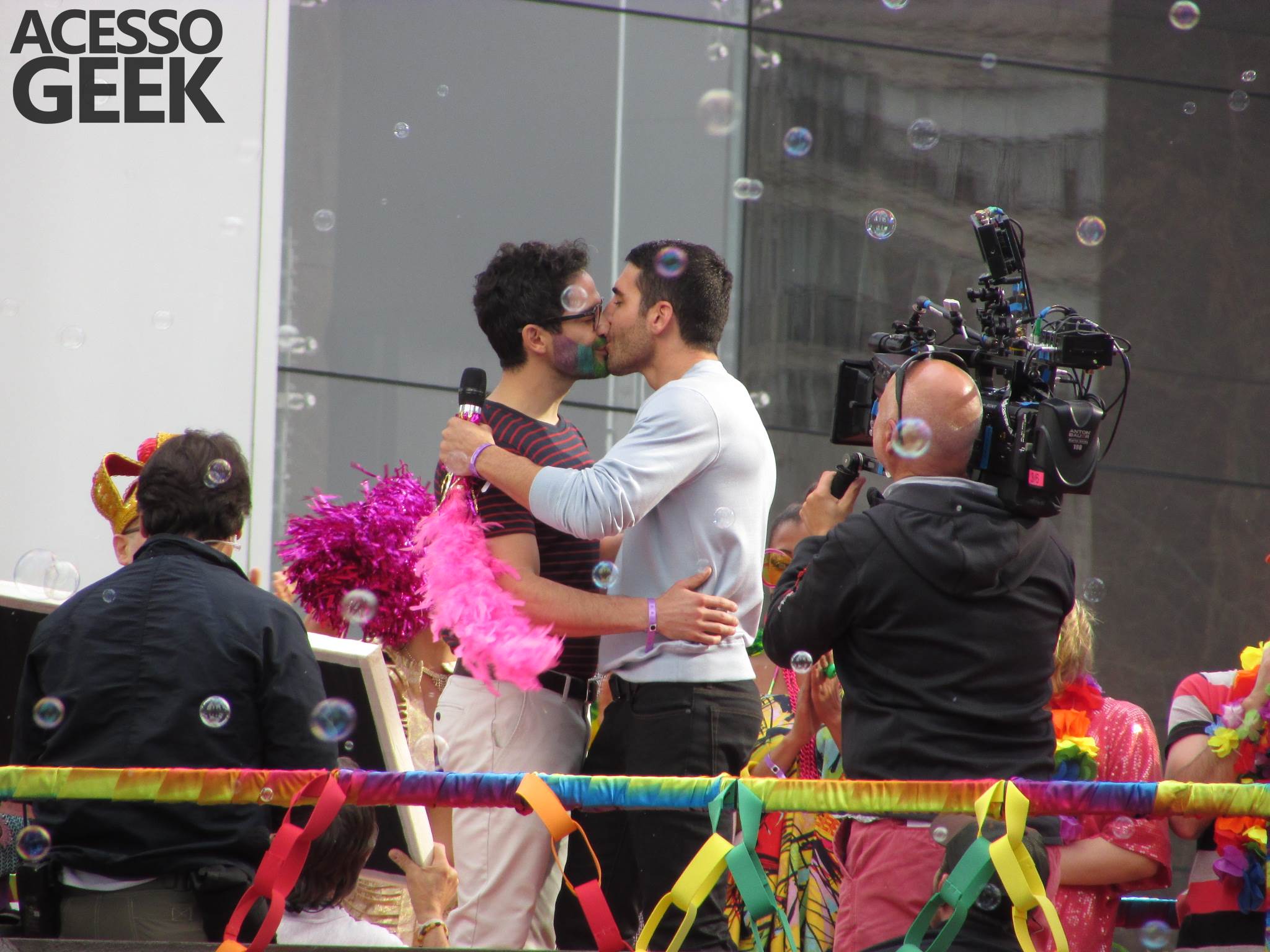 We had the opportunity to follow the recordings that happened last Saturday (28), at Avenida Chucri Zaidan, in São Paulo, more precisely next to the Shopping Morumbi. The producers of the serie, in association with O2 Filmes, mounted a “Trio Elétrico” (Trio Elétrico is the name given to a truck equipped with an extremely high powerful sound system and a musical group or some famous people and music on top of it), it was full of colorful balloons, representing the Gay Pride Parade, that happened on Sunday (28), at Paulista Avenue. Which was also the location of the recordings, as an extension of the recorded scene on Saturday.