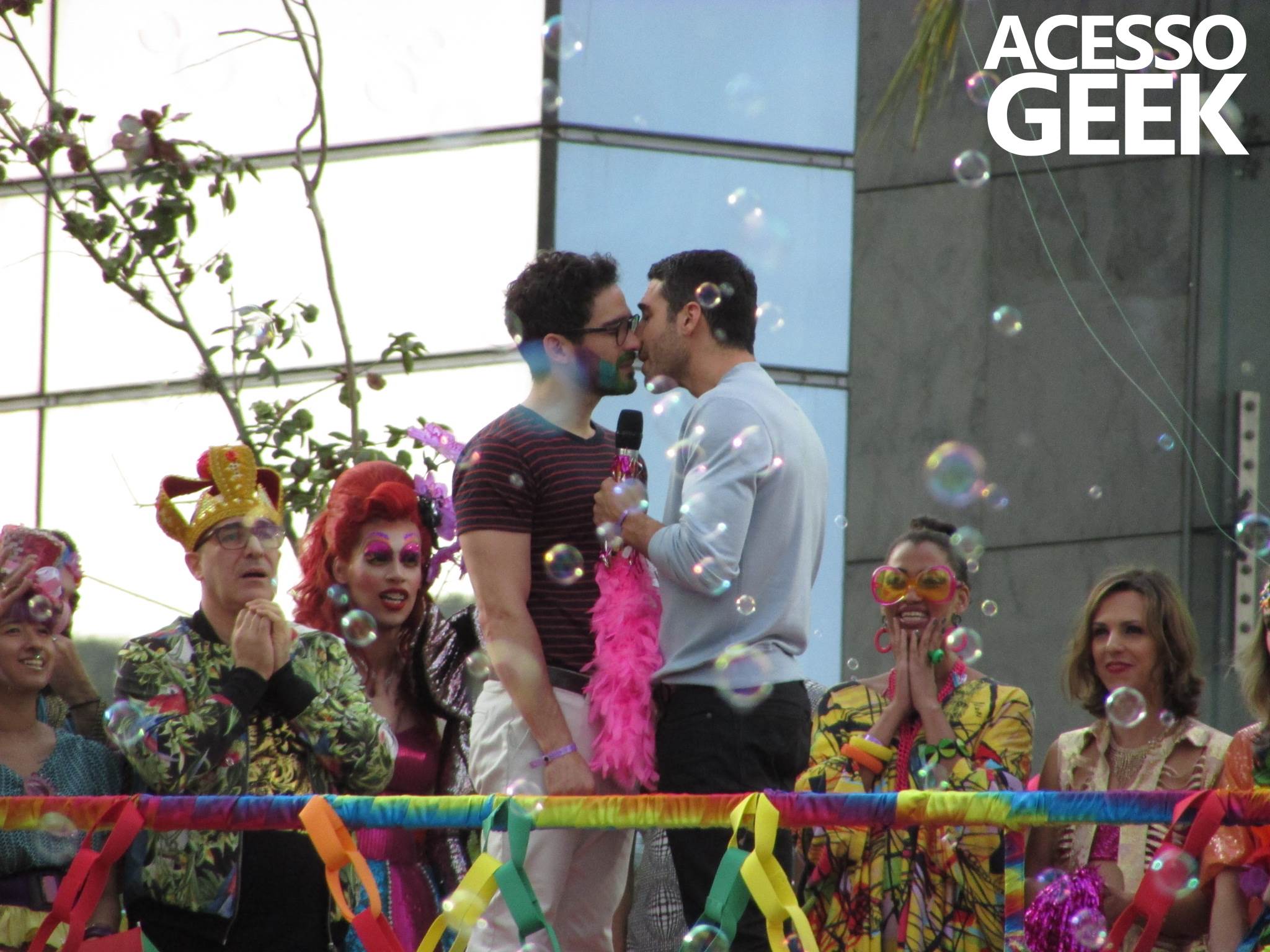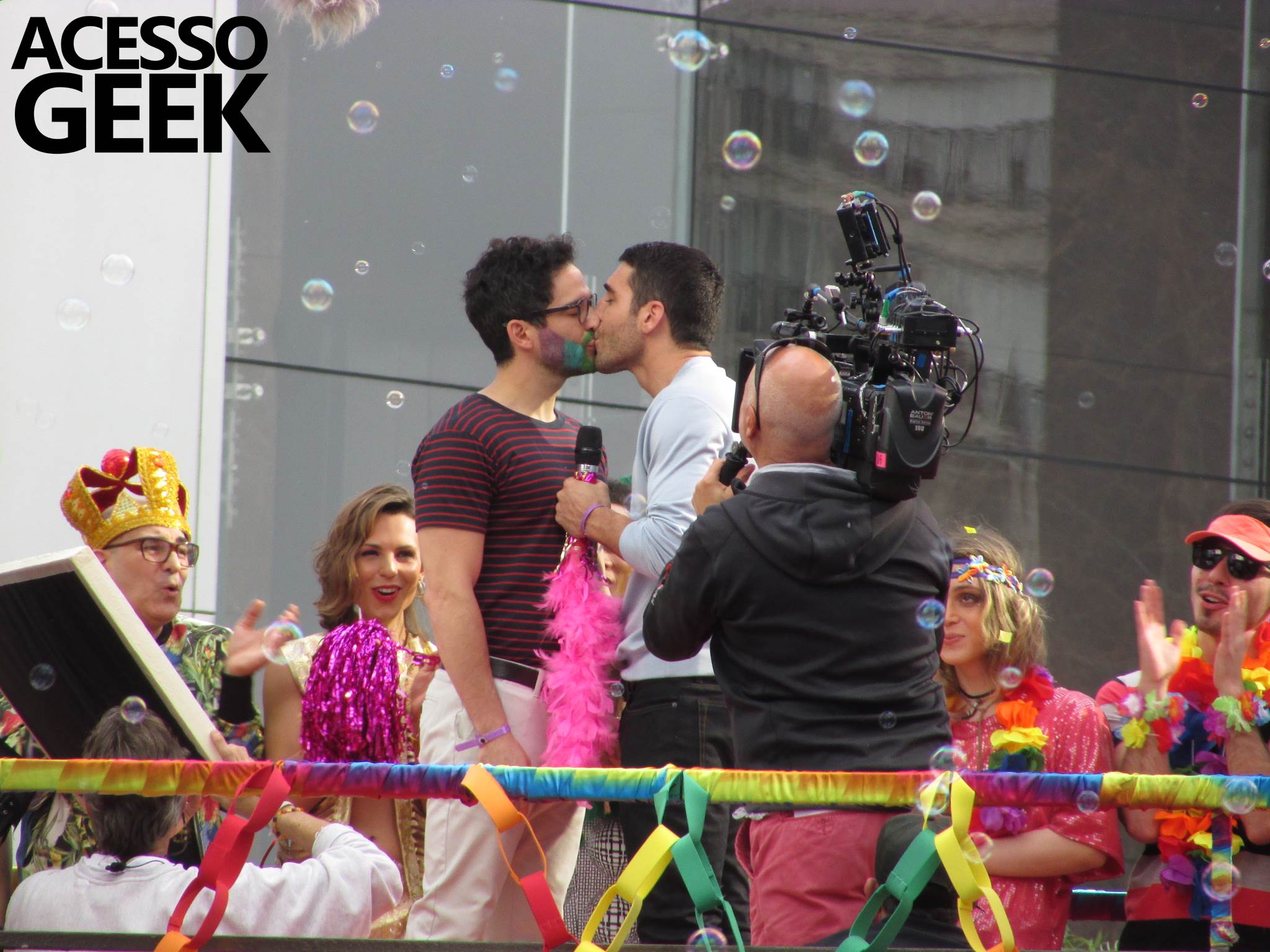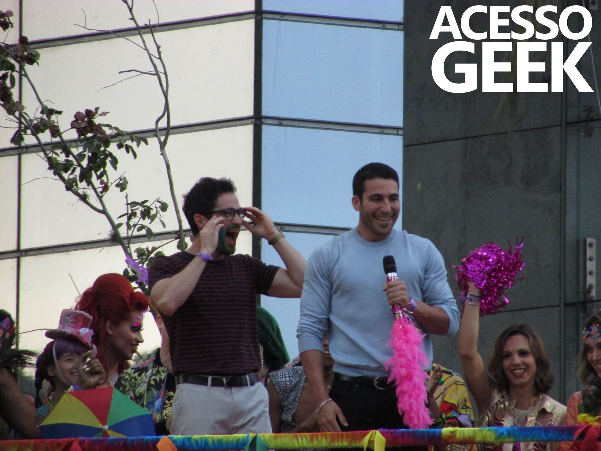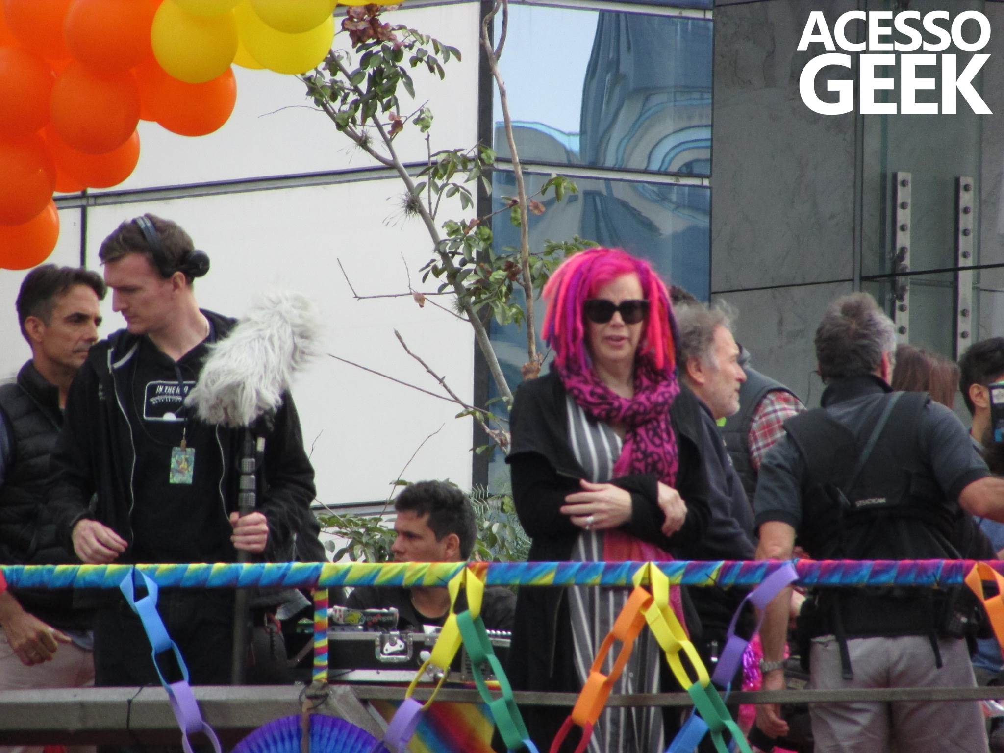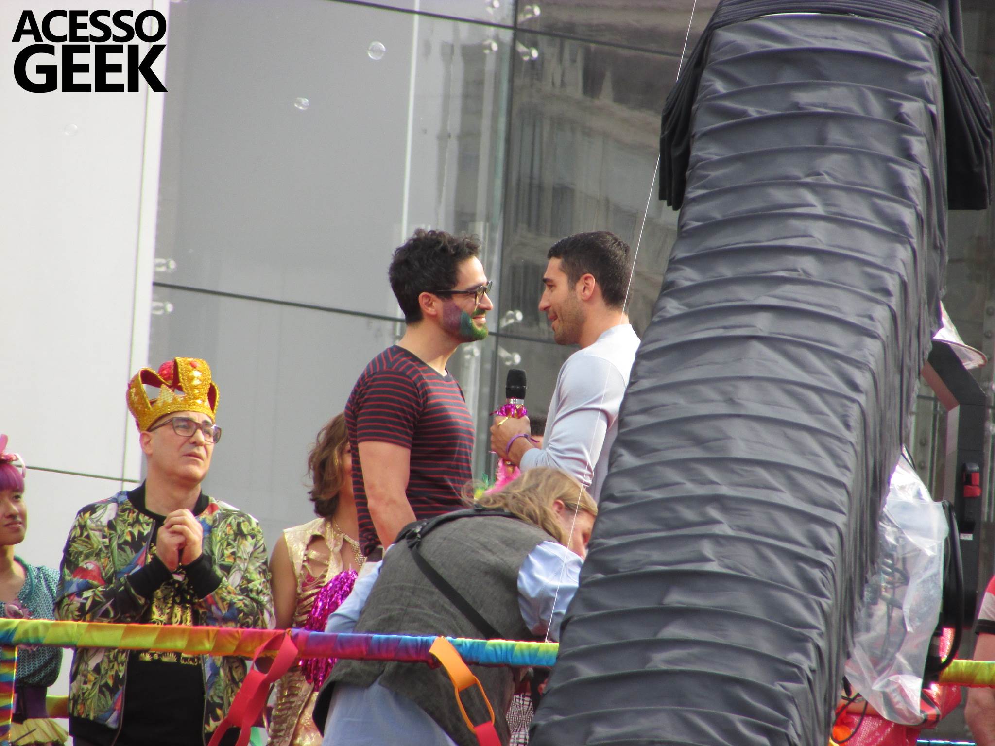 We had the opportunity to follow the recordings that happened last Saturday (28), at Avenida Chucri Zaidan, in São Paulo, more precisely next to the Shopping Morumbi. The producers of the serie, in association with O2 Filmes, mounted a “Trio Elétrico” (Trio Elétrico is the name given to a truck equipped with an extremely high powerful sound system and a musical group or some famous people and music on top of it), it was full of colorful balloons, representing the Gay Pride Parade, that happened on Sunday (28), at Paulista Avenue. Which was also the location of the recordings, as an extension of the recorded scene on Saturday.