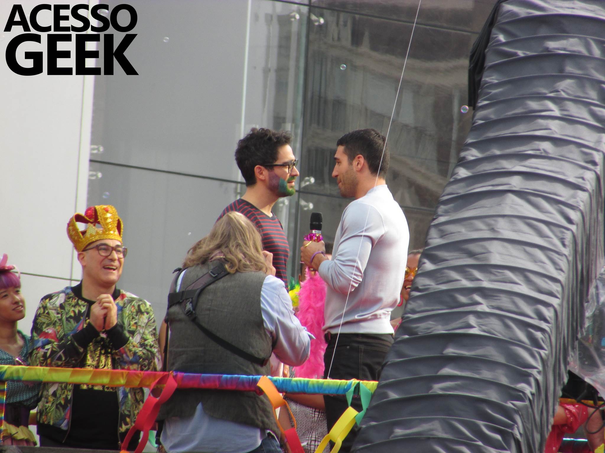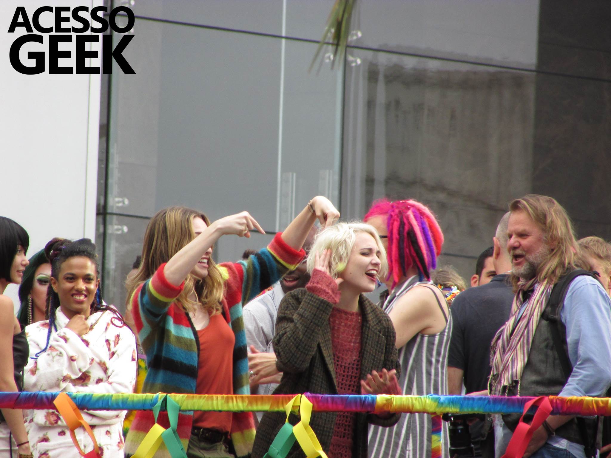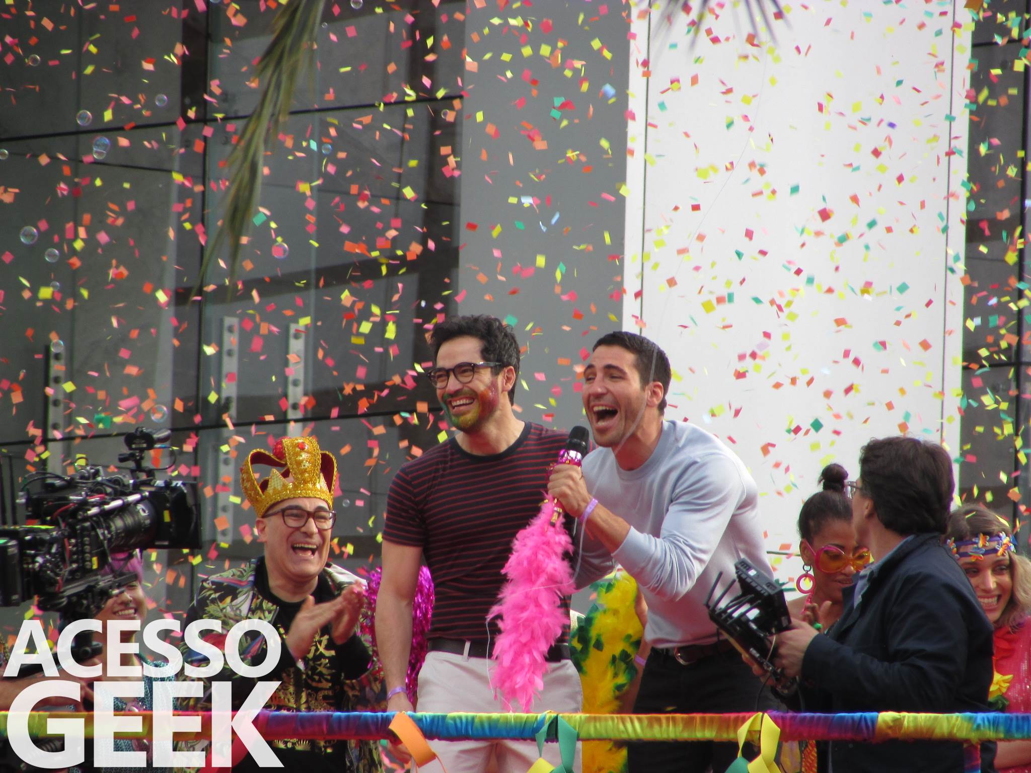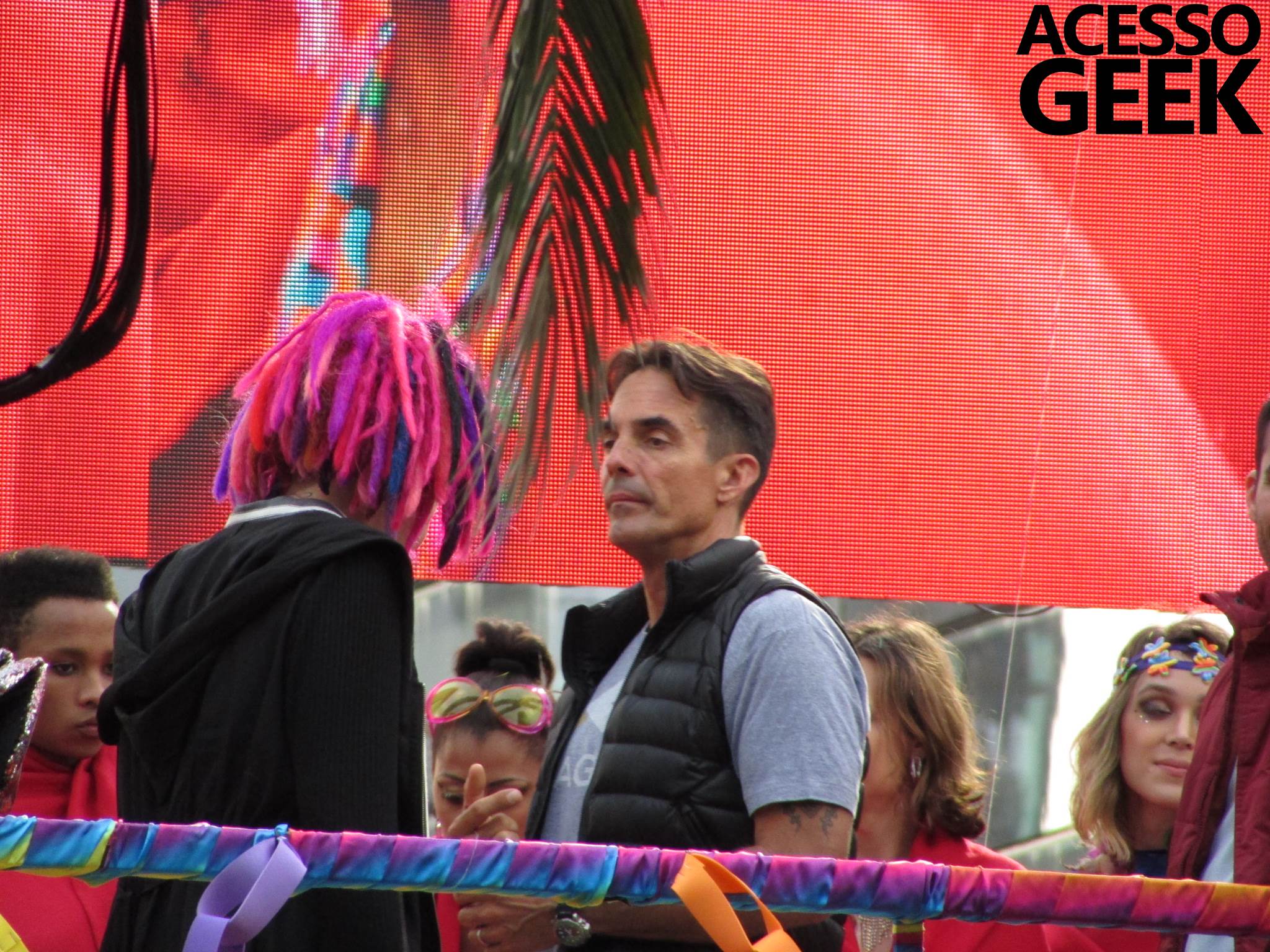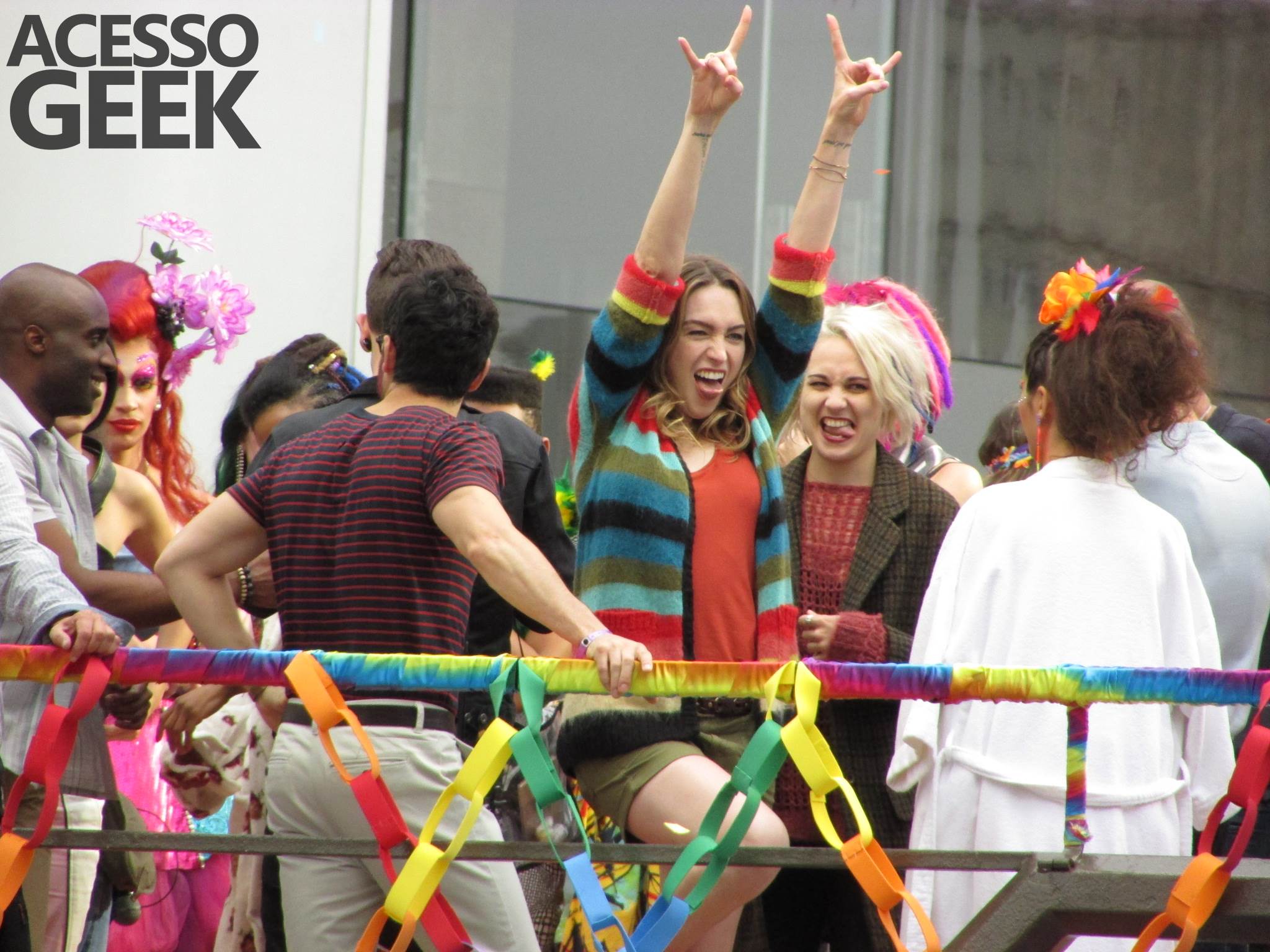 We had the opportunity to follow the recordings that happened last Saturday (28), at Avenida Chucri Zaidan, in São Paulo, more precisely next to the Shopping Morumbi. The producers of the serie, in association with O2 Filmes, mounted a “Trio Elétrico” (Trio Elétrico is the name given to a truck equipped with an extremely high powerful sound system and a musical group or some famous people and music on top of it), it was full of colorful balloons, representing the Gay Pride Parade, that happened on Sunday (28), at Paulista Avenue. Which was also the location of the recordings, as an extension of the recorded scene on Saturday.