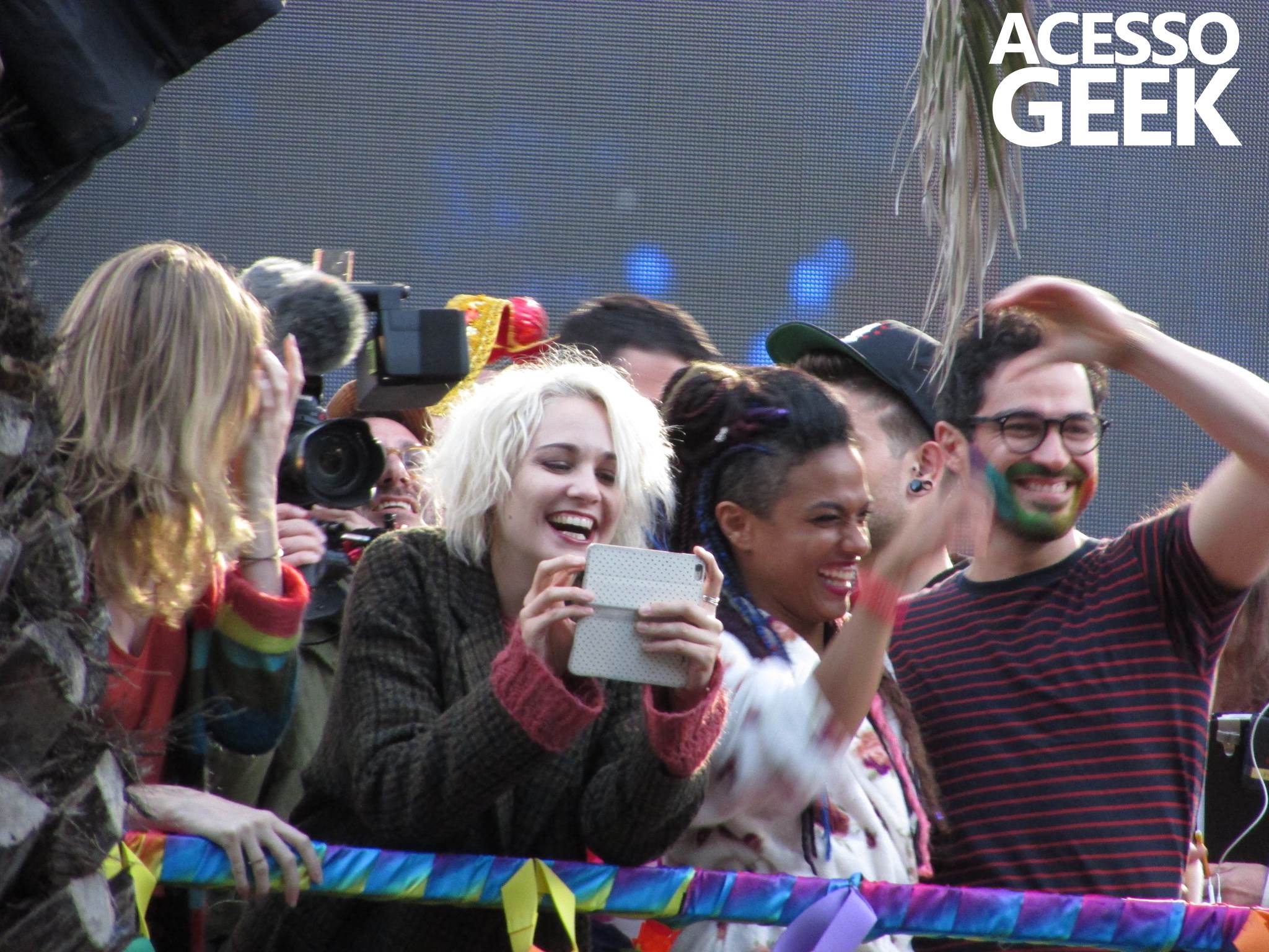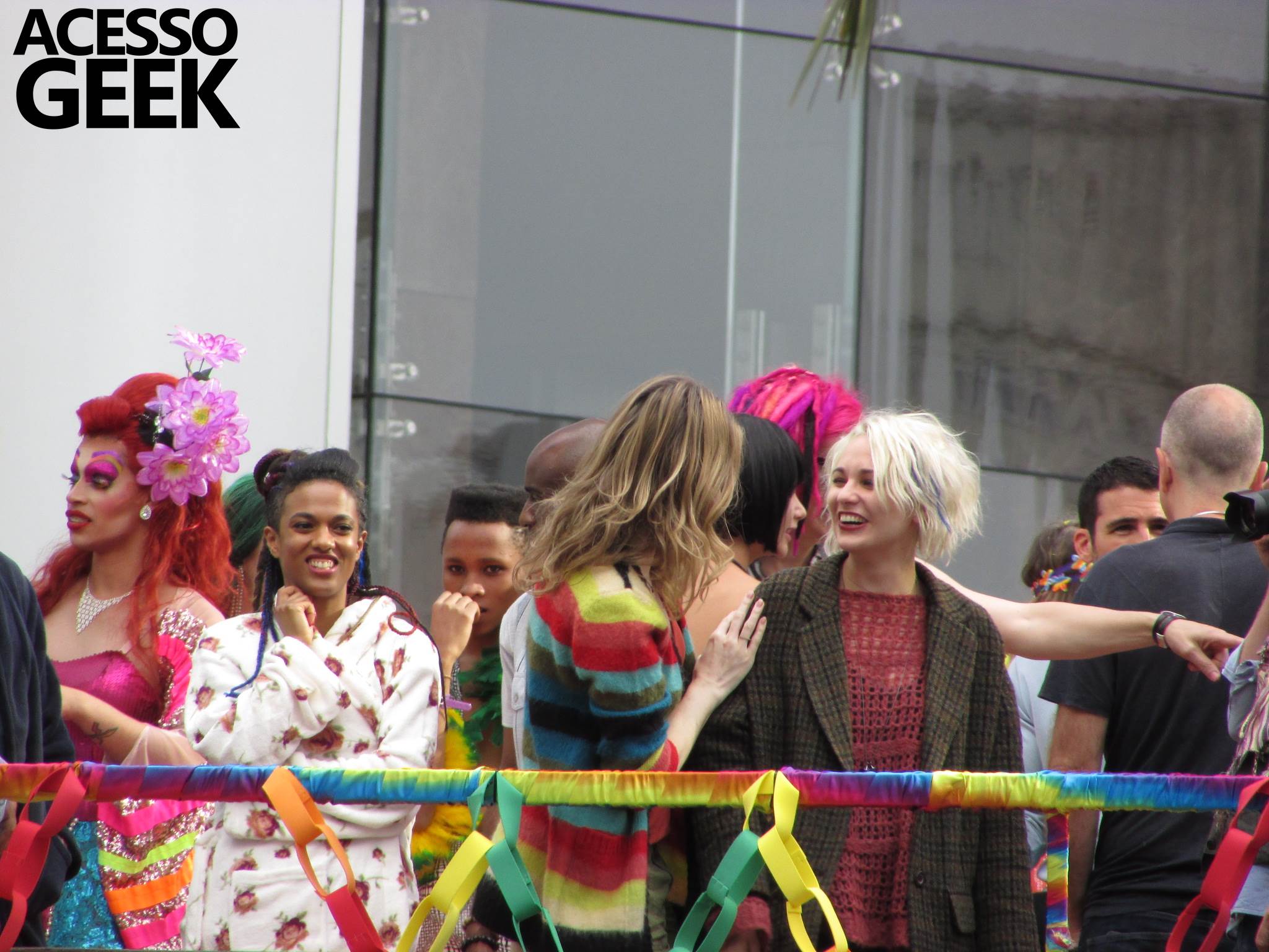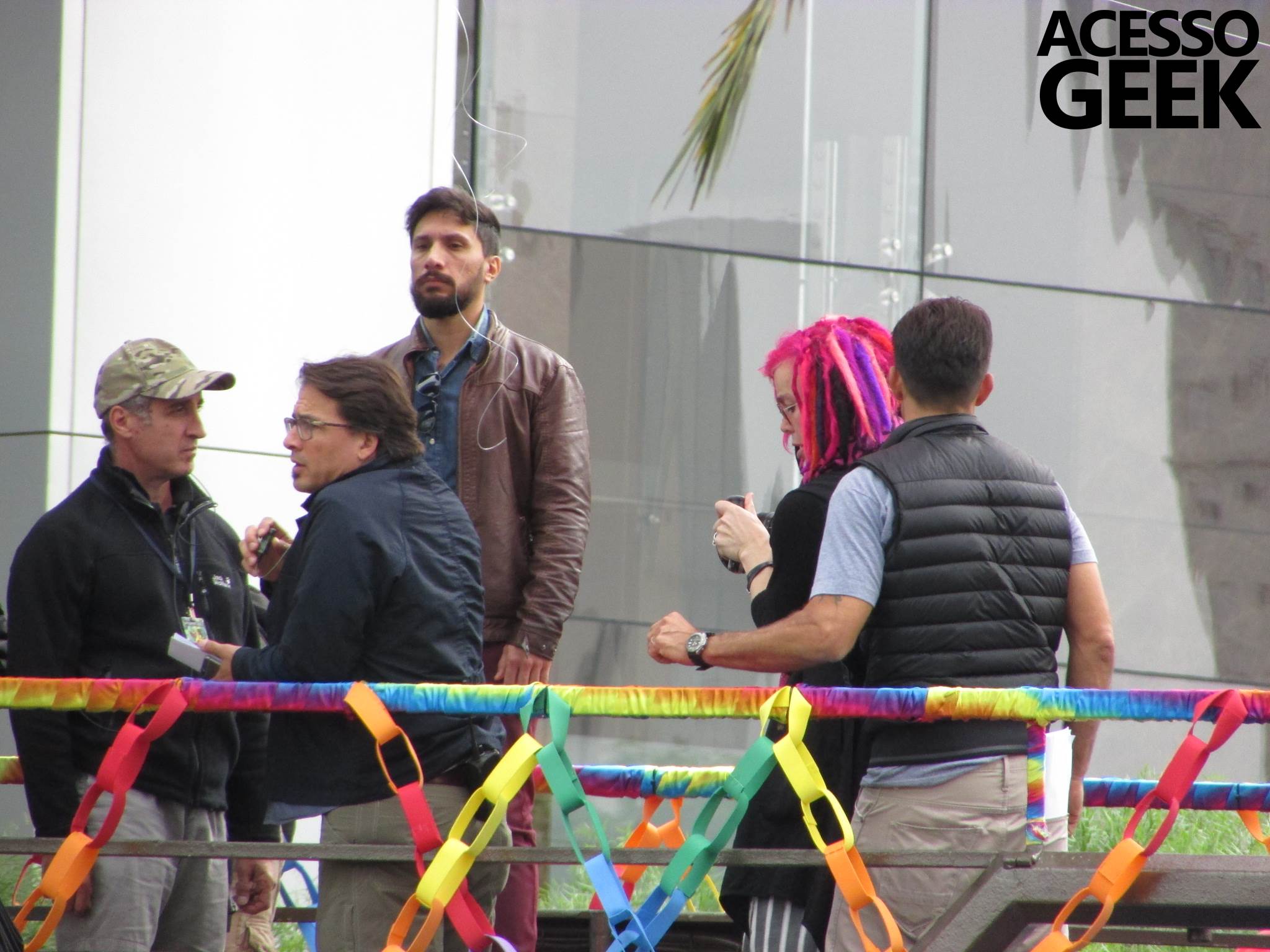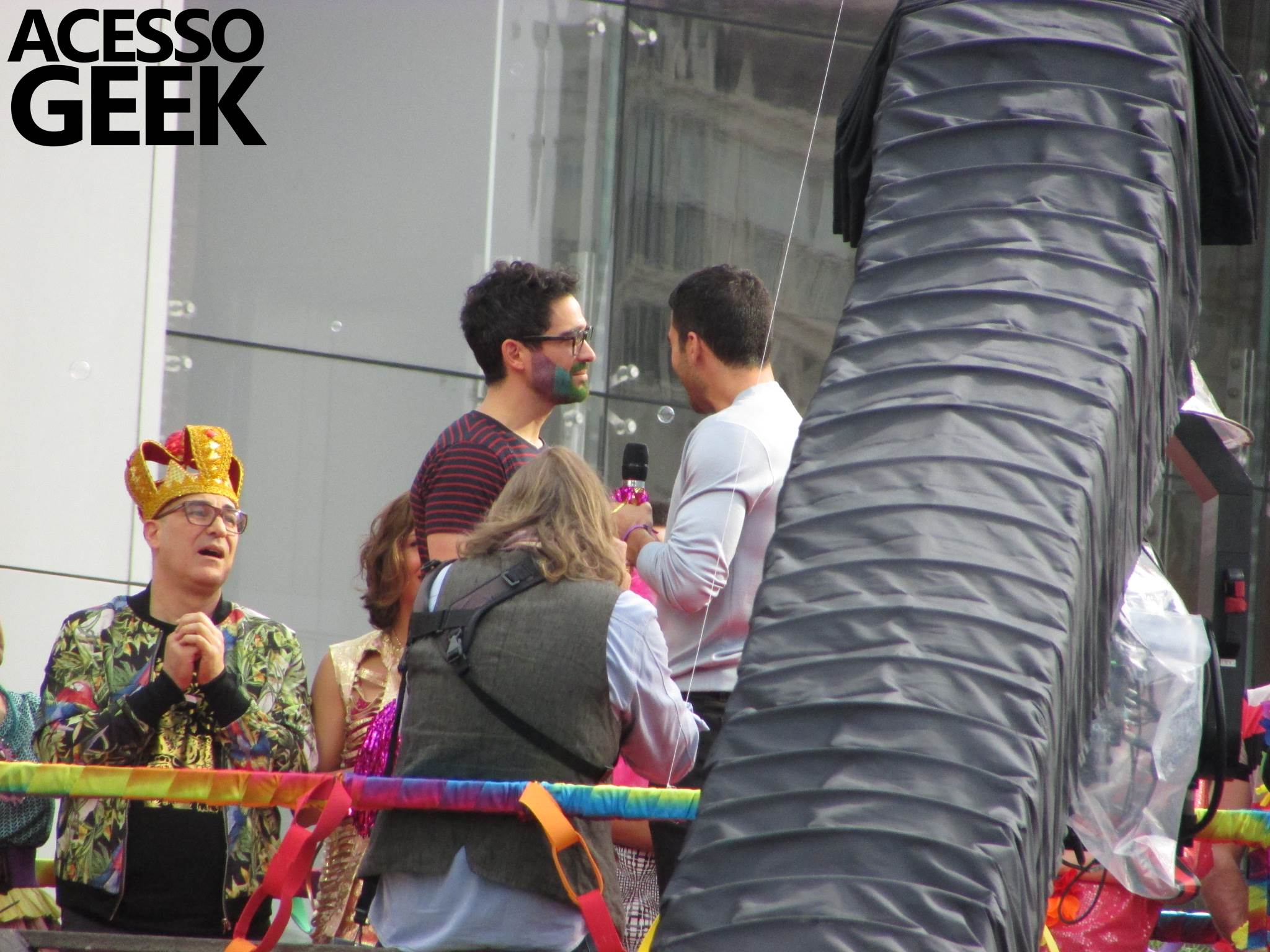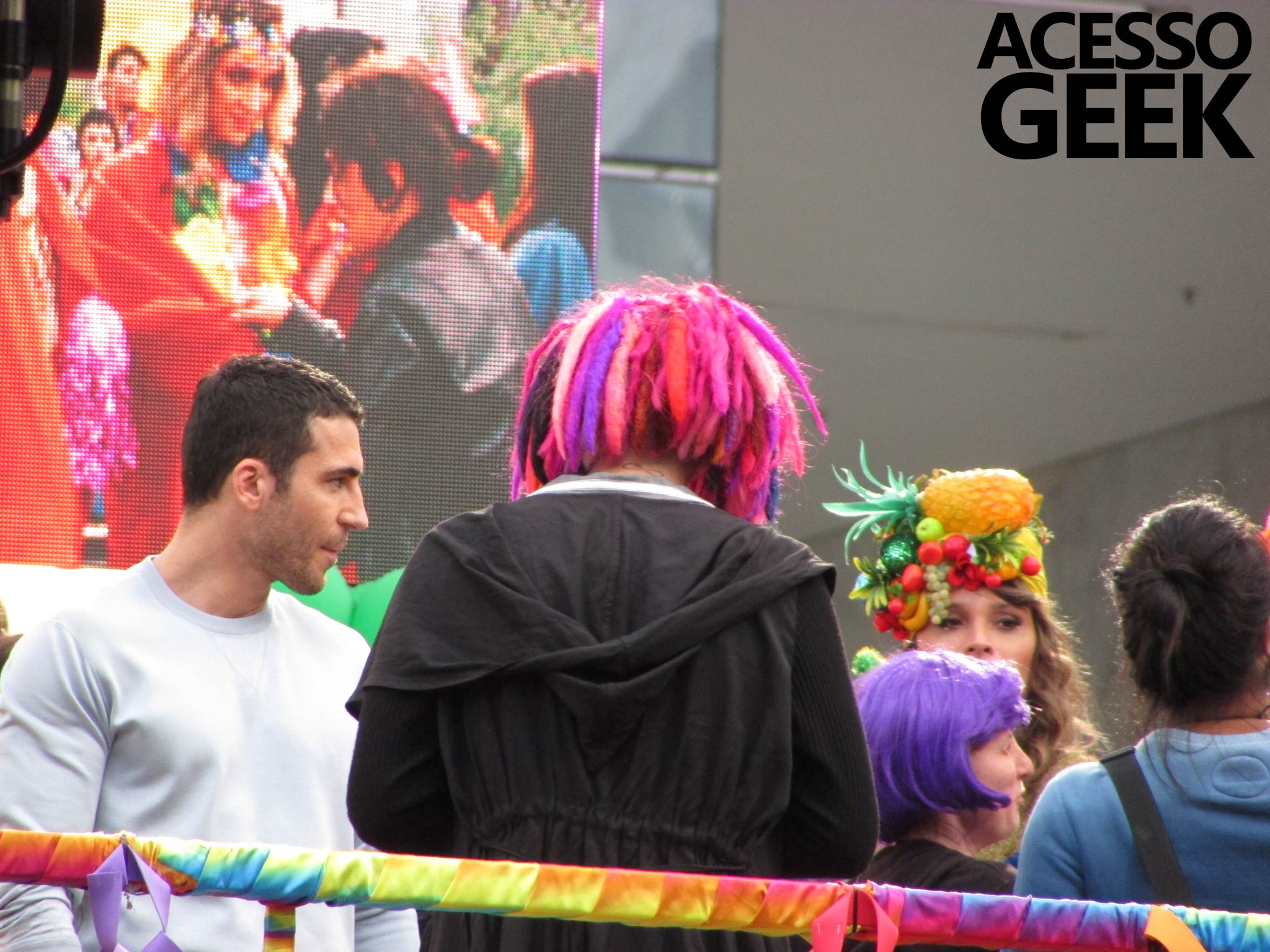 We had the opportunity to follow the recordings that happened last Saturday (28), at Avenida Chucri Zaidan, in São Paulo, more precisely next to the Shopping Morumbi. The producers of the serie, in association with O2 Filmes, mounted a “Trio Elétrico” (Trio Elétrico is the name given to a truck equipped with an extremely high powerful sound system and a musical group or some famous people and music on top of it), it was full of colorful balloons, representing the Gay Pride Parade, that happened on Sunday (28), at Paulista Avenue. Which was also the location of the recordings, as an extension of the recorded scene on Saturday.