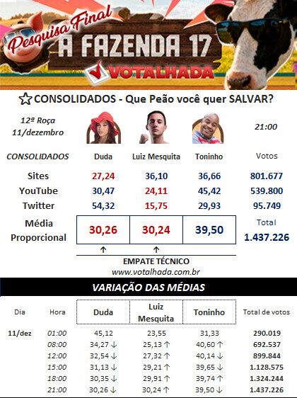Parcial Votalhada 12ª Roça A Fazenda 17 (Atualizado 11/12 às 21:00)