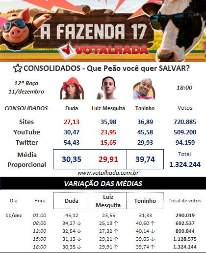 Parcial Votalhada 12ª Roça A Fazenda 17 (Atualizado 11/12 às 18:00)