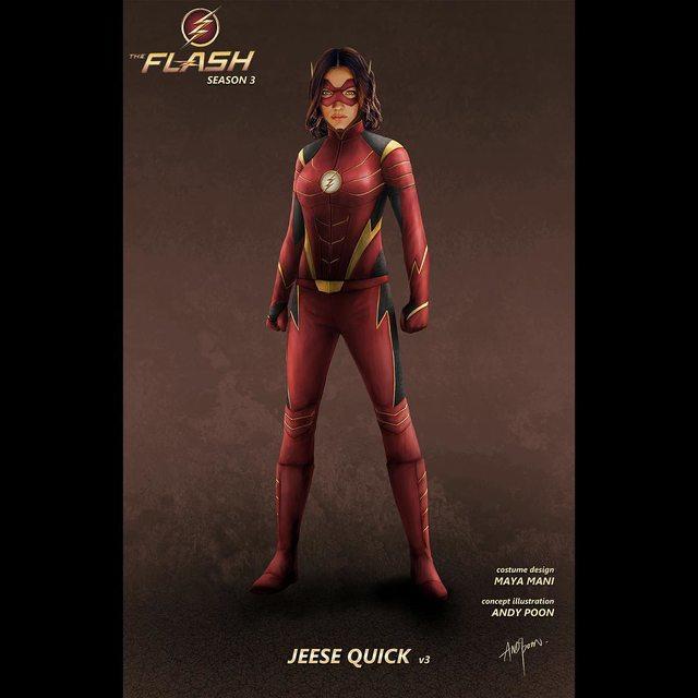 Andy Poon, o principal artista conceitual por trás das séries do CW, divulgou na três designs alternativos para o traje de Jesse Quick.