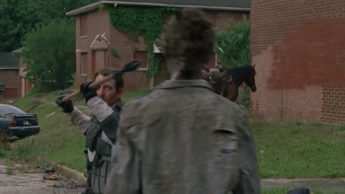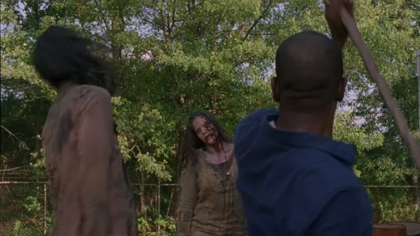 A cena seguinte mostra um zumbi acorrentado, o que acontece muito na onde fica a real base de Negan. O grupo dos Salvadores fazem isso para usar como proteção.