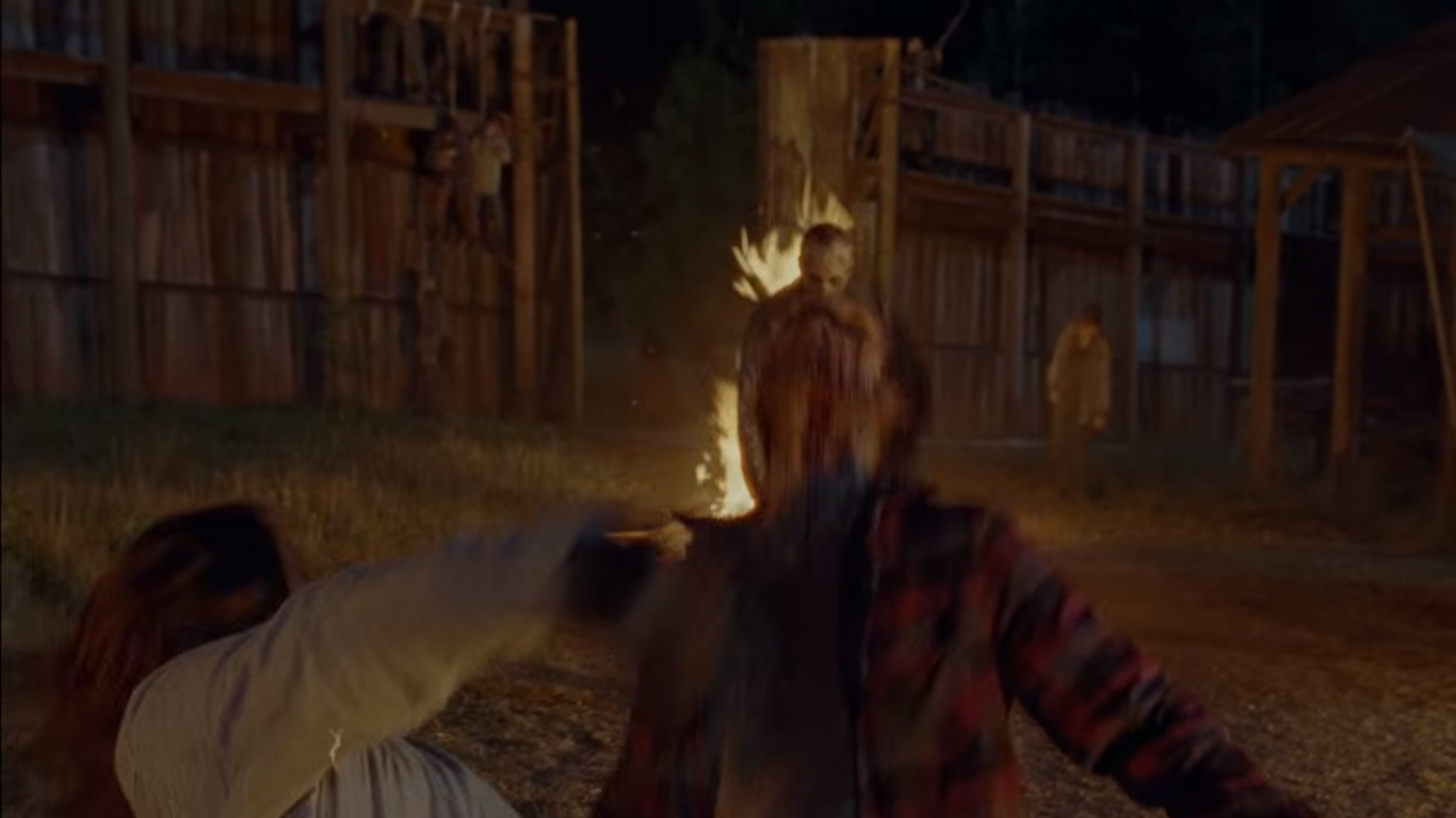 *Nas HQs, Negan queima parte do rosto de Dwight por ter tentado fugir com uma de suas esposas. Ele é o braço direito do chefe dos Salvadores.