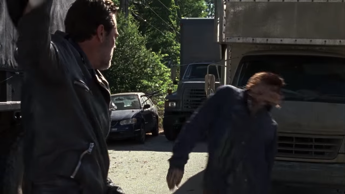 Negan aparece novamente em seguida. Dessa vez parece estar voltando de algum lugar para sua base e alguns membros dos salvadores, incluindo Dwight, se ajoelham. Parece que Negan é tratado como um deus/rei e todos o reverenciam. E ele está caminhando com Lucille apoiada nas costas.
