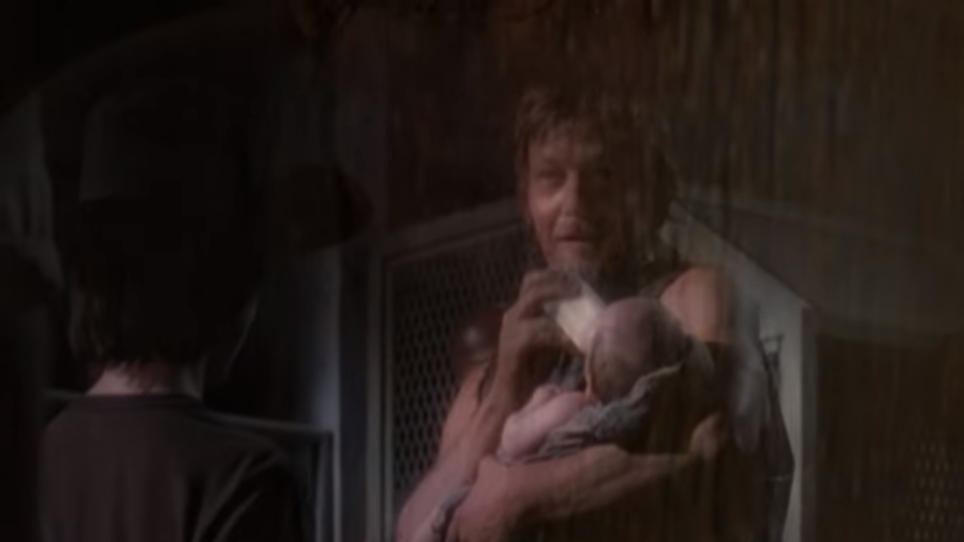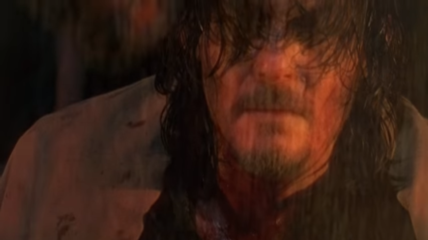 Dwight aparece com metade de seu rosto queimado, olhando para o alto. Ele está com a moto de Daryl (Norman Reedus).