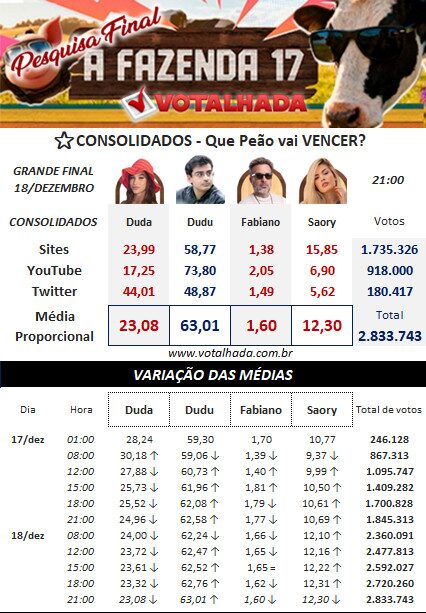 Parcial Votalhada Quem vai vencer A Fazenda 17 (Atualizado 18/12 às 21:00)