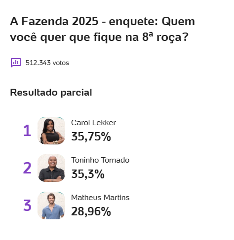A decisão está nas mãos do público e a 8ª roça de A Fazenda 17 promete uma das eliminações mais acirradas da temporada! Carolina Lekker, Toninho Tornado e Matheus Martins disputam voto a voto a preferência dos fãs, e as últimas parciais das principais enquetes já apontam quem deve continuar na disputa pelo prêmio milionário.