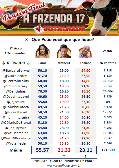 Parcial Enquete UOL A Fazenda 17 8ª Roça (Atualizado 13/11 às 22:20)