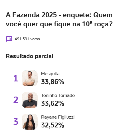 Em contrapartida, a média proporcional do Votalhada continua desenhando um panorama diferente. Nesta apuração, que soma votos de sites e redes sociais, Toninho Tornado segue isolado como o provável eliminado, com uma desvantagem considerável em relação a Rayane e Mesquita. Essa divergência brutal entre as fontes de pesquisa aumenta o suspense para o programa ao vivo.