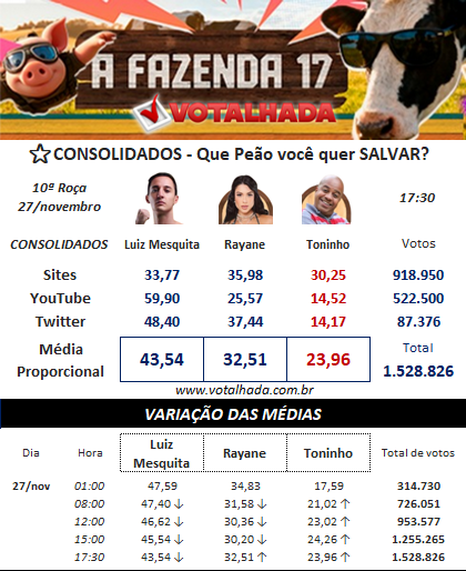 Parcial Votalhada 10ª Roça A Fazenda 17 (Atualizado 27/11 às 17:30)