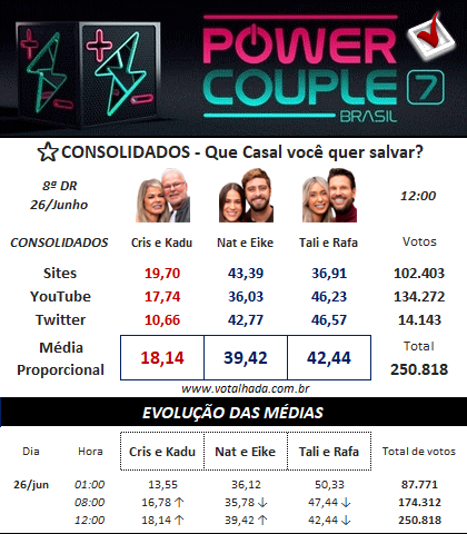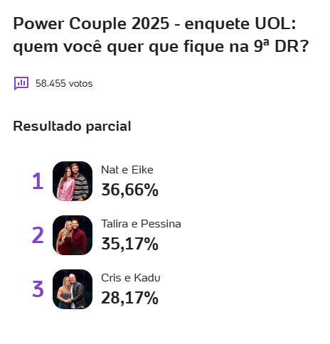A Enquete UOL e Votalhada Power Couple está movimentando a oitava D.R. do Power Couple Brasil 7, e as novas parciais já foram divulgadas. Com Nat e Eike, Talira e Pessina, e Cris e Kadu lutando pela preferência do público, a tensão só aumenta!