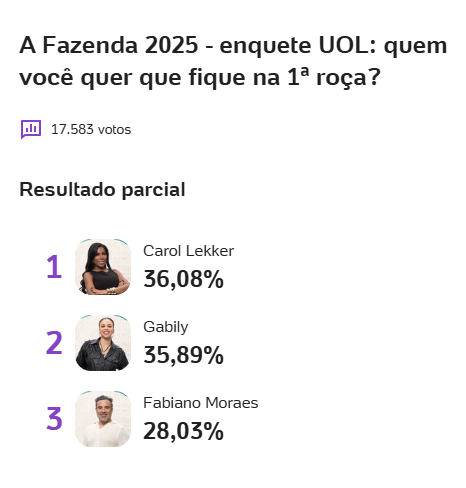 Enquete da 1ª Roça de A Fazenda 17 UOL e Votalhada mostra disputa acirrada e virada emocionante na preferência do público.