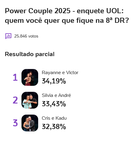 Continue acompanhando para as próximas atualizações das enquetes Power Couple UOL e Votalhada e para ver como a 8ª D.R. se desenrola ao longo dos próximos dias.