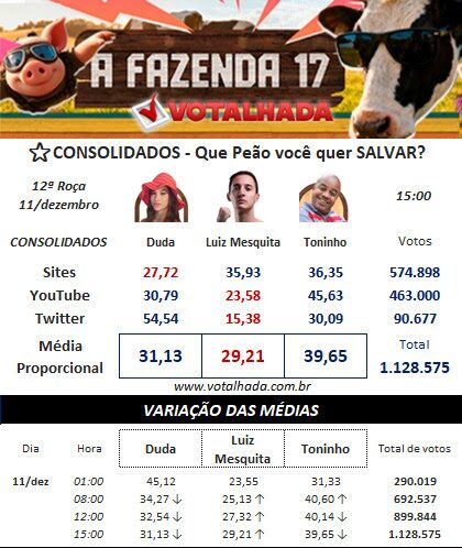 Parcial Votalhada 12ª Roça A Fazenda 17 (Atualizado 11/12 às 15:00)